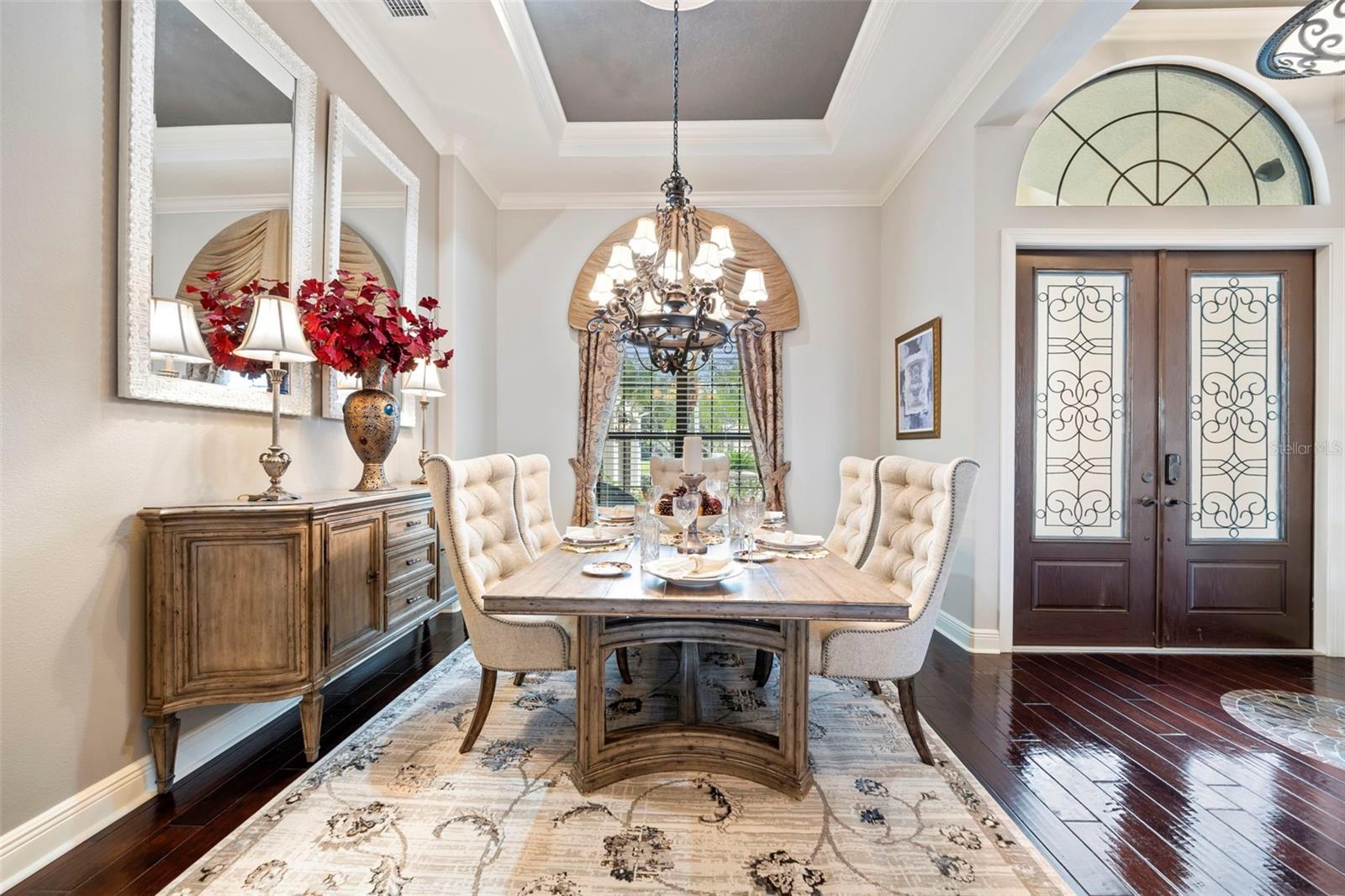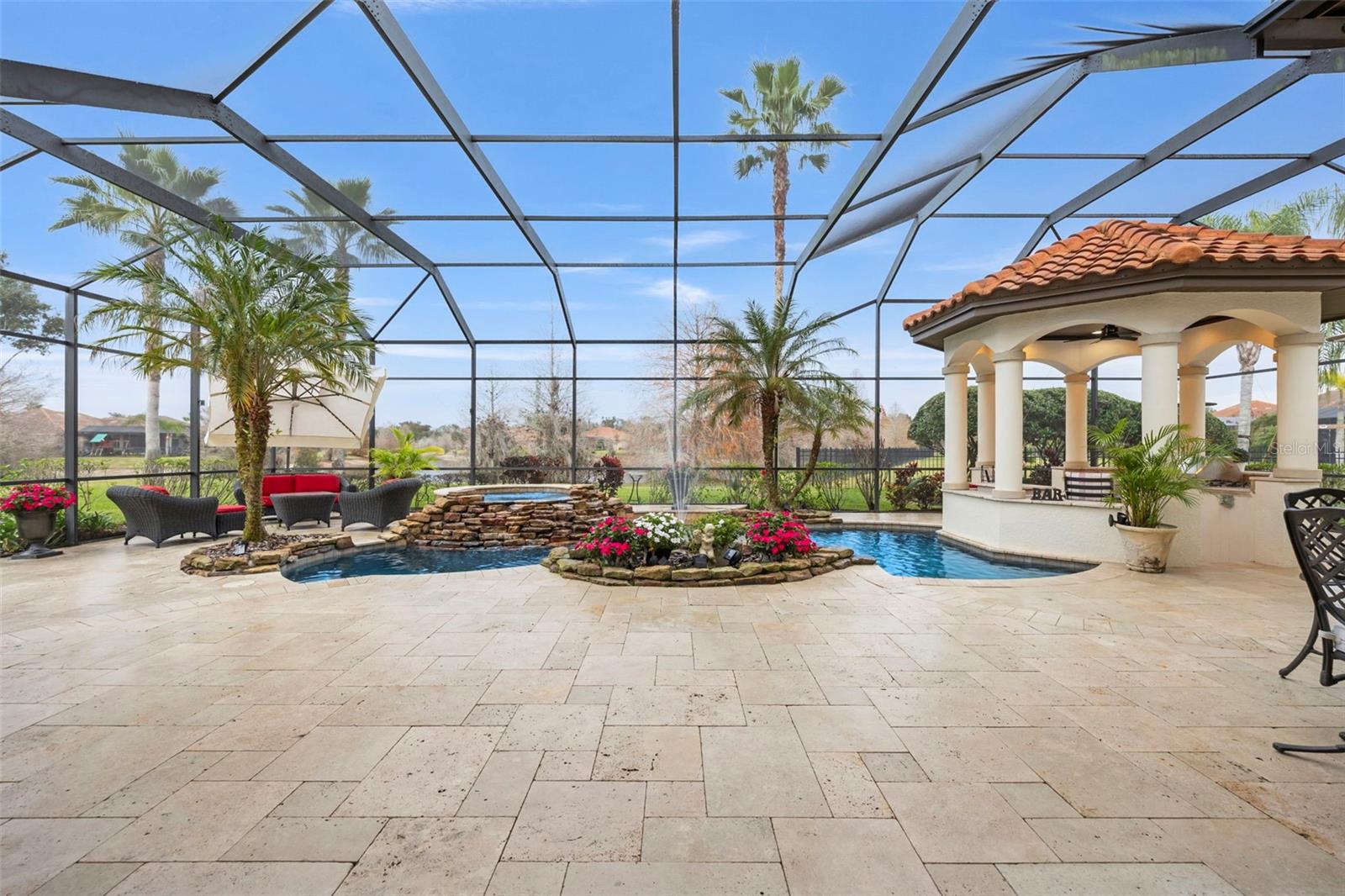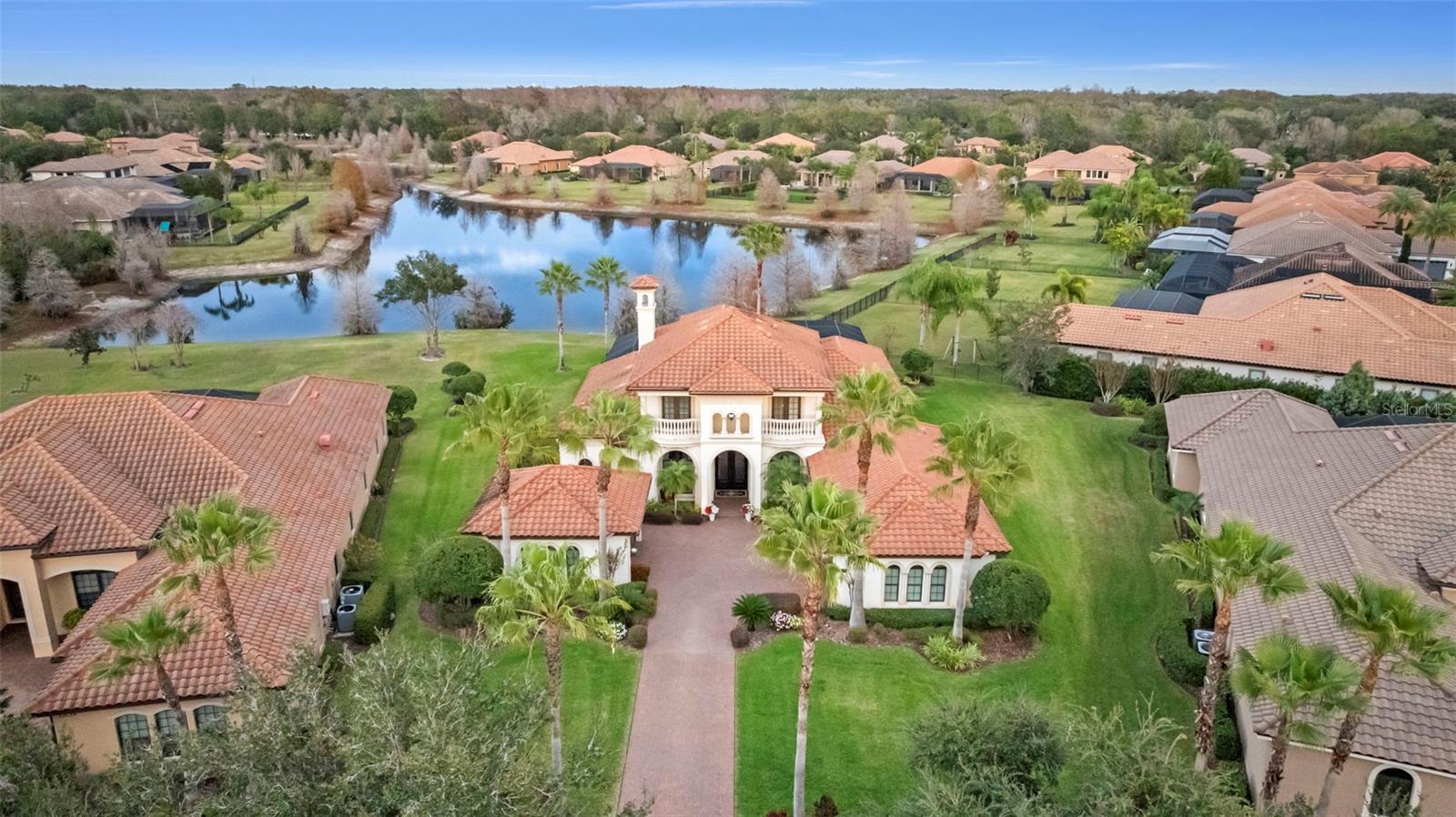 Welcome to 1207 Merry Water Drive, an exceptional Arthur Rutenberg–built estate located in the highly coveted Ladera neighborhood. One of only four Arthur Rutenberg homes in the community—and the only 5-car garage home in Ladera—this residence was proudly featured on the cover of Legendary Homes. Set on a premier large lake lot with low HOA fees and zoned for Steinbrenner High School, this property offers a rare blend of luxury, technology, and thoughtful design. From the moment you arrive, you’ll be impressed by over 2,000 square feet of newly sealed entry pavers (2025), extensive mature landscaping with irrigation and drip systems, dramatic landscape lighting, and nine mature Washingtonian palm trees creating stunning curb appeal—especially at night. Hurricane-impact windows throughout provide peace of mind with no shutters required. Inside, the home is fully integrated with a Control4 smart home system, allowing lighting, audio, security cameras, TVs, climate control, and more to be managed seamlessly from your phone. The gourmet kitchen features custom cabinetry, South African granite, GE Profile gas appliances (all under three years old), reverse-osmosis water, wine bar with refrigerator, and built-in security monitoring. Adjacent living and family spaces showcase custom ceiling details, wood beams, marble gas fireplace, expansive sliding doors, surround sound, and designer drapery—perfect for both entertaining and everyday living. The spacious primary suite offers private pool access, walk-in closets with custom built-ins, Control4 surround sound, and a spa-like bath with oversized dual-head shower. Additional bedrooms include private baths and balconies, while the upstairs family room opens to an outdoor balcony with surround sound and lake views. Outdoor living is exceptional with a full screened pool enclosure, travertine pavers, illuminated pool and spa with dual motors and fountain feature, and a custom gazebo complete with a 2025 built-in grill, cooktop, refrigerator, and TV. Whether hosting gatherings or relaxing lakeside, this space is designed to impress. Additional highlights include three separate AC units (primary unit just six months old), Vivint security system, hurricane protection, dedicated study, smart laundry room with Control4 rack system, and two garages totaling five parking spaces—one with EV-ready high-amp outlet, custom cabinetry, work area, and advanced lighting and irrigation controls. This is a truly rare opportunity to own a technologically advanced, meticulously maintained luxury home in one of the area’s most desirable communities. Schedule your private showing today.