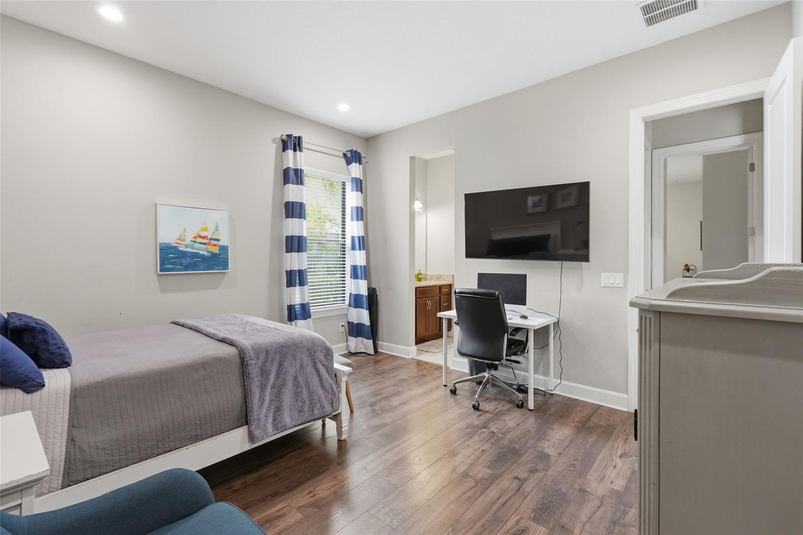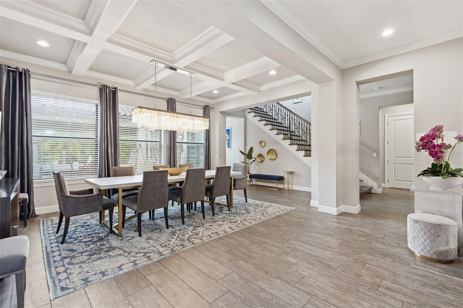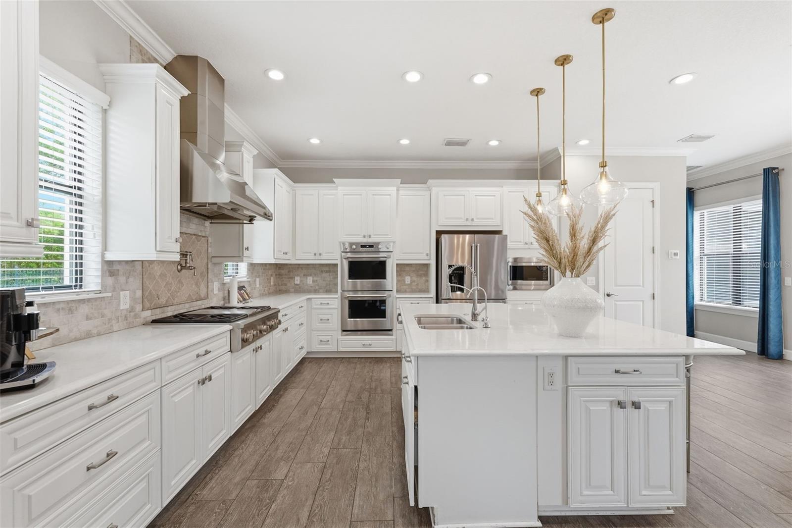 Welcome to Luxury Living at its finest, featuring elegant design and exceptional upgrades throughout. Enter through the charming courtyard where you’ll find a private one-bedroom, one-bath guest suite with its own entrance, complete with a mini kitchen including a cooktop, microwave, and refrigerator—perfect for guests or extended family. Inside the main home, a grand foyer and formal dining room with architectural ceiling details set the tone. A dramatic staircase with ironwork and cherry-stained risers adds a stunning focal point. The luxurious primary suite offers a private sitting area and spa-like bath with a jetted soaking tub and rain shower, while overlooking the beautiful pool. Two additional bedrooms share a convenient Jack-and-Jill bath. The chef’s kitchen, designed for entertaining, features a gas cooktop with griddle, double convection ovens, pot filler, large pantry, and striking quartz countertops, opening to the spacious family room and outdoor courtyard kitchen. Step outside to your private backyard oasis, complete with a saltwater pool and fully equipped cabana with wet bar, outdoor kitchen, refrigerator, and pool bath. Upstairs includes an additional en-suite bedroom, open loft, and media room with a mini kitchen. This magnificent home blends luxury, comfort, and resort-style living—truly a must-see.