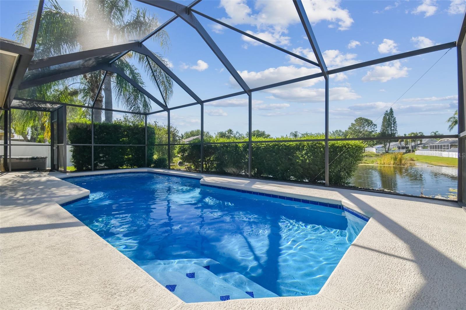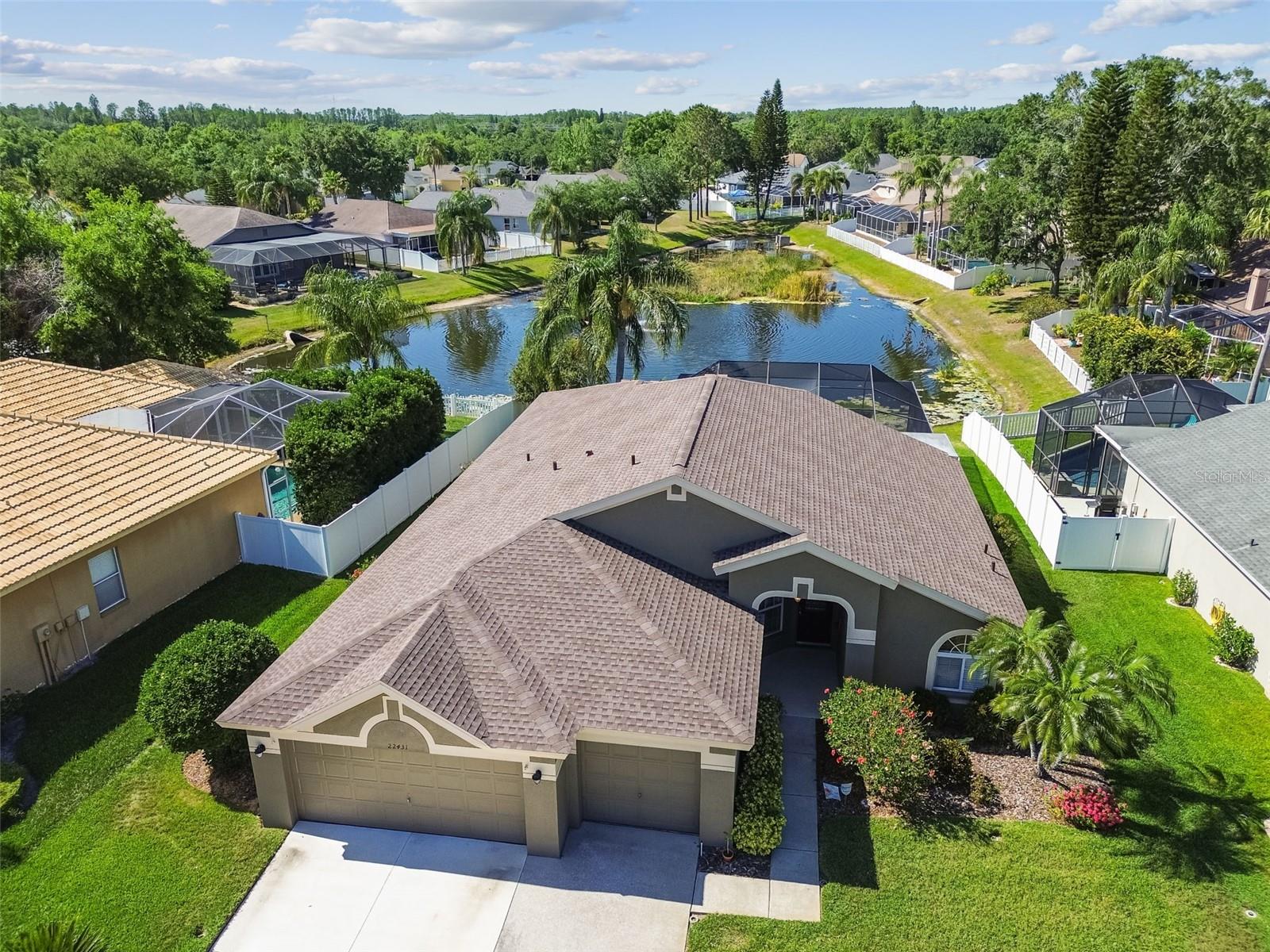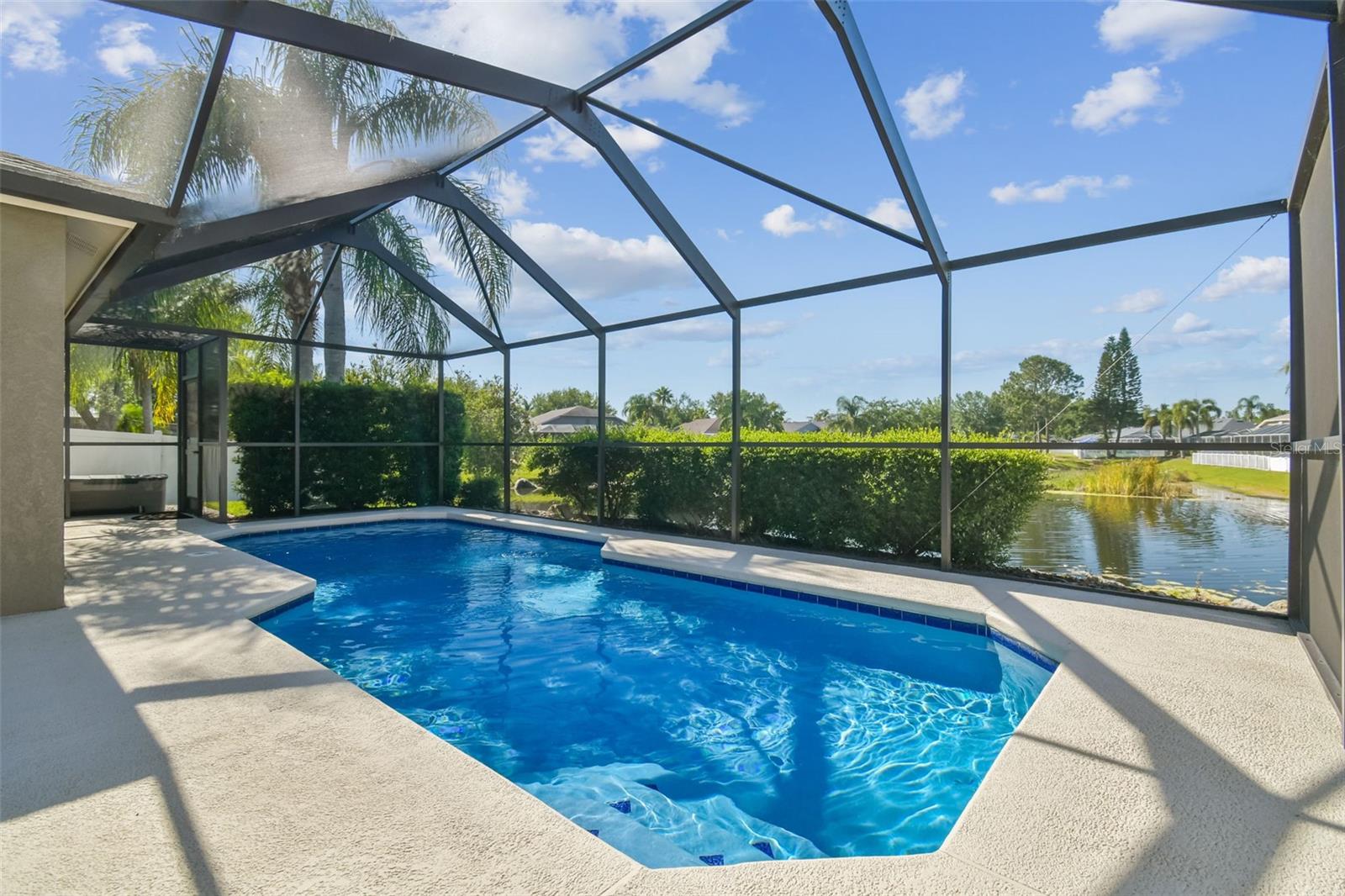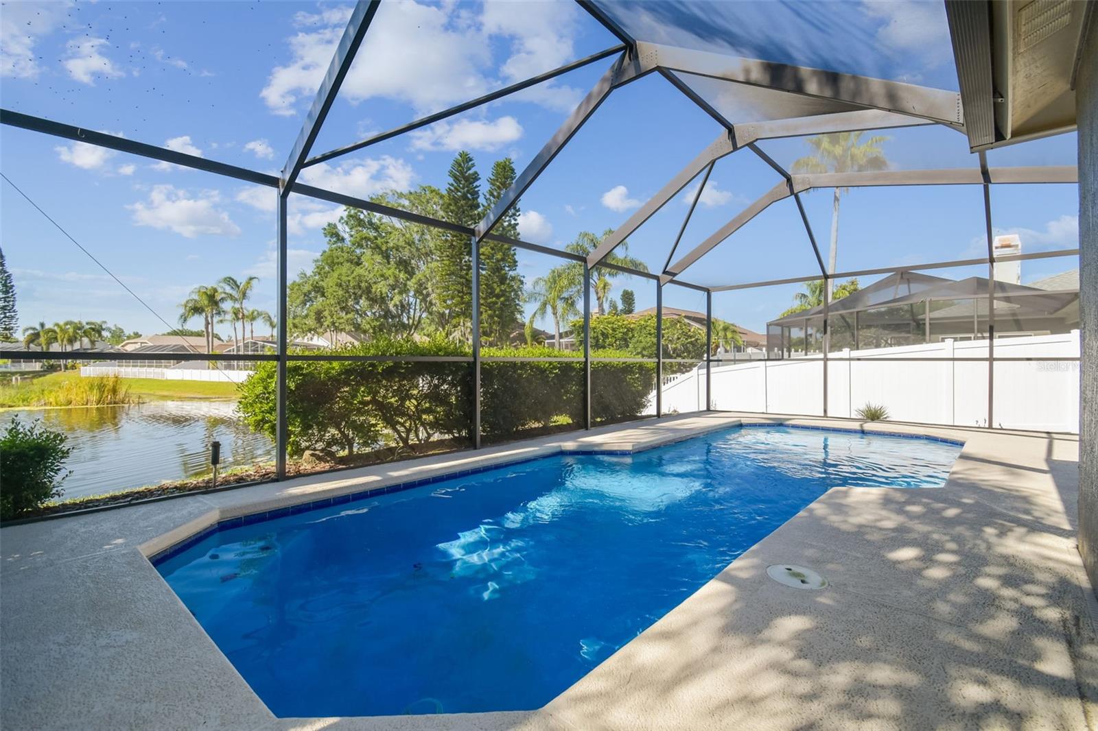 This waterfront POOL home boasts 4 bedrooms, 3 bathrooms, and a 3-car garage where even your car can stretch out comfortably and is now available for you! Located in the highly desirable community of Willow Bend, overlooking a peaceful pond. High ceilings and an open floor plan create a spacious ambiance, while the dining area and formal living room offer an elegant space for your gatherings. The kitchen boasts newer stainless-steel appliances, granite counters, and pristine white cabinets. Feel like royalty, in the primary bedroom offering double walk-in closets and a hallway leading to your clean and bright en-suite bathroom featuring a double sink vanity, garden tub, and shower. The 4th bedroom, combined with the pool bath, would make an ideal in-law suite or a teen retreat. Durable hardwood flooring enhances all guest bedrooms, adding warmth and charm to the home. The spacious laundry room offers 2022 LG Smart Washer and Dryer with a wash tub. Did someone mention weekend barbeques and pool parties? The screened lanai and pool with an expansive pond view is ready for you. The pool was recently resurfaced and re-tiled in 2021, and a new energy-efficient variable speed pool pump was installed in 2023. Many recent upgrades including a NEW ROOF installed in 2020, comes with a one-time transferable warranty, NEW AC in 2023, NEW LG Smart Refrigerator in 2022, exterior painted in 2021, pool cage painted and re-screened in 2022, just to name a few! This home has been well-maintained and is ready to embrace a new chapter with you. Come see why it's the perfect home for you to enjoy! You will want to see this exceptional home in person.