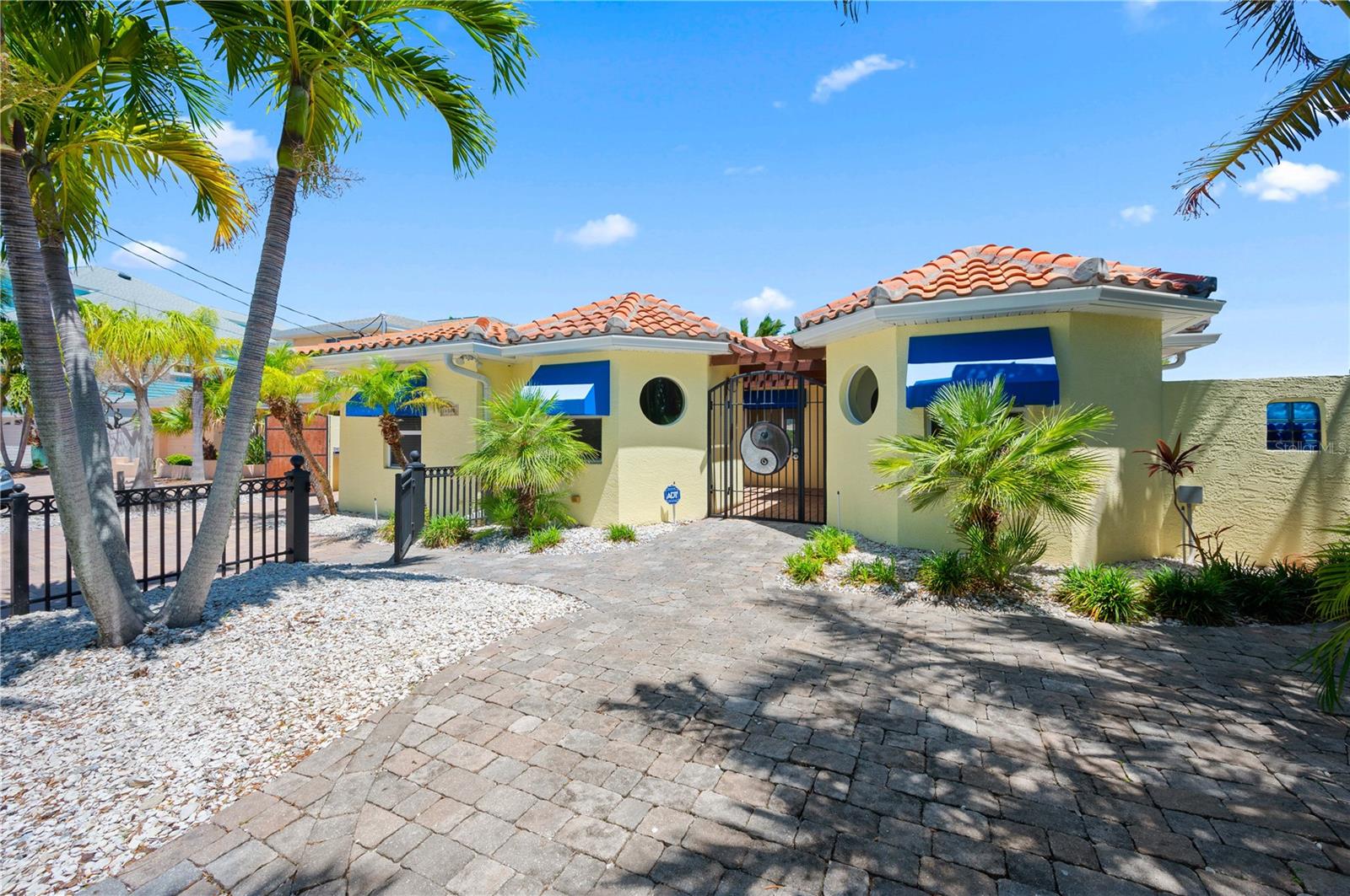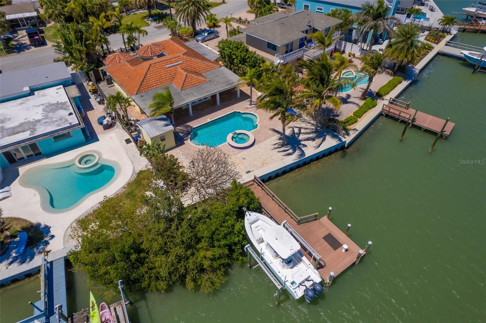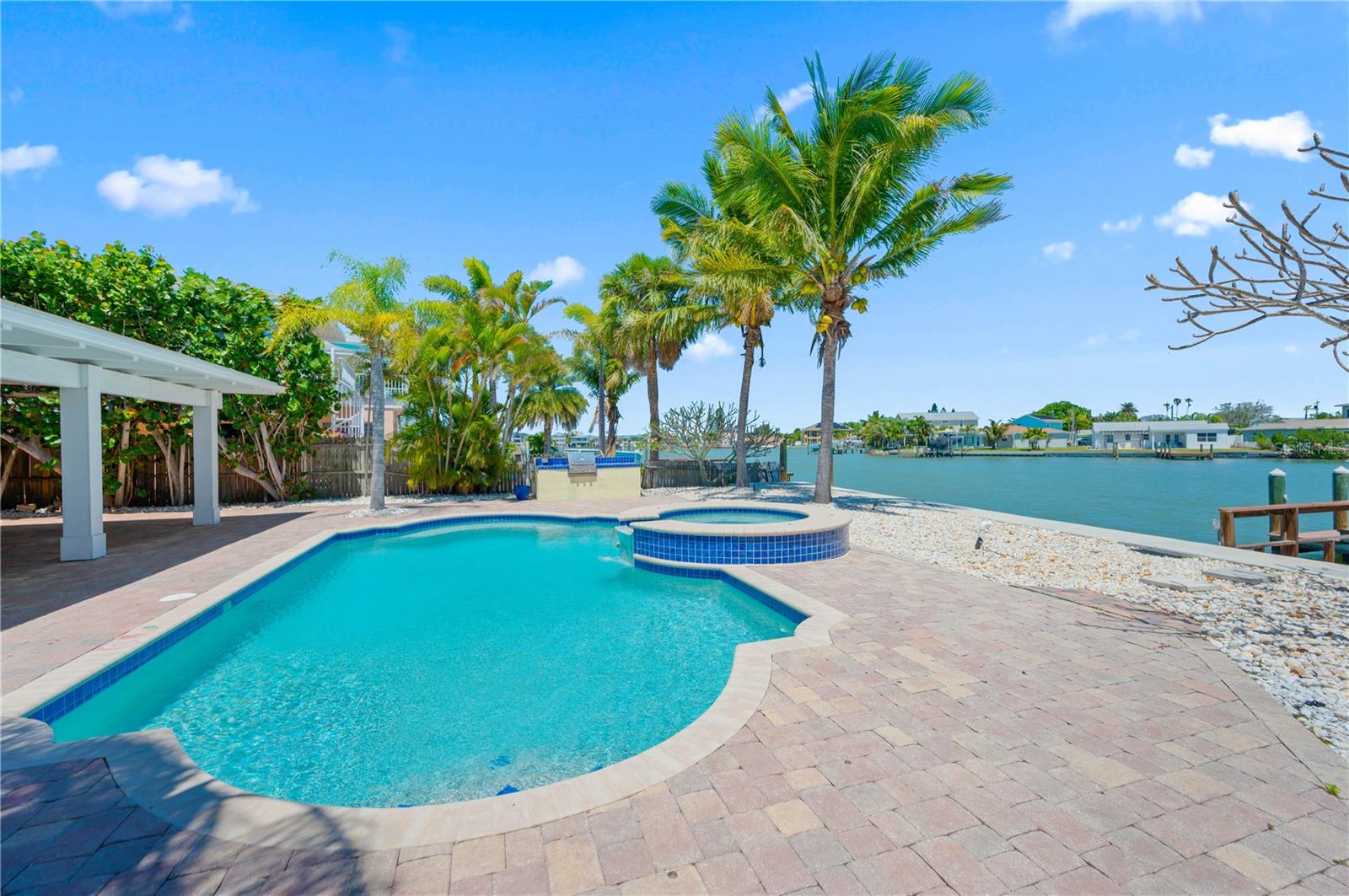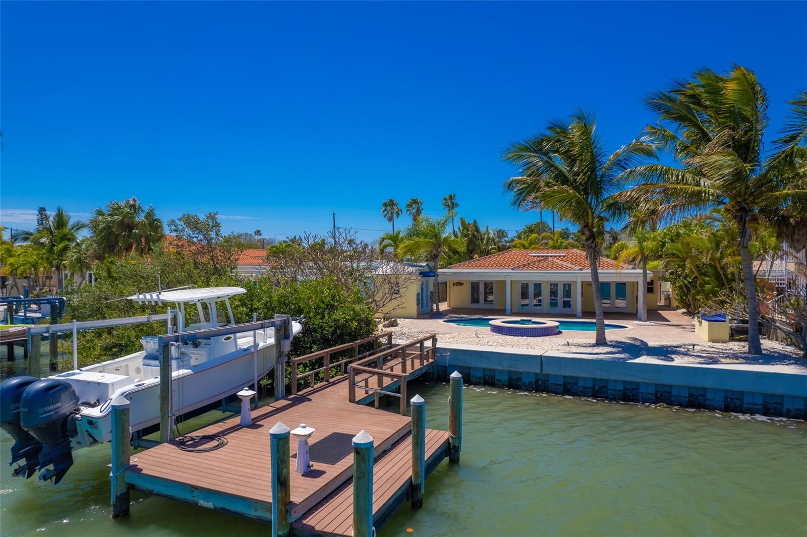 One or more photo(s) has been virtually staged. Boaters Dream Home!!! This cozy beach house is nestled on a private cove on Boca Ciega Bay- a quick 15 minute boat ride to the open Gulf of Mexico. Featuring a quaint gated courtyard, 3 bedrooms, two with attached offices or vacationing guests space that have their own exterior door access. Both bathrooms have been updated with designer tile, wood cabinetry and granite counters. This bungalow is in pristine shape featuring wood cabinetry, granite countertops, stainless appliances, Terracotta handmade tile floors and much more. So many places to enjoy the water view. Entertaining out back with an outdoor kitchen equipped with marine grade cabinetry, crab pot burner and grill with propane. By the pool is yet another grill with food prep space to cook your fresh catch of the day. The saltwater pool and heated spa make this an ideal home for outdoor entertaining. Tropical landscaping with coconut palms, plumeria, and sea grape trees add to the seclusion and beauty of this property. Boaters will love the oversized trex dock and 10 thousand lb boat lift equipped with electricity and water. This high ground home with a brand new elevated sea wall has never flooded. Schedule your private tour now