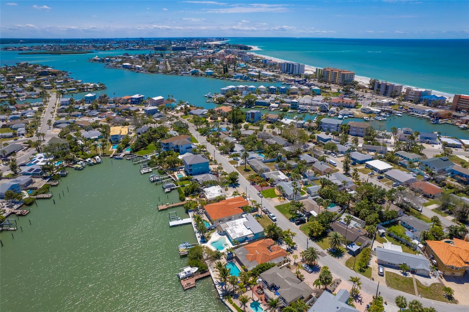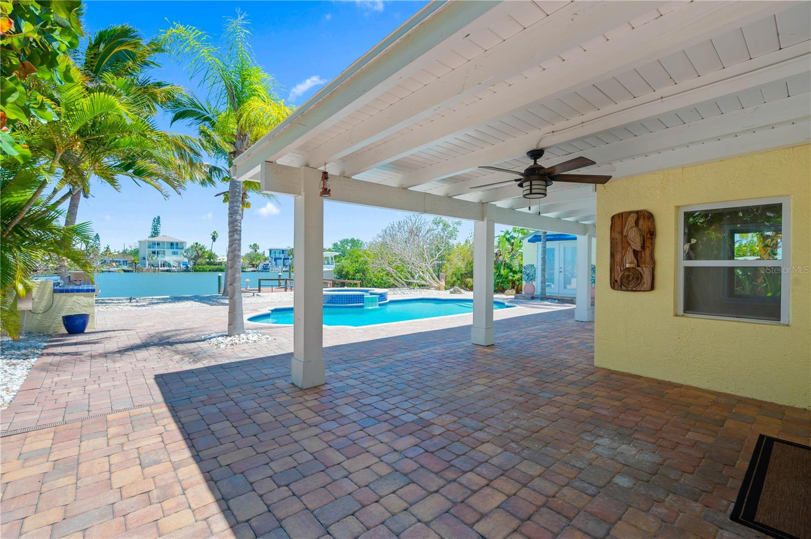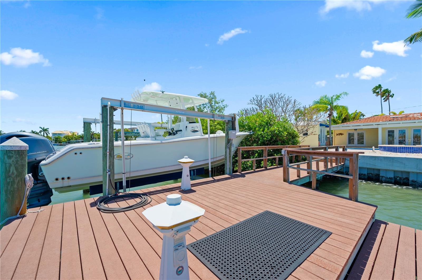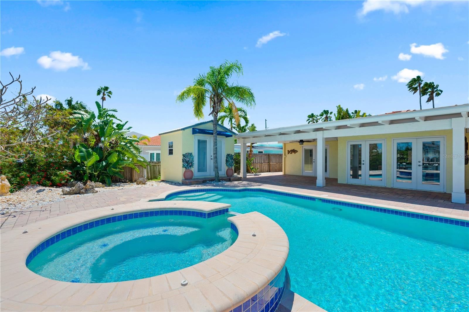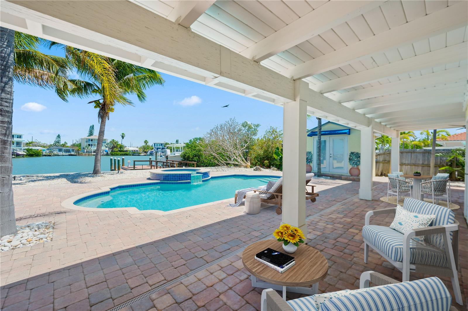 One or more photo(s) has been virtually staged. Boaters Dream Home!!! This cozy beach house is nestled on a private cove on Boca Ciega Bay- a quick 15 minute boat ride to the open Gulf of Mexico. Featuring a quaint gated courtyard, 3 bedrooms, two with attached offices or vacationing guests space that have their own exterior door access. Both bathrooms have been updated with designer tile, wood cabinetry and granite counters. This bungalow is in pristine shape featuring wood cabinetry, granite countertops, stainless appliances, Terracotta handmade tile floors and much more. So many places to enjoy the water view. Entertaining out back with an outdoor kitchen equipped with marine grade cabinetry, crab pot burner and grill with propane. By the pool is yet another grill with food prep space to cook your fresh catch of the day. The saltwater pool and heated spa make this an ideal home for outdoor entertaining. Tropical landscaping with coconut palms, plumeria, and sea grape trees add to the seclusion and beauty of this property. Boaters will love the oversized trex dock and 10 thousand lb boat lift equipped with electricity and water. This high ground home with a brand new elevated sea wall has never flooded. Schedule your private tour now