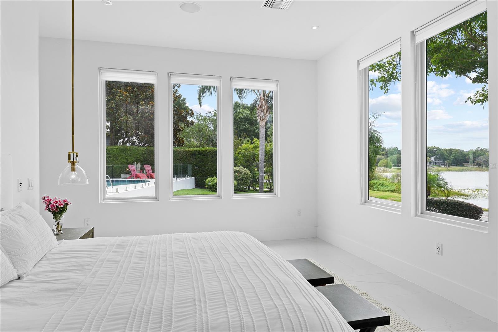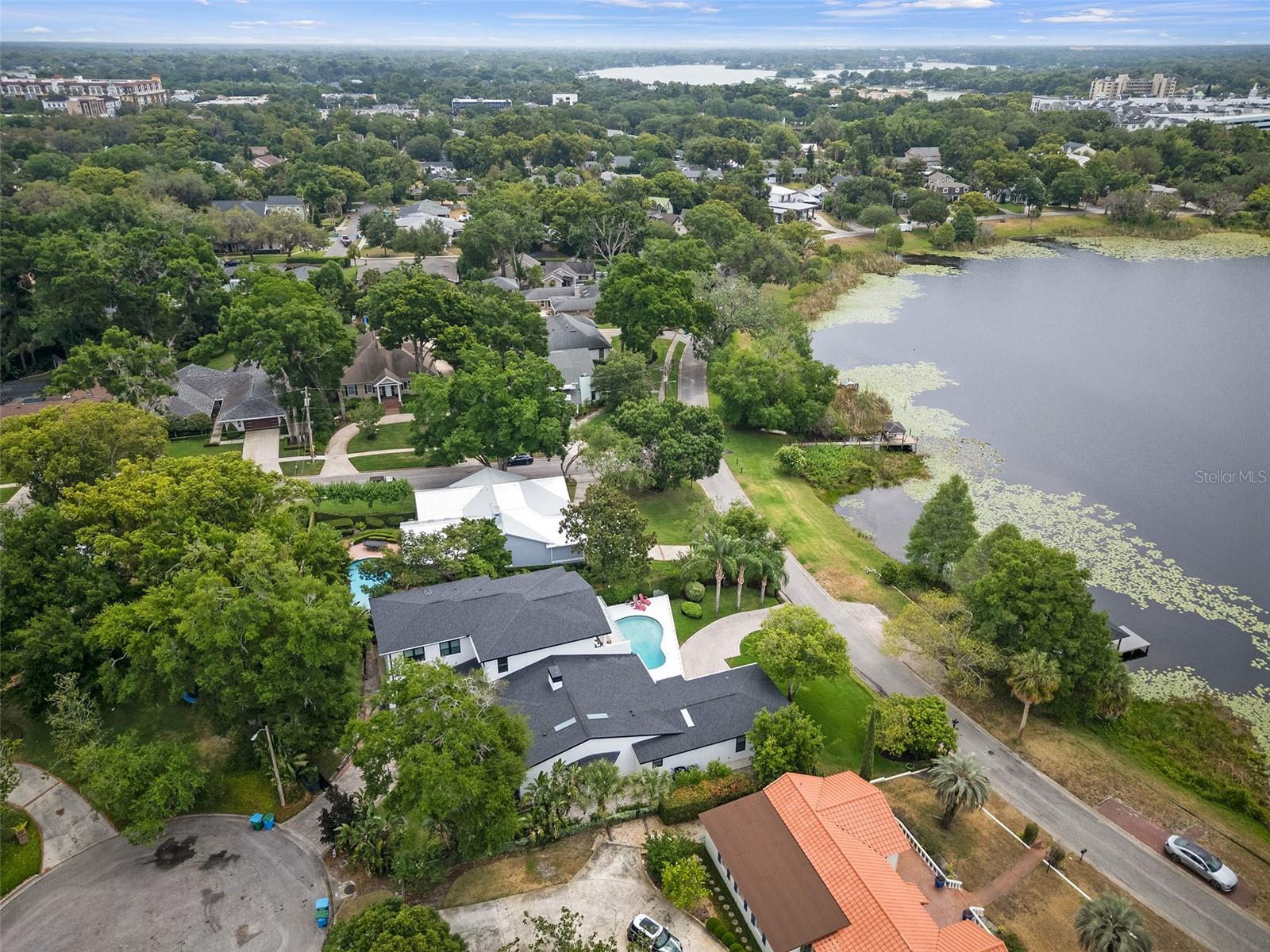 Nestled on the shore of Lake Catherine, this light-infused modern pool home was built in 2019. Boasting 5,810 SF of well-appointed space, on an elevated site, this home includes 5 bedrooms & 5 1/2 bathrooms. Once inside, the voluminous ceilings & flawless attention to detail used to execute the design are immediately appreciated. The sleek lines, natural sunlight & neutral color palette are coveted & arguably the most timeless design approach. The open floor plan is enhanced by the consistent design selections including the large-scale porcelain tile, paint color & repeating elements that create a natural flow between the spaces as well as unity & cohesion throughout. The current owner furnished the front of the home for general living & entertaining w/ a 2-sided, wood-burning fireplace that visually divides the living from the dining. The chic powder bath w/ a modern pedestal sink, linear mirror & textured tone-on-tone tile is a convenient but hidden gem. Beyond the living & dining space is the swoon-worthy kitchen that is as bewitching as it is functional. A hidden sliding door system allows the kitchen to transition from open & inviting to separated for privacy w/ a gentle tug. The clean lines & streamlined appearance of this largely monochromatic space are softened by natural wood tones, large windows & skylights. Open shelving leverages vertical wall space & serves as a place to store both decor & kitchen necessities. Stainless steel appliances include a refrigerator, dishwasher, induction cooktop w/ vent hood, built-in oven, microwave & coffee maker. The clever cabinet design features a cupboard door that is the hidden entry point to the scullery & laundry room featuring a sink, tremendous storage, working countertop space, washer, dryer & more. Privacy is ensured through the soft entry of the primary suite, also located on the main level of the home, where peaceful lake views are enjoyed through the extensive windows of the spacious bedroom. The primary bathroom features a floating vanity w/ double sinks, a stand-alone jetted tub, a wall-mounted & heated towel rack as well as a walk-in shower finished w/ floor-to-ceiling tile, a glass enclosure & multiple shower heads. The closet is dreamy w/ luxury, floor-to-ceiling organization. Finishing off the 1st floor are 2 finely appointed bedrooms w/ en-suite bathrooms & an office. One suite could be described as an alternate primary including an exterior entrance & covered patio overlooking the pool & lake. The dramatic floating stairwell was custom designed & fabricated w/ a vertical lined wood backdrop & glass railing. The same glass railing style was installed at the pool deck, 1st-floor patio & 2nd-floor entertaining deck. The 2nd level of the home consists of 2 ample beds & baths, a bonus room & gym. The smart design offers the option to separate the back suite if desired. The property has an estate-like feel, partly due to the sizable lot & rear “family” entrance through the electric privacy gate. A paver covered drive leads to the 2-car garage, rear yard & deep rear patio. At the front of the home, enjoy swimming in the pool, dining on the deck or paddle boarding on Lake Catherine. An entirely reconstructed dock extends over the lake, which is covers roughly 21 acres. The location is convenient to Maitland City Center, Winter Park’s Park Avenue as well as all the major roads & thoroughfares. Make this charming lakefront sanctuary in the city your new home.