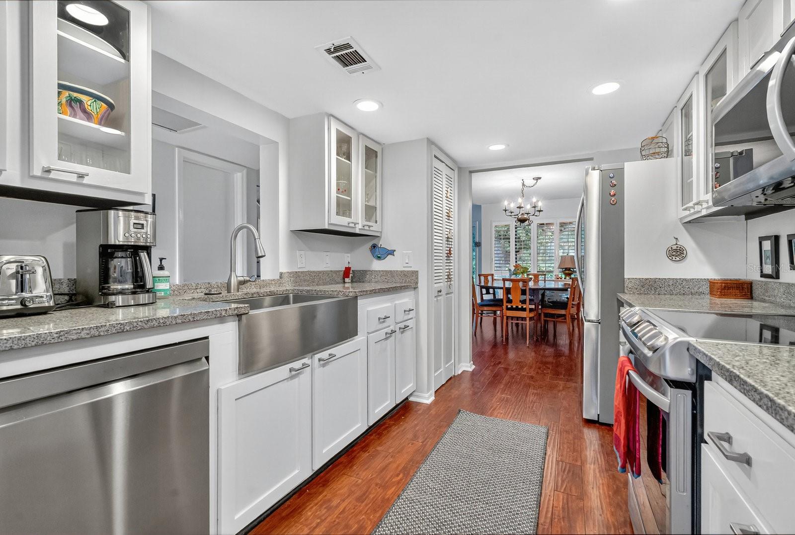 Welcome to refined living in The Moorings! This beautifully updated 3-bedroom, 2.5-bath townhouse offers 1,734 square feet of thoughtfully designed space in one of Maitland's most sought-after communities. The open layout showcases soaring ceilings and gleaming engineered wood floors throughout, creating an inviting atmosphere filled with natural light. The heart of the home is a stunning galley-style kitchen featuring crisp white cabinetry with glass-front doors, stainless steel appliances, and a cozy breakfast nook—perfect for morning coffee or casual dining. The living room centers around a charming wood-burning fireplace, while elegant French doors lead to a private screened patio overlooking serene common green space dotted with majestic oak trees. Upstairs, the primary suite serves as a tranquil retreat with a generous walk-in closet and spa-inspired en suite bath complete with a walk-in shower and double sink vanity. Two additional spacious bedrooms and a full bath complete the upper level, with ample storage throughout. Plantation shutters and updated light fixtures add polish to every room, while an attached one-car garage provides convenient parking and additional storage. Living in The Moorings means enjoying an exceptional lifestyle with exclusive access to a private community dock on Lake Maitland, a sparkling pool, and a welcoming clubhouse. The location is truly unbeatable—just moments from the charm of Lake Lily Park and its beloved weekly farmer's market, five minutes from the upscale boutiques and dining of Park Avenue, and surrounded by Central Florida's finest shopping, restaurants, and entertainment.