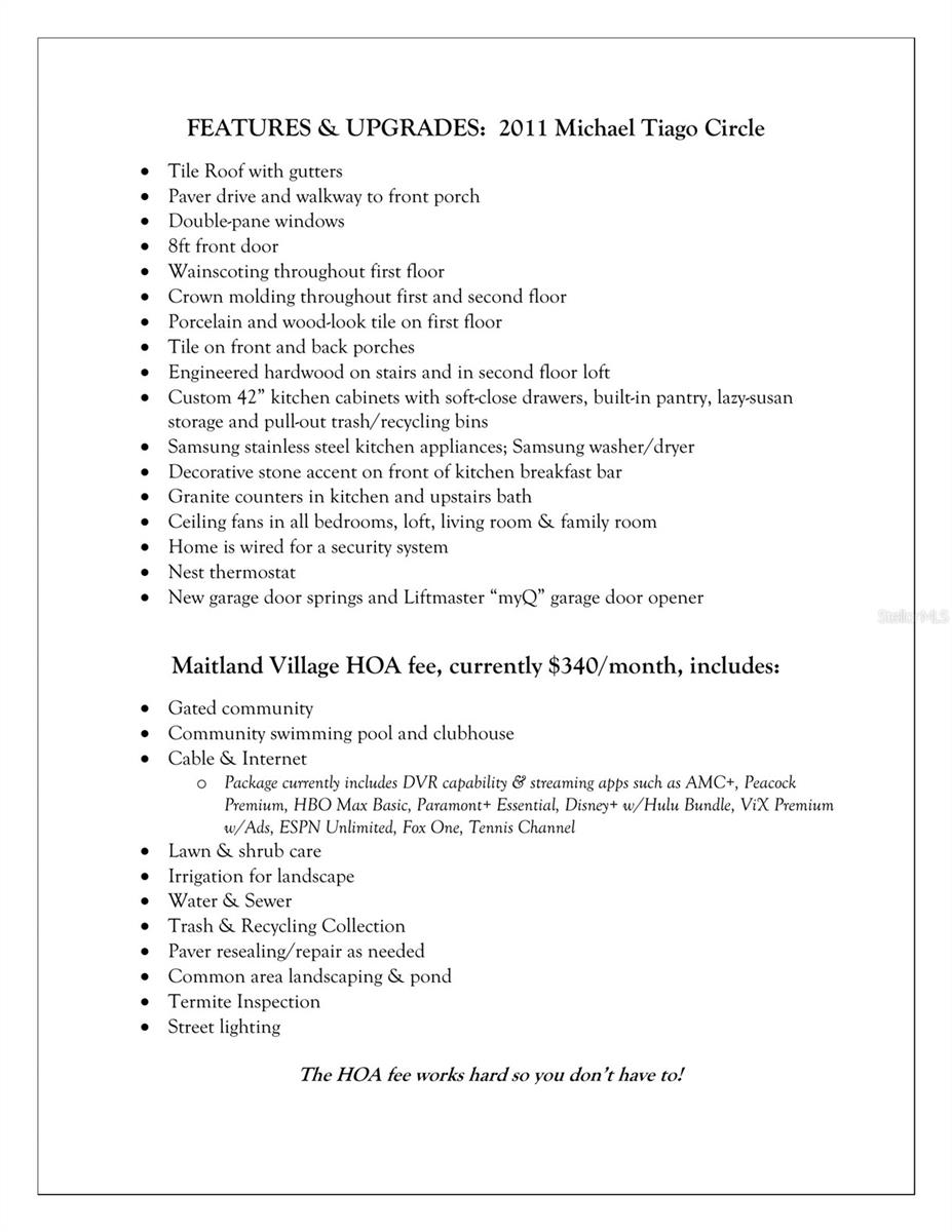 You've been searching for a single-family home — the space, the privacy, the pride of ownership. What if you could have all of that and never mow the lawn, pay a cable bill, or worry about the water bill again? Welcome to 2011 Michael Tiago Circle, where the spaciousness and elegance of single-family home living meets the effortless ease of a low-maintenance lifestyle — truly the best of both worlds! This stunning, move-in ready, Mediterranean-style end-unit townhome is located in the gated enclave of Maitland Village. Step inside and you'll immediately notice the soaring ceilings, extra windows of an end-unit, added natural light and elevated craftsmanship that sets this home apart: decorative chair-rail and wainscoting grace the first floor and crown molding flows throughout every level, lending an air of elegance and sophistication. The open-concept kitchen is a true showstopper, featuring granite countertops, Samsung stainless steel appliances, and 42" custom cabinetry thoughtfully designed for real life — including a pantry cabinet with pull-out drawers, a corner Lazy Susan that maximizes every inch of storage, and a dedicated pull-out trash and recycling cabinet to keep things tidy and tucked away. Whether you're hosting a dinner party or meal-prepping for the week, this kitchen is ready for it all. Sliding glass doors open to your private covered porch overlooking a serene pond— the perfect backdrop for morning coffee or evening unwinding. Upstairs, a versatile loft provides the perfect flex space for a home office, exercise space or playroom. The large primary suite features a walk-in closet and a luxurious bath with dual vanities, soaking tub, glass enclosed shower and private water closet. The other two sizeable bedrooms are down the hall for privacy and share a full bathroom. The Maitland Village HOA fee includes community gated access, swimming pool and clubhouse, lawn/shrub care, irrigation, cable/high-speed internet, water/sewer, trash/recycle pick-up and pest inspections. Conveniently located with easy access to I-4, SR 414/429 and just minutes to local parks, the Orlando Sportsplex, Maitland City Center, Winter Park and Altamonte Springs for a variety of shopping, dining and entertainment options. Make your appointment to see this beautiful home today!