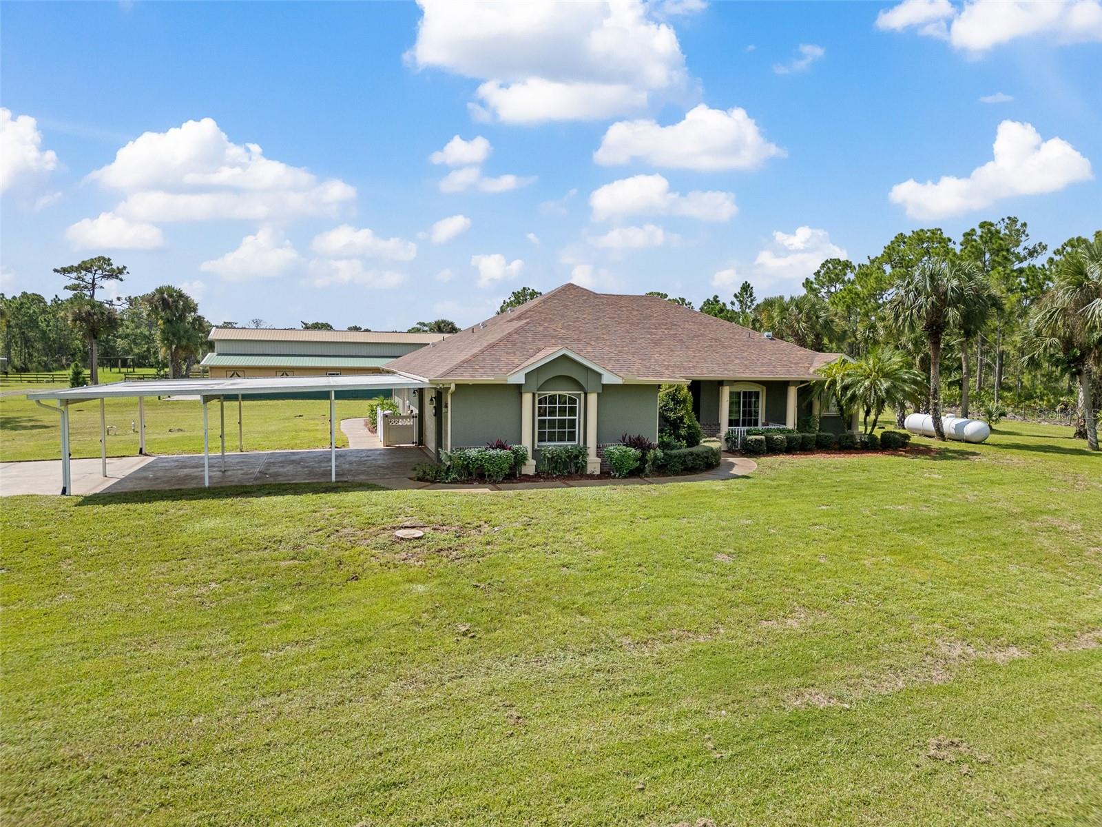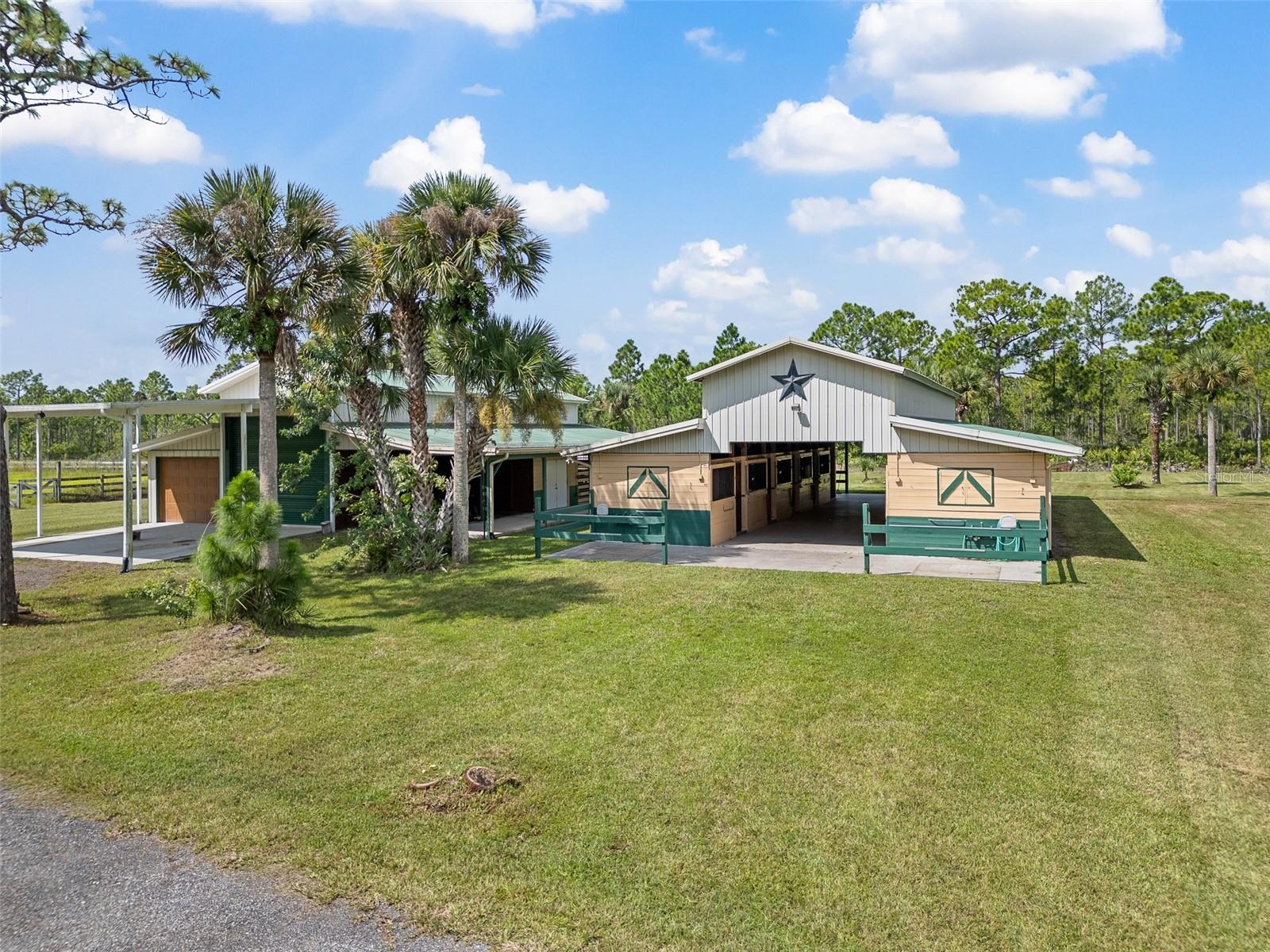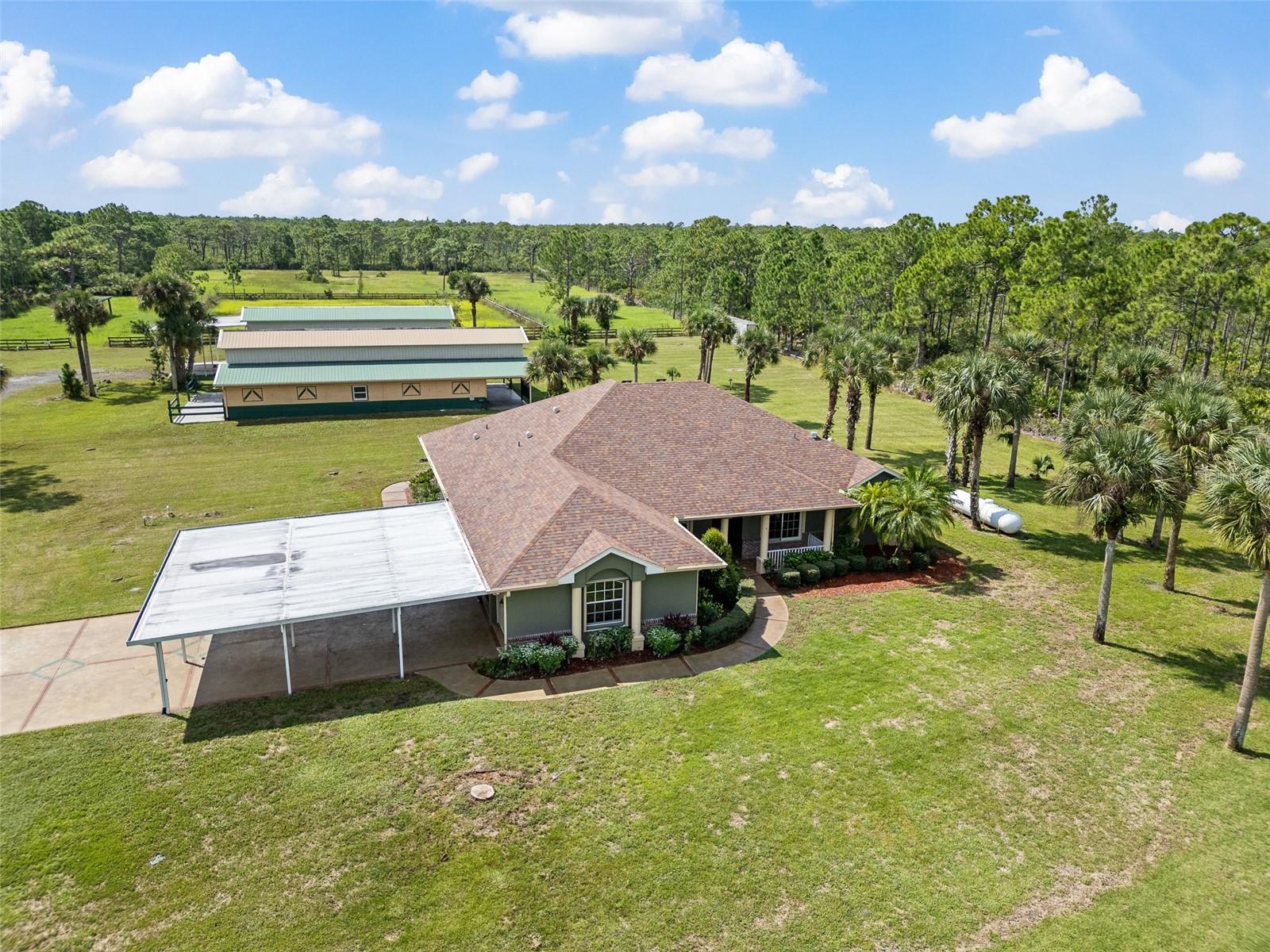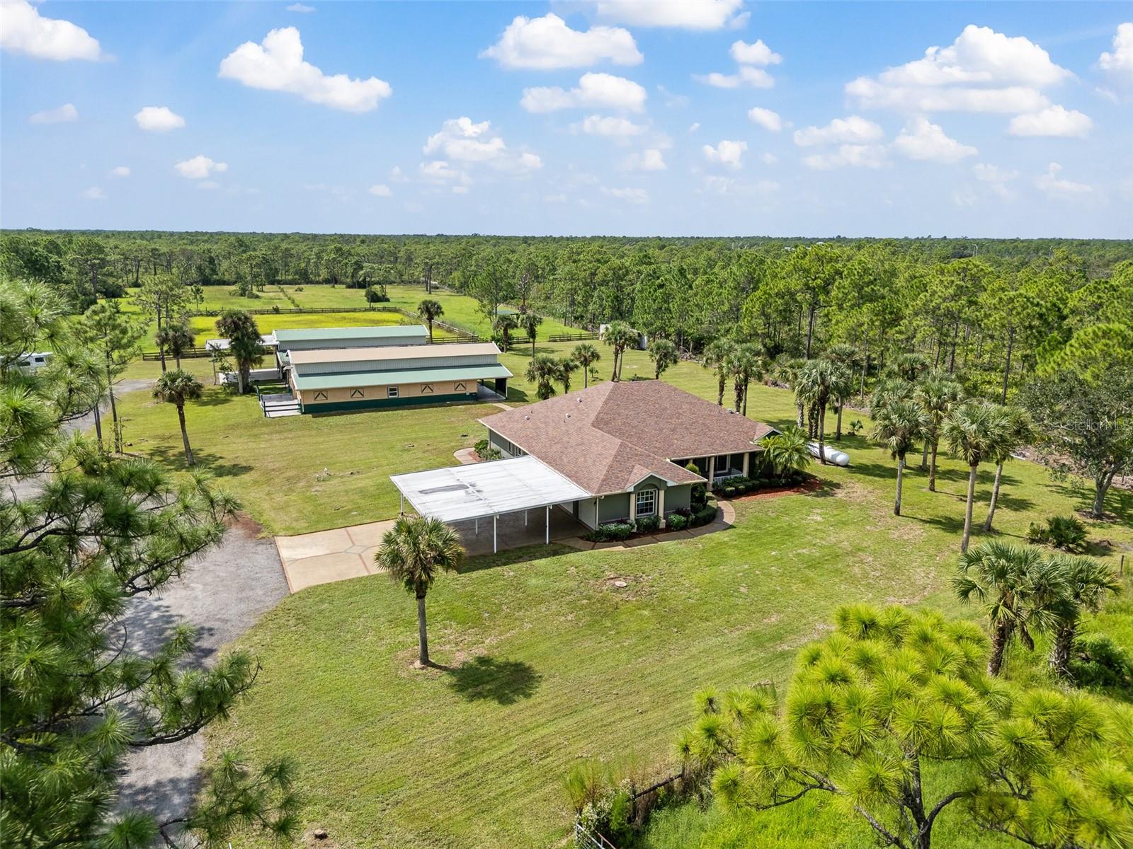 Welcome to your serene escape at 1145 Ramblebrook Street in beautiful Grant-Valkaria, Florida. This stunning 9.68-acre equestrian estate offers luxury, space, and privacy, blending rural tranquility with modern amenities. Property Highlights incl. 9.68 acres of open pastures, ideal for grazing and horseback riding. Home Size:2,152 sq. ft., 3 bedrooms, 2 bathrooms. Garage: Oversized 3-car garage with plenty of storage space. Ceilings: 10-foot ceilings throughout for an open and airy feel. Interior Features: Kitchen: Stone floors in the kitchen and laundry room. Granite countertops with elegant glass/tile full backsplashes. Samsung touchscreen appliances, including a refrigerator, dishwasher, microwave, and flat-top stove/oven. Soft-close cabinets and drawers for a smooth experience. Primary Bedroom Suite with Ensuite Bath and French doors leading to a 34' x 12' tiled screened porch. Two large walk-in closets for ample storage. Luxurious En-suite bath featuring: Private watercloset Double vanity, Jacuzzi soaking tub, Spacious walk-in tiled shower. Linen closet for additional storage. Second Bathroom tile floors with a tiled tub/shower combo. Porches 341 sq. ft. tiled screened porch with large sliding doors that push into the wall. 187 sq. ft. open porch for outdoor relaxation. Outbuilding include Horse Stable: 3,000 sq. ft. with epoxy floors, electricity, and water. 10 horse stalls, 4 washing stations, office/storage room, and a second storage room. Shop/RV Storage:2,880 sq. ft. with RV hookups and dump station. Full bathroom and laundry hookups. Carports: Two carports at 1,088 sq. ft. and 896 sq. ft. Recent Upgrades (2022-2023): 2022 New exterior and interior paint. New kitchen stone flooring, mudroom, and hardwood floors throughout. Updated spare bathroom vanity. New roof, kitchen appliances, countertops, soft-close cabinets. On-demand hot water heater. New AC unit. Fresh paint on horse stables. 2023: Generac 26kW whole-house generator with a 1,000-gallon propane tank. New exterior electrical panels for modern energy efficiency. This meticulously maintained estate offers the perfect blend of luxury living and functional equestrian facilities. Whether you’re a horse enthusiast or simply love the charm of rural living, this property delivers on all fronts. Schedule your private showing today!