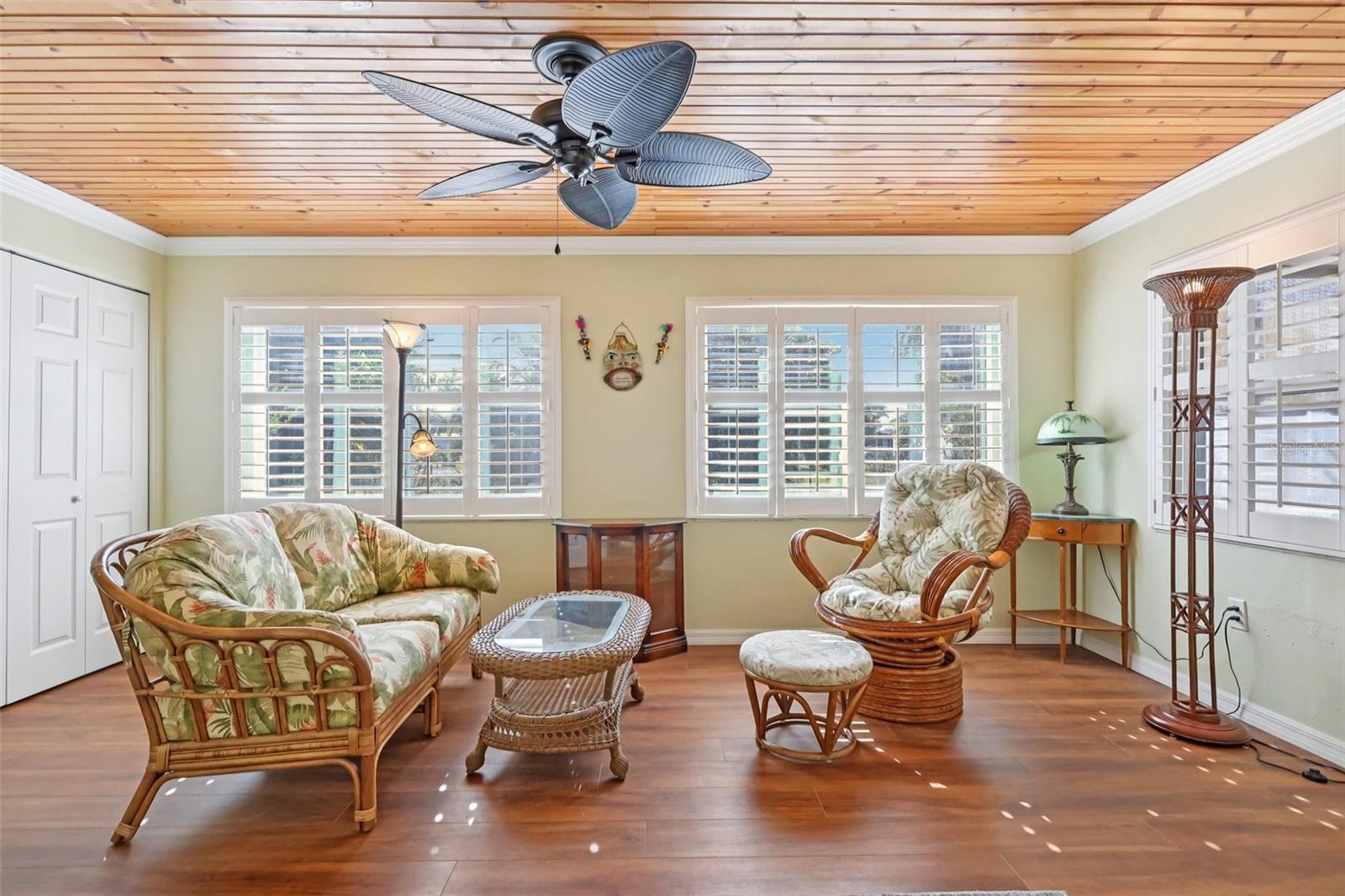 Welcome to your new sanctuary! This updated four-bedroom gem strikes the perfect balance between coastal vibes and modern reliability. Step inside to find gorgeous wood-look tile floors stretching toward a stunning wood ceiling that adds immediate warmth to the space. The kitchen and bathrooms have been stylishly refreshed, and the addition of a bright family room gives you all the extra space you've been looking for. Whether you need a dedicated workspace or a fourth bedroom, the flexible floor plan has you covered. Outside, the metal roof, pavered drive, and fully fenced yard offer total peace of mind. Complete with classic plantation shutters, this one is a must-see!