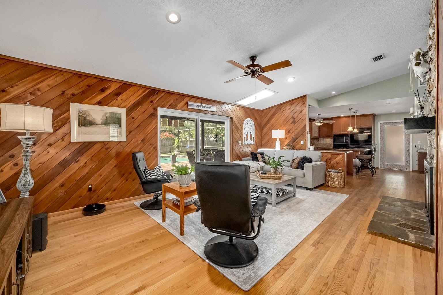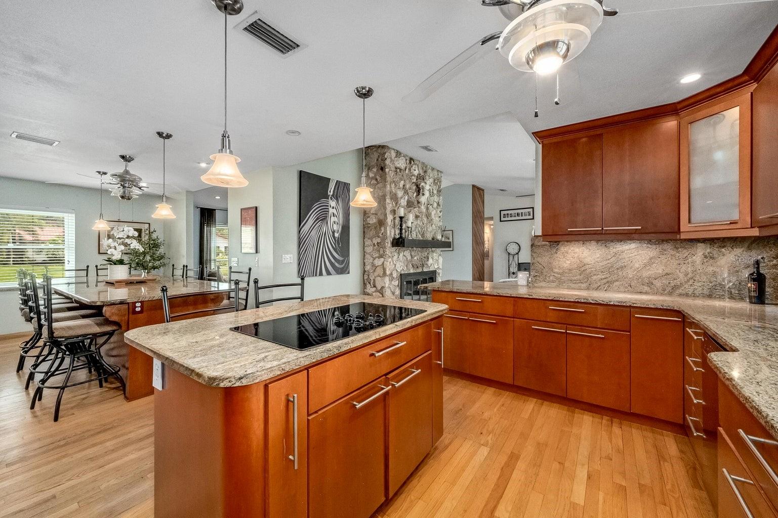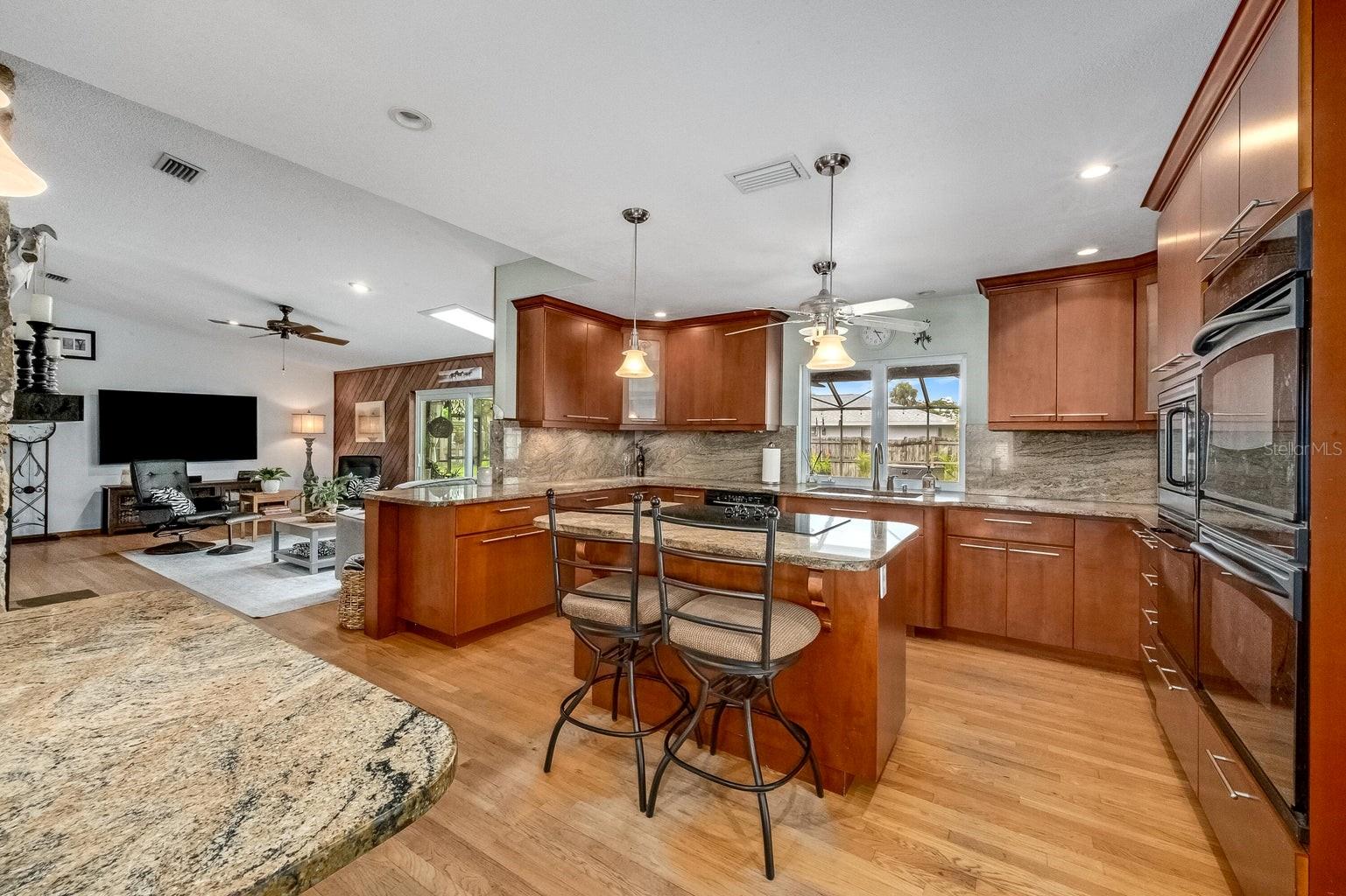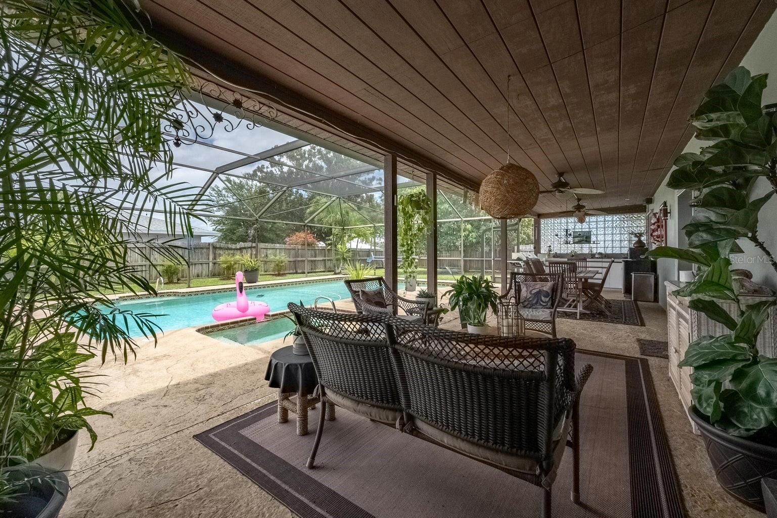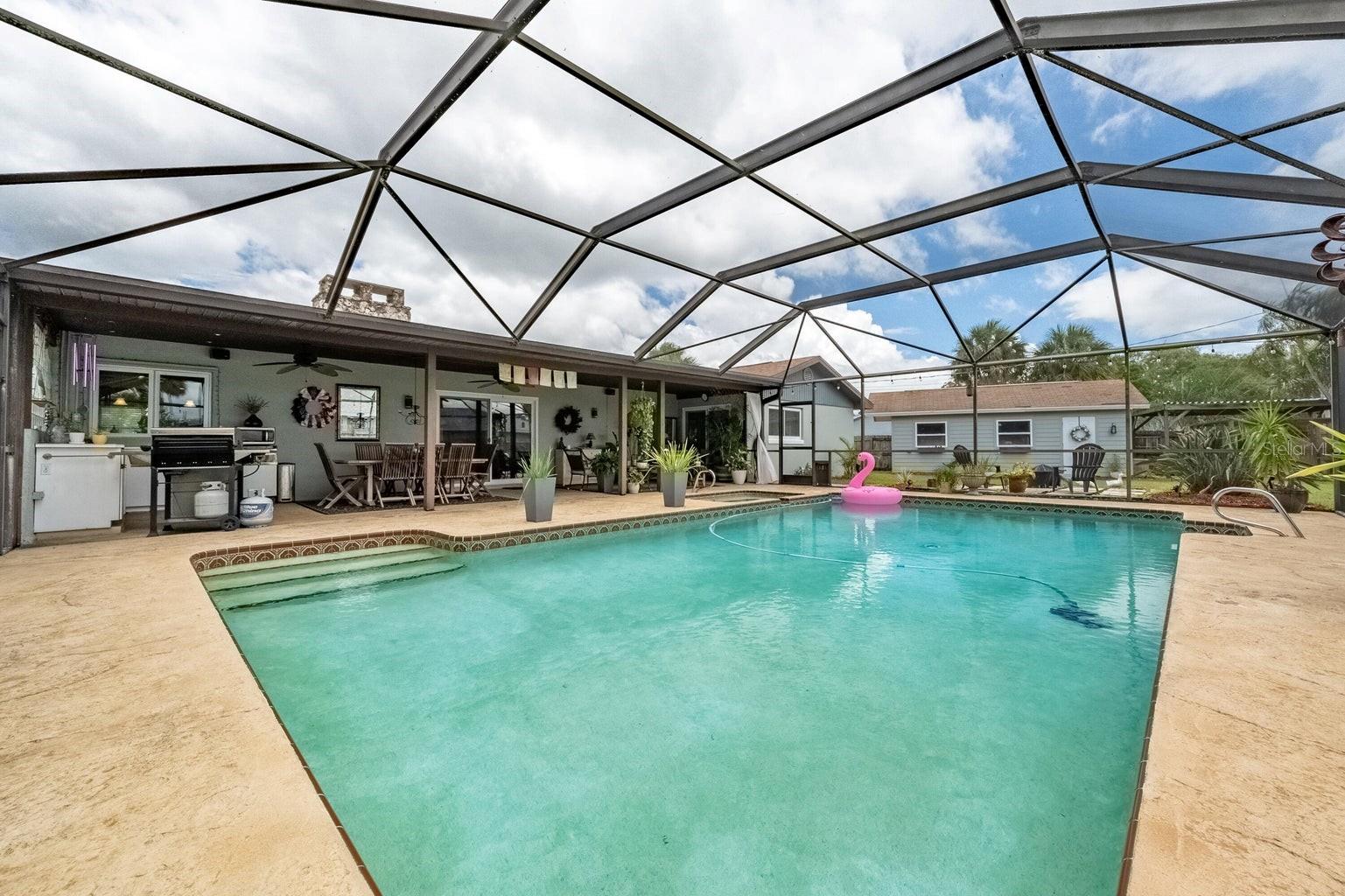 This beautiful home is situated on a spacious 0.35-acre corner lot in the desirable Rockwell Estates neighborhood. The heart of this home features an updated kitchen, remodeled in 2006, with modern appliances, Tons of custom cabinetry, and a huge island perfect for meal prep and casual dining. Triple ovens, Cooktop island, Built In Refrigerator set the stage for all your family get togethers. Relax in the inviting family room, complete with a two sided wood-burning fireplace that adds warmth and character to the space. Owners suite offers walk in shower and Huge WIC! The screened-in pool area is perfect for summer barbecues, pool parties, or simply enjoying a peaceful retreat. The large, well-maintained backyard offers plenty of room for outdoor activities and gardening full with Papaya and Mango trees and equipped with huge workshop. This home provides easy access to top-rated schools, Pineda extension and Beaches! Roof 2014, Windows 2021, AC 2017 Solar Water Heater 2014.