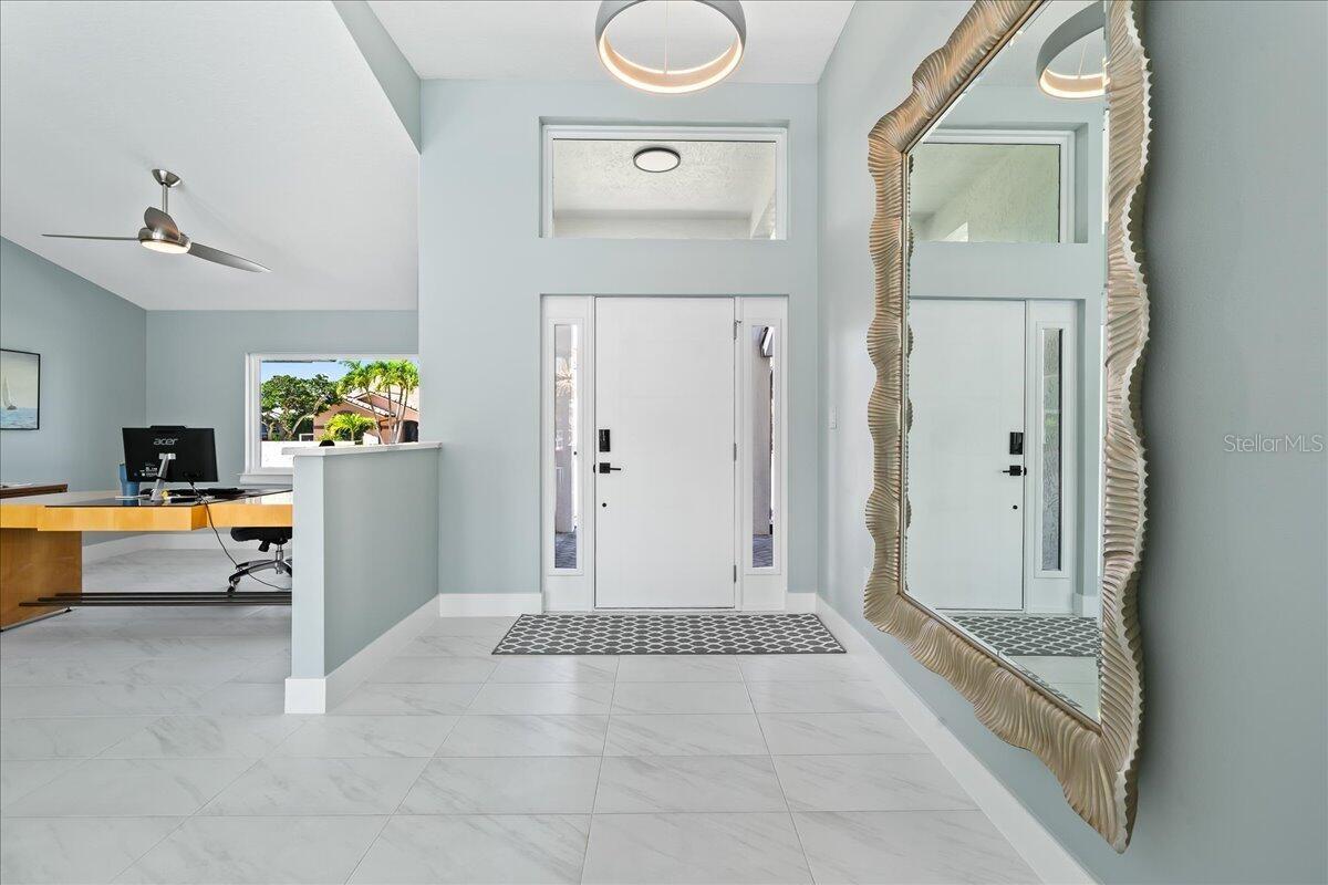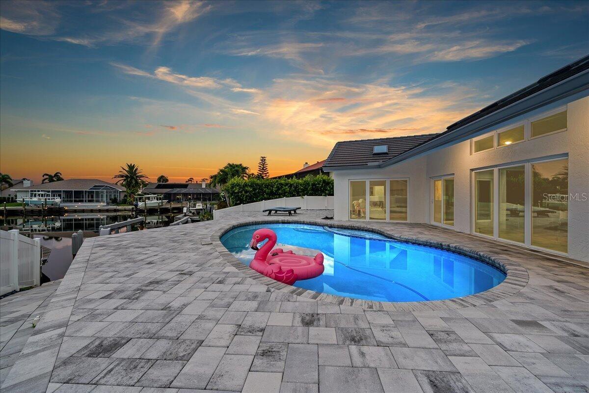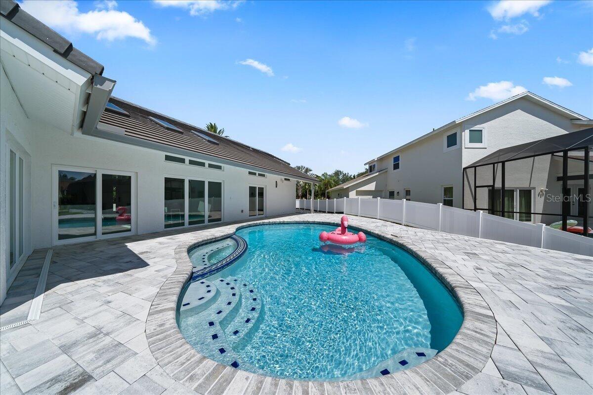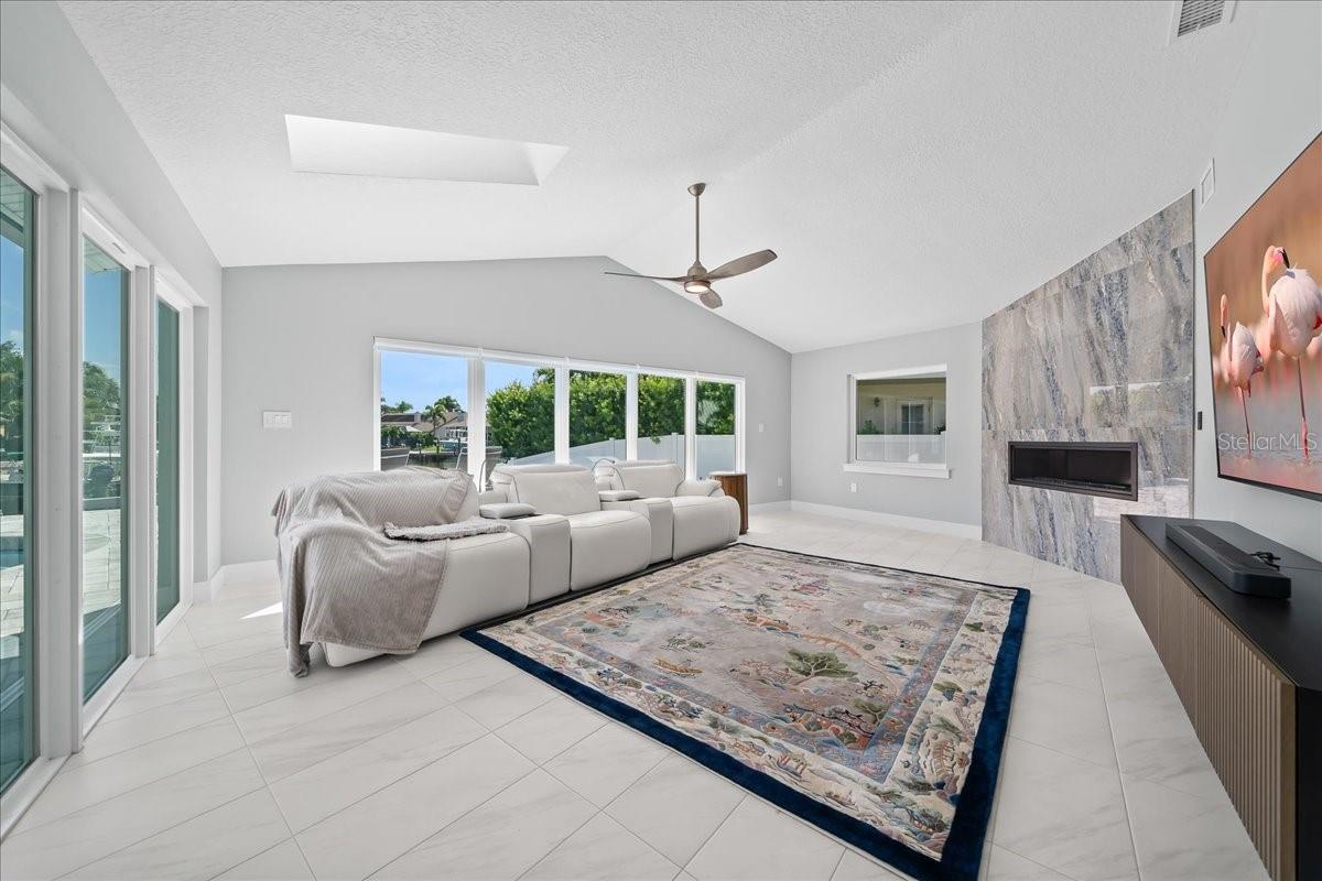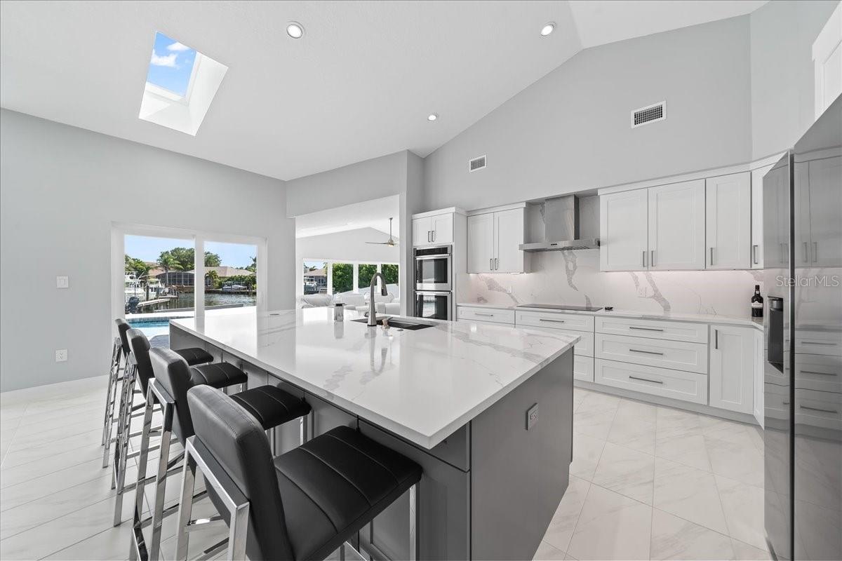 Welcome to modern waterfront living in the distinguished Villa de Palmas community, Sykes Cove on Merritt Island. This stunning home, completely remodeled in 2022, boasts a sleek and sophisticated design. The open floor plan features tile floors throughout, flooded with natural light. The chef's kitchen includes a double oven, ample storage, and an oversized island with quartz counters and a dramatic waterfall edge. The entire back of the home is lined with impact windows providing stunning views of the pool and deep water canal. Enjoy cool evenings by the modern gas fireplace. The exterior is equally as impressive featuring a paver driveway, paver pool deck, and a pedestrian ramp to the boat slip. The low-profile landscaping includes stone accents and raised borders. Modern amenities include impact windows, a concrete tile roof, new HVAC, ductwork, spray foam insulation, updated electrical panel, and new plumbing to ensure comfort and safety. Don't miss this exquisite waterfront gem!