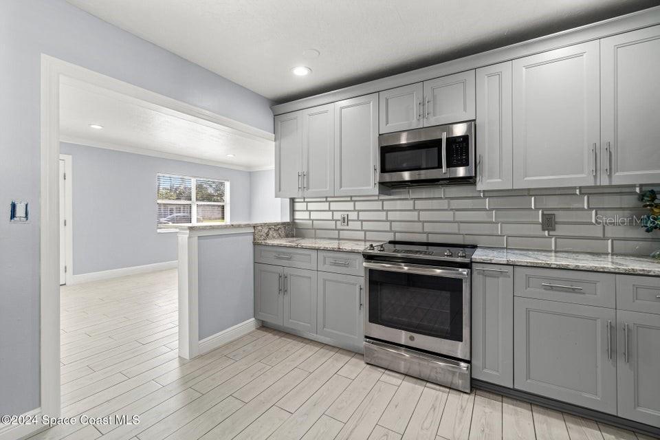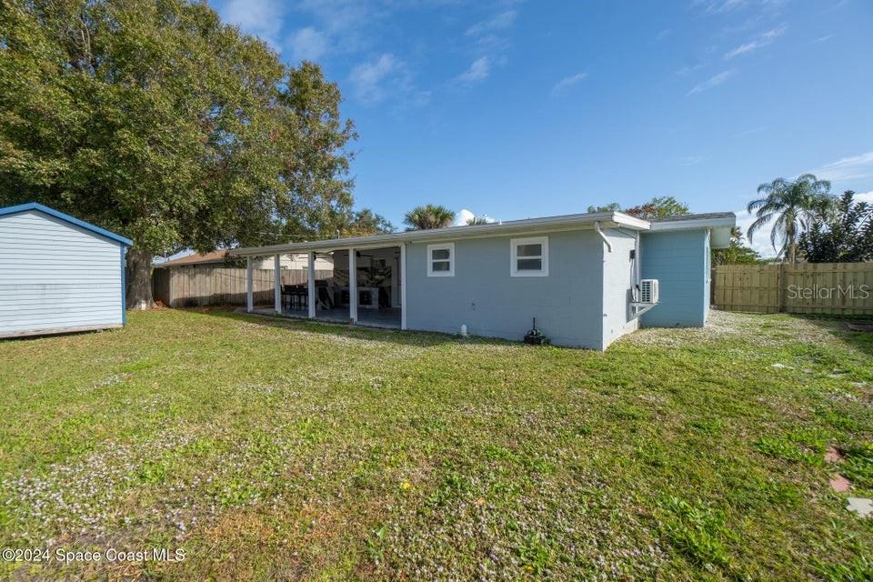This beautifully renovated 3 bed/2 bath home offers modern luxury and comfort in an ideal location. With brand-new hardwood flooring throughout, stylish fixtures, and stunning barn doors, this property exudes charm and sophistication. The primary bedroom features a massive walk-in closet with built-in shelving, offering ample storage. Both bathrooms have been completely updated with luxurious marble finishes and sleek backsplashes, while the kitchen boasts brand-new countertops, backsplash, and high-end appliances, perfect for cooking and entertaining. The roof is brand new, providing peace of mind for years to come. Step outside to enjoy a large backyard with a covered patio and a new outdoor kitchen, ideal for hosting gatherings or simply relaxing in your private oasis. Additionally, a spacious shed provides extra storage. Located in the highly sought-after area of Merritt Island, this home is just minutes from local restaurants, shopping areas, and only 10 minutes from the beach.
