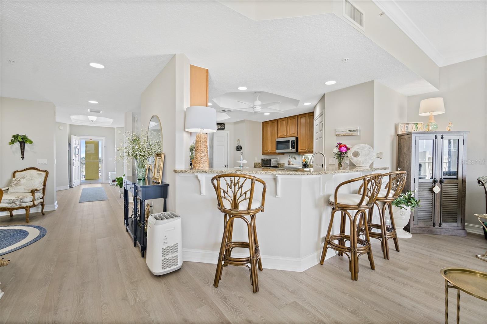 Enjoy breathtaking sunrises and endless Indian River views from this 7th-floor 3-bedroom, 2-bath condo in Island Pointe. The updated kitchen offers granite countertops, new Bosch stainless-steel appliances, a walk-in pantry, and a large island ideal for cooking and entertaining. Natural light fills the open floor plan through the balcony sliders. A versatile bonus room can be used as an office, den, or dining area. The spacious primary suite features his-and-her closets and a relaxing bath with dual sinks and a jetted tub. A private garage near the building entrance adds convenience. Watch ships and rocket launches from your balcony! Resort-style amenities include two heated pools, spas, a sauna, fitness center, clubhouse, and tennis and basketball courts. Conveniently located near Cocoa Village, beaches, Port Canaveral, and Merritt Square Mall. Milestone & SIRS complete—no assessment! Schedule your private showing today!