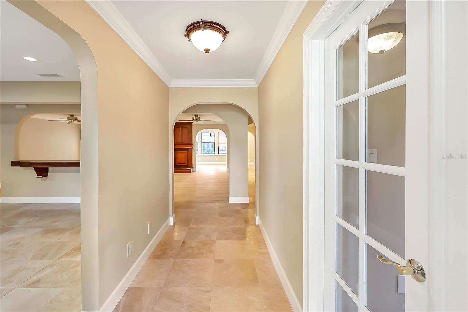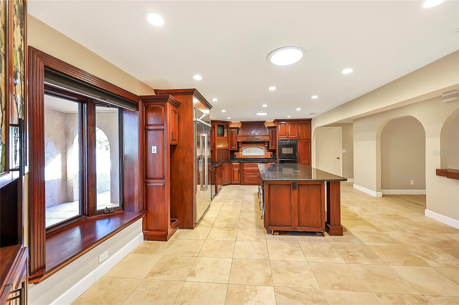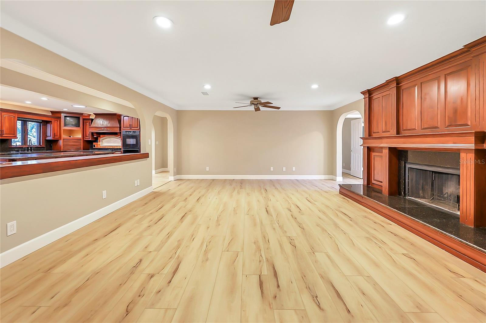 Mediterranean-style pool home on 1.02 acres, with No HOA — bring your toys, boats, or RV.. This home offers space, privacy, and a thoughtfully designed layout ideal for modern living. This 4-bedroom, 3-bath, plus a BONUS has been freshly updated with new interior paint, updated bathrooms, and LVP flooring creating a light, move-in-ready feel throughout. The heart of the home features expansive living spaces highlighted by a striking custom wood fireplace wall and graceful archways that define each area while maintaining an open flow. The kitchen is designed for both function and entertaining, showcasing rich custom cabinetry, granite countertops, a large 10-foot center island, built-in appliances, and ample storage. The primary suite is truly impressive, offering a 19x26 bedroom, a massive 10x20 walk-in closet, and a spa-like bathroom that wraps around both the bedroom and closet. The primary bath includes dual vanities, a soaking tub, and a walk-in shower. A doggy door from the primary bedroom provides convenient access to the backyard for pet lovers. On the opposite side of the home, a secondary en-suite bedroom with its own private entrance from the garage offers the perfect setup for a mother-in-law suite, guest quarters, or multi-generational living. Two additional bedrooms, a full bath, and a separate office or bonus room complete the interior layout. The home also features central vacuum throughout for added convenience. Outdoors, enjoy Florida living at its best with a large screened-in pool and expansive paver patio, ideal for entertaining or relaxing year-round. The property is fully fenced with wood fencing, offering privacy and space, and includes additional outdoor storage. Located directly across from Ellington Park, featuring a playground, walking trails, and playing fields, this home offers both tranquility and accessibility. Conveniently situated near grocery stores, shopping, schools, and major highways 528 and 520, with easy access to the beaches and Kennedy Space Center. Orlando International Airport is approximately 45 minutes away, and Disney is just about an hour drive. This home delivers the rare combination of acreage, location, versatility, and lifestyle.