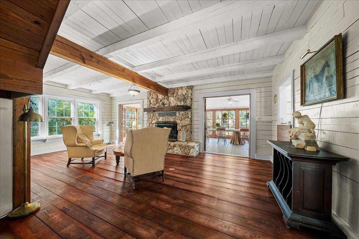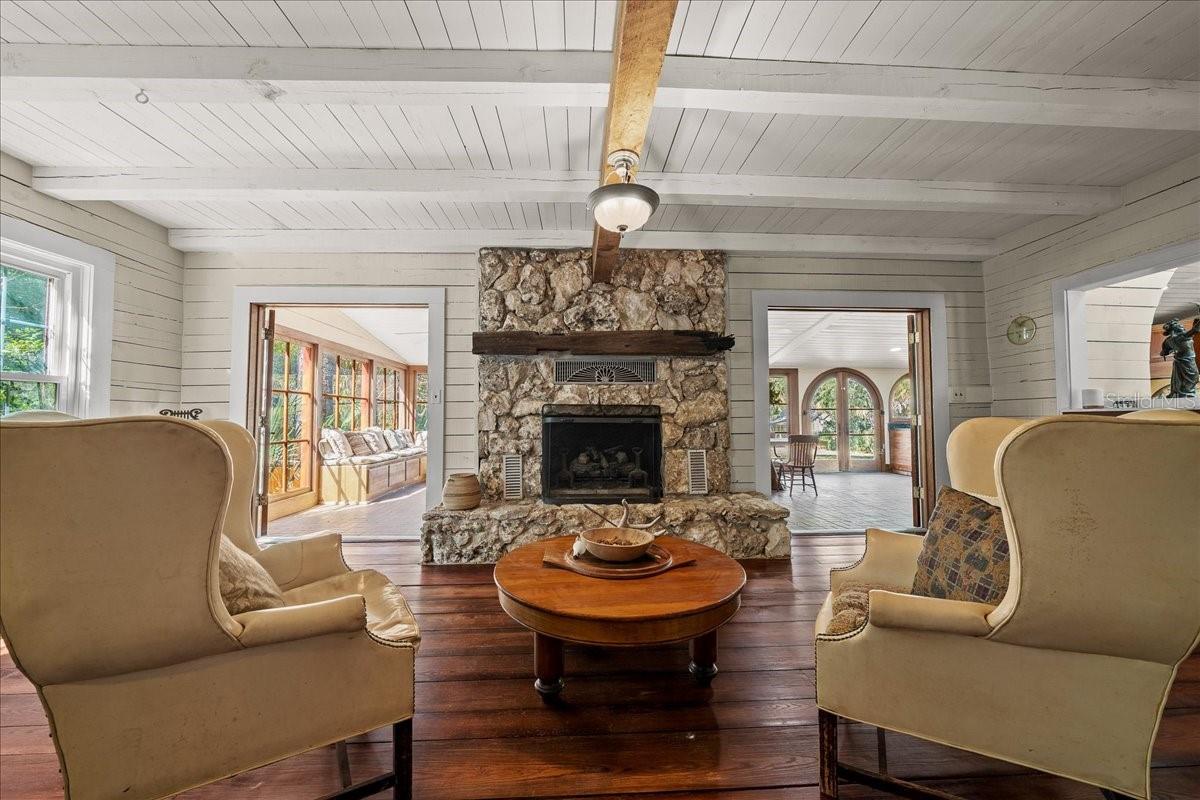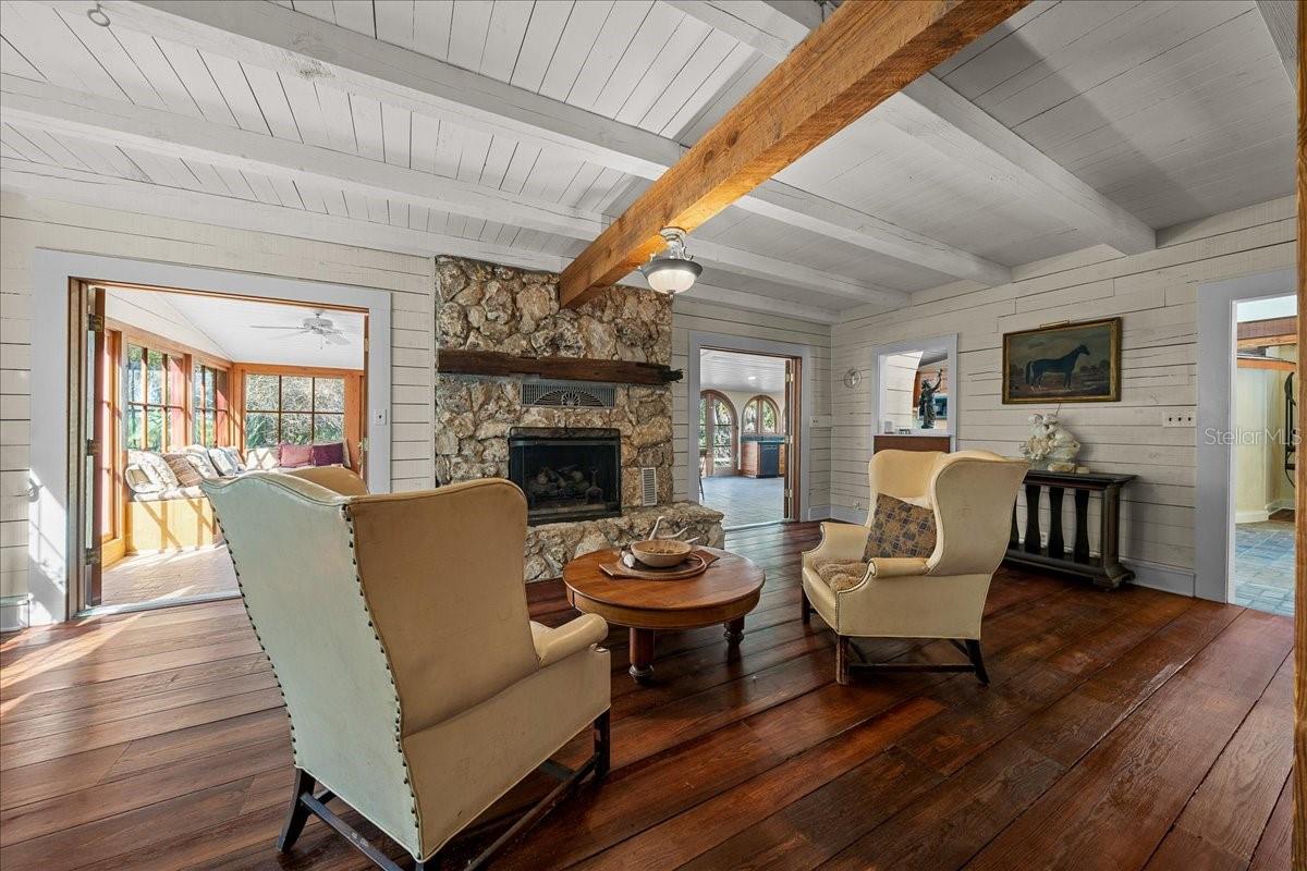 Tucked beneath a canopy of mature live oaks and bordering the natural beauty of the Tuscawilla Preserve, Mosswood Farm offers a rare blend of privacy, craftsmanship, and fully developed equestrian amenities across 16.27 picturesque acres. Designed with the horse enthusiast in mind, the property features 12 well-appointed stalls across two barns, including a classic center-aisle barn and a functional shed-row barn, providing flexibility for training, boarding, or private use. Riders will appreciate the two professionally leveled arenas, one fully equipped with lighting, creating an exceptional setting for evening rides, schooling, or private events. At the heart of the property stands a stunning 4,500-square-foot custom log residence, rich in architectural detail and natural materials. A dramatic two-story foyer welcomes you into a home filled with warmth and natural light, highlighted by brick and river pine flooring, cypress cabinetry, custom doors and windows, and two natural-stone fireplaces that anchor the main living spaces with an additional fireplace in the second bedroom! The thoughtfully designed kitchen is complemented by a butler’s pantry with an additional dishwasher accessed through a distinctive custom turret, adding both function and character rarely found in modern construction. The main-level primary suite offers a peaceful retreat with a private sitting area, his-and-hers bathrooms, and a spacious walk-in closet. Upstairs, two guest bedrooms are connected by an unconventional Jack-and-Jill bath with shared closet access, while a separate spiral staircase leads to an expansive loft-style living room—perfect for a media lounge, studio, or additional gathering space. Practical enhancements including a whole-property generator system, newer roof, and updated windows ensure comfort, efficiency, and peace of mind. Whether envisioned as a private equestrian sanctuary, boutique training facility, or countryside estate retreat, Mosswood Farm delivers a unique opportunity to own a thoughtfully developed horse property in a naturally preserved setting—just moments from the conveniences of town while feeling worlds away!