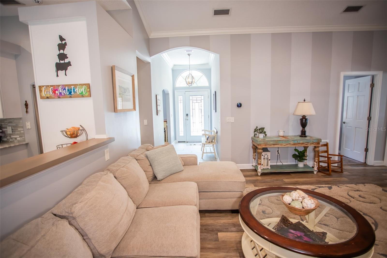 Discover serene waterfront living at its finest in this beautifully remodeled 4-bedroom, 3-bathroom home spanning 2,281 sq ft. Nestled on a cul-de-sac with 112 feet of navigable river frontage. The private dock offers incredible potential for waterfront enjoyment, though the dock is in need of repair and priced accordingly. The heart of the home is a fully renovated kitchen featuring granite countertops, a farmhouse undermount sink, stainless steel appliances, a sleek stainless hood, and 42'' soft-close cabinets. The formal dining room boasts two arched entrance ways, crown molding and elegant chair rail. Vinyl plank floors flow throughout the main living areas, with carpeted bedrooms, complemented by updated bathrooms with new cabinets and countertops. The 3 guest rooms offer ample closet space with one room having its own custom, built-in bunk beds. Additional upgrades include new interior doors, drywall, and a transferable Ramjack Lifetime Foundation Warranty. Enjoy Florida's outdoor lifestyle with an enclosed lanai and a spacious open deck, new playground perfect for your family or family to come, ideal for entertaining. The property also offers a detached 2-car garage workshop, extra parking for boats or RVs, and ample driveway space. Located in a tranquil neighborhood with no HOA, this home combines comfort, functionality, and waterfront charm. Washer/Dryer, Refrigerator in garage, & playground in backyard included in the sale of this home with acceptable offer!