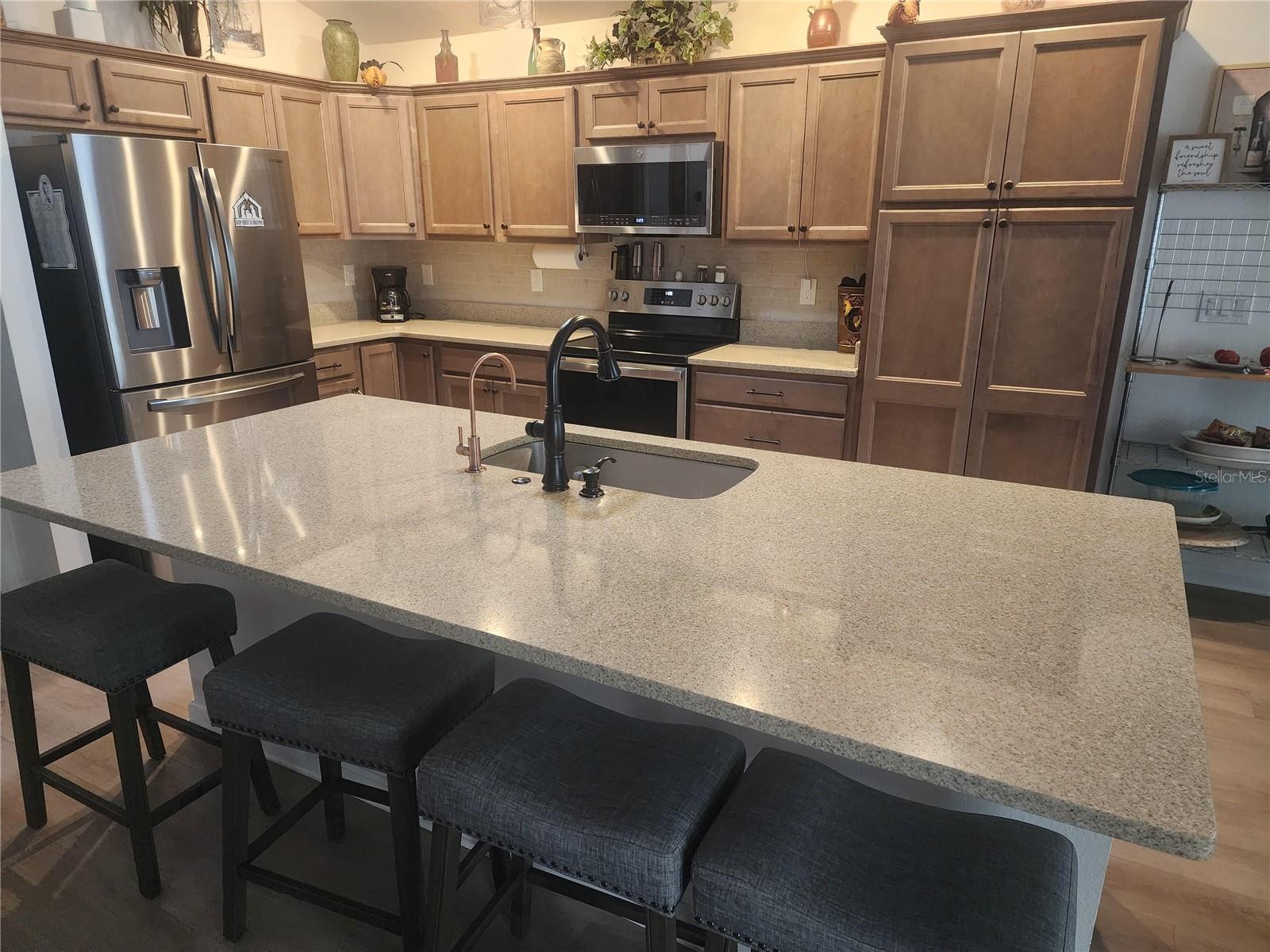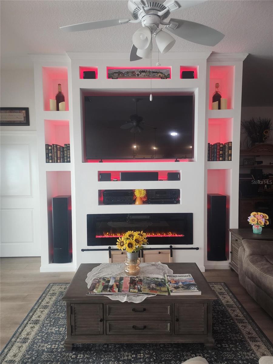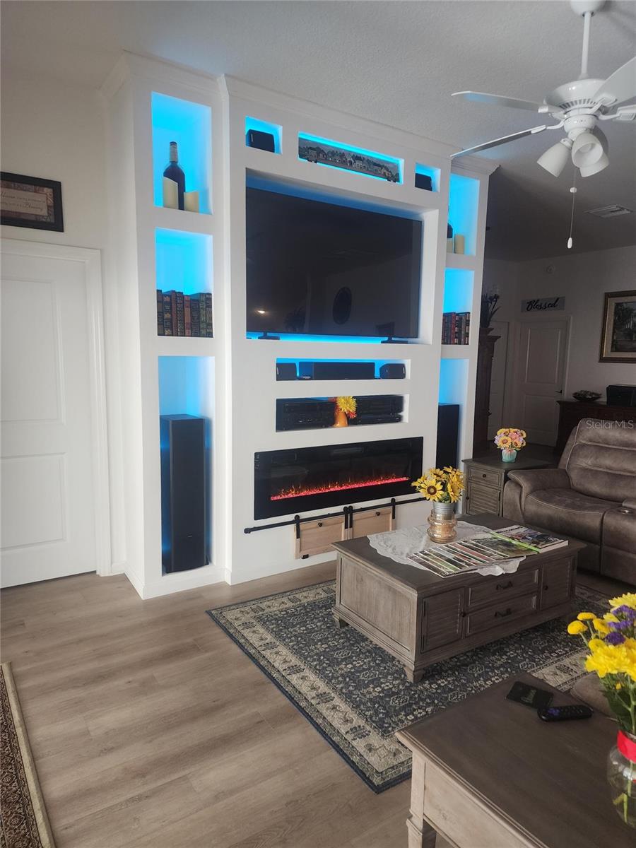 Almost new house with 4 good sized bedrooms and large open living area, all on one floor. Huge expanded garage with golf cart addition. Huge expanded lanai with wood-look porcelain tile. All countertops are quartz and fixtures are dark rubbed bronze. Luxury vinyl plank flooring throughout the whole house. Living room has a custom media wall with LED lighting, 70" Samsung TV, high end stereo system with 5 speakers and 60" electric fireplace that all stay with the house. Large master suite with vaulted ceiling. Master bath has dual, modern, rectangular sinks, big walk-in closet and roman shower. Kitchen has under cabinet lighting with tiled backsplash and solar tube skylight. Also comes with gas tankless water heater and french door refrigerator. Ceiling fans w/lights in every room, (7 total). Back yard has custom landscaping with fire pit, patio, koi pond, flower beds and small vegetable garden all enclosed with vinyl fencing. Great location in Middleton. You won't find a better non-age-restricted neighborhood in Florida. Built by The Villages, the biggest and best retirement community in the country. This house is very close, easy walk to The Villages School. Also, to downtown Middleton, a rapidly expanding hub of dining and activity. And very short walk to the pool and Lake Harlow park with tennis, basketball and pickleball courts. Very quiet side street with almost no traffic, fenced in back yard and great respectful neighbors. Truly a great location.