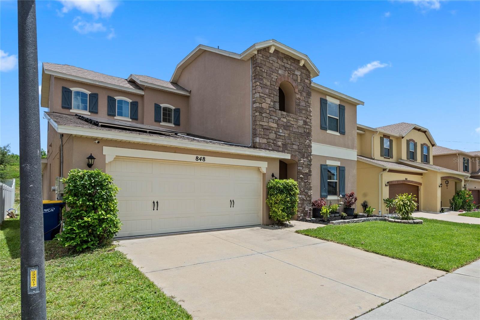 Welcome to 848 Boxelder Ave, a stunning 2-story home built by Cal Atlantic Homes in the highly desirable Reserve at Minneola community. This exquisite residence offers unparalleled privacy with no rear neighbors and features a striking stacked stone façade and updated landscaping. The eco-conscious buyer will appreciate the 11.6 kW solar system, which offsets your power bill significantly. The open floor plan is accentuated by tile flooring throughout the main living spaces and a large great room adjacent to a spacious kitchen with 42" upper cabinets, stainless steel appliances, and a large island. The downstairs master suite is a retreat with a coffered ceiling, walk-in closet, and a luxurious ensuite bathroom featuring a garden tub, large shower, and dual-sink vanity. The separate formal dining room and family room offer versatile living spaces to suit your lifestyle needs. The spacious backyard offers 26 feet of buildable space, perfect for creating your outdoor oasis. The second floor boasts a game room / loft, ideal for family hangouts. Four additional good sized bedrooms, two guest baths, and ample storage complete the second story. The community amenities include two resort-style pools and a playground. Located just five minutes from the Florida Turnpike, this home provides easy access to major roadways and is zoned for top-rated Lake County schools. It is also conveniently close to shopping, restaurants, parks, and more. Schedule your private showing today and experience the exceptional lifestyle this home offers.
