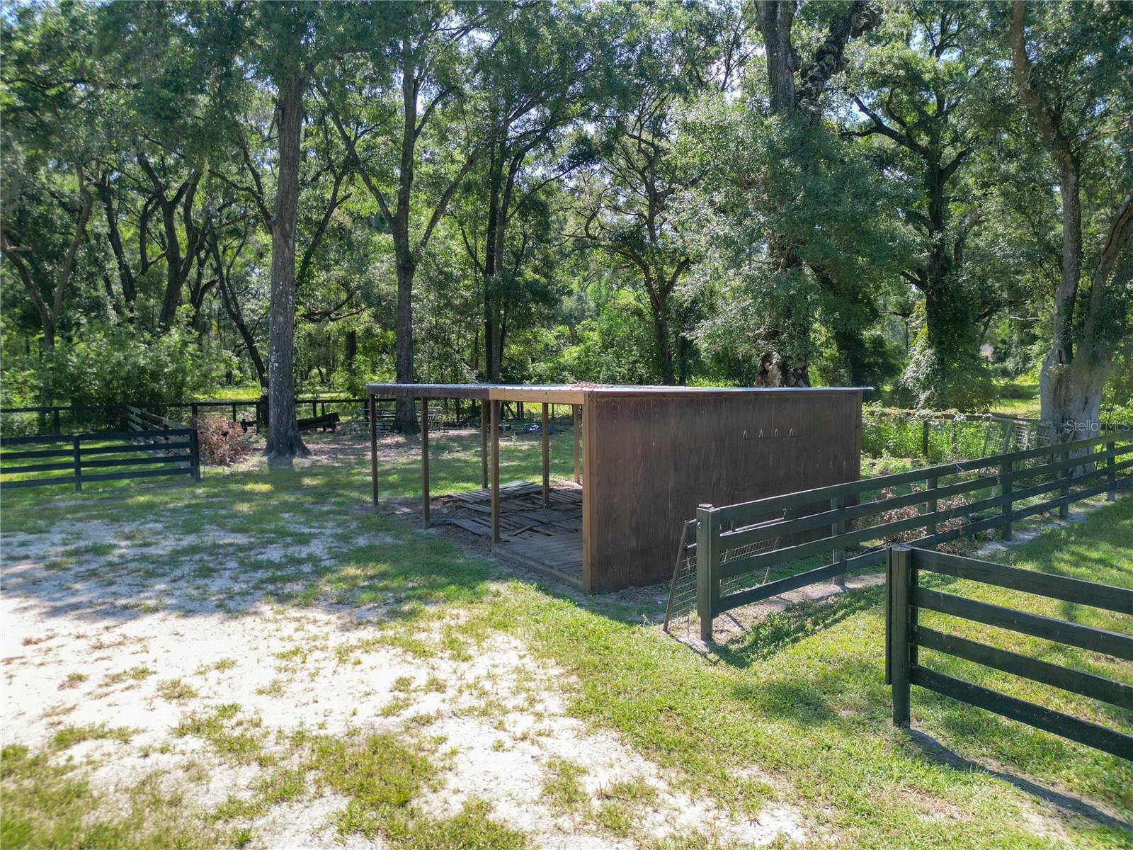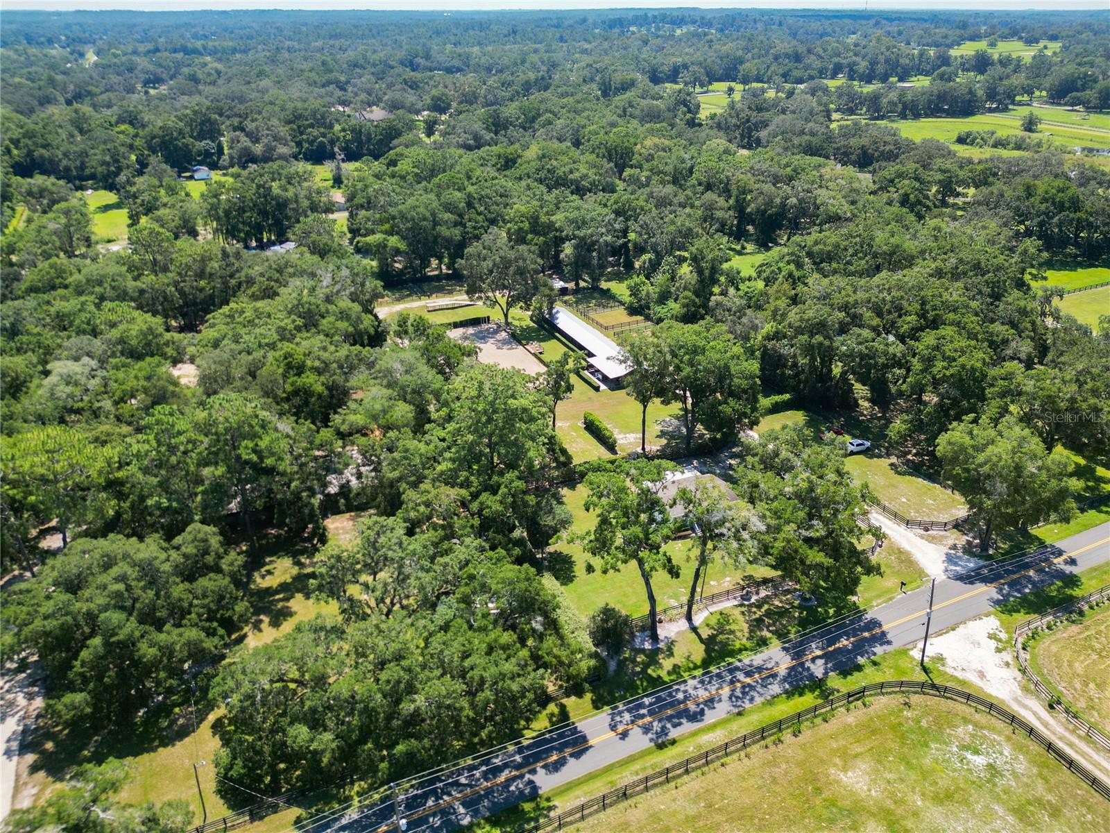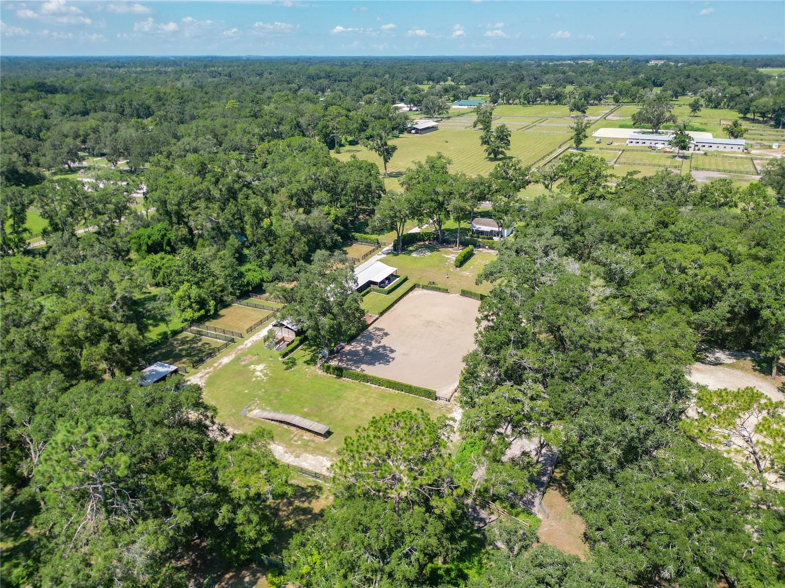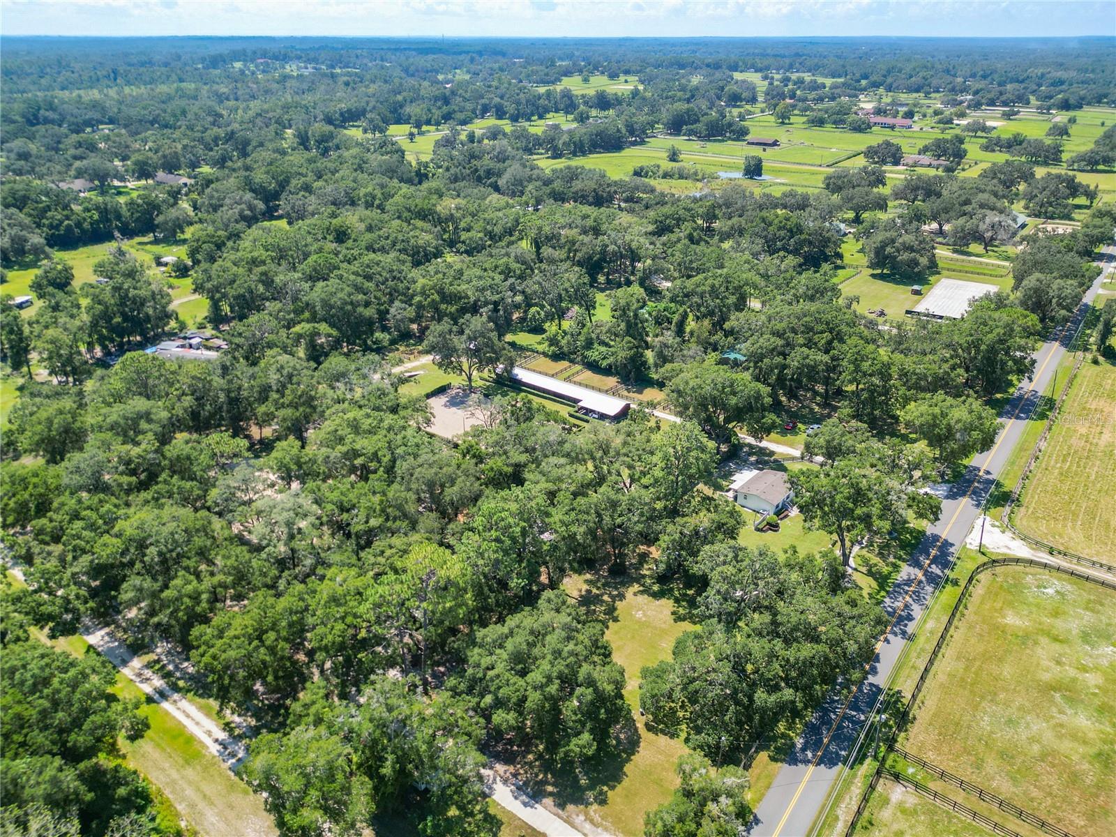 With huge income potential and a convenient location just 0.1 miles from HITS and a short drive from the World Equestrian Center, this beautifully maintained mini farm is purpose-built for equestrians looking to get the most out of Ocala’s Horse Country. Fenced and gated, the property features 3 acres that has been designed for ease of use by and for equestrians, all gently shaded by mature oaks. The 10-stall shedrow-style barn is thoughtfully outfitted with spacious feed and tack rooms, a covered wash rack, and a full bathroom and utility station complete with a refrigerator, microwave, and washer. Each stall is paired with its own paddock, while two covered grooming stalls and a tack room-adjacent lounge area provide added convenience and comfort for both horses and riders. A 100' x 175' arena is outfitted with clay fiber footing, providing plenty of space for training year-round. Those looking to accommodate long-term or seasonal renters will appreciate the four 50-amp RV hookups, each equipped with water, electric, and septic connections. A 24' x 16' equipment shed adds secure storage options for farm tools, large equipment, or tenant use. At the heart of the property sits a recently renovated 3-bedroom, 2-bathroom cottage offering approximately 1,080 square feet of light-filled living space. The open-concept great room flows effortlessly from the living area to the modern kitchen with stainless steel appliances, a breakfast bar, and a pantry. A convenient laundry area with a stacked washer and dryer sits just off the kitchen for everyday ease. The primary suite boasts a walk-in closet and a private en-suite bathroom with glass-door shower and generous counter space. For moments of rest and relaxation, a screen-enclosed patio with ceiling fans overlooks one of the nearby paddocks—perfect for quiet evenings after a full day in the barn. With a new roof installed in late 2020, this property offers peace of mind and immediate functionality, ready for horses, riders, and the season ahead!