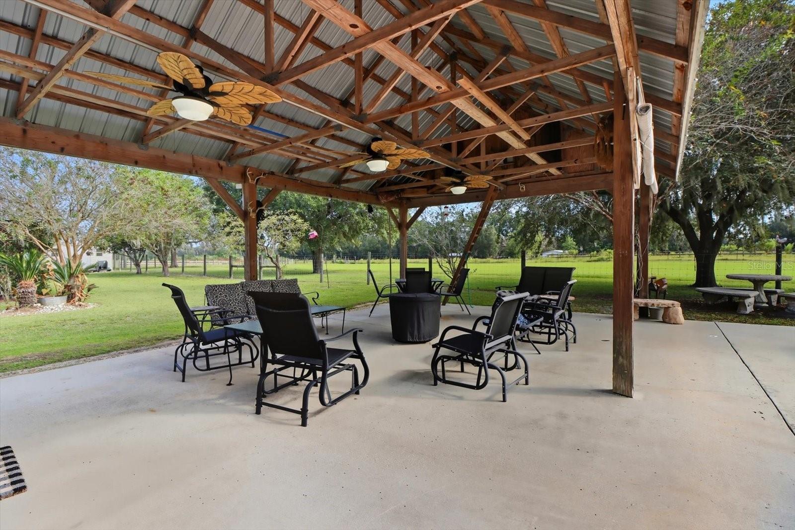 Immaculate Farm house on 27.7 pristine acres ideally located in Morriston, just approximately 3 miles from HITS and 20 minutes to World Equestrian Center. As you enter the gate to this beautiful farm, you drive between lush green pastures, up an oak canopied paved drive to the charming two story farm house complete with wrap around porch and metal roof. The custom home boasts of 3381 sq. ft. of indoor living area with 4 bedrooms, 4 ½ bathrooms, 2 living areas and a large eat in kitchen and over 900 sq. ft. of covered porches. The kitchen is complete with stainless steel appliances, granite counters, large walk-in pantry and a center island, ideal for large and small gatherings. The open concept allows for entertaining, which is enhanced by the flow from kitchen to enclosed lanai to the adjoining large covered outdoor patio with grilling area. The large primary suite is on the first level and has oversized his and hers walk-in closets along with dual sinks, soaking tub and large walk-in shower. There are additional storage and closet areas at the back of the primary bathroom. There is also a second bedroom and full bathroom on the first level, separate from the half bath under staircase adjacent to the family room. Up the staircase, which divides the private second living area from the open concept family/dining/kitchen area, you will find two additional oversized bedrooms and bathrooms, each with walk in closets. For easy maintenance, the entire house is laminate or tile flooring and has been meticulously maintained. This home was designed for farm life functionality with an excellent balance of storage and living space in this home. The large laundry room accesses the outdoors. The spacious laundry has a sink and folding counter. This laundry room has a large sink and folding counter, and also has two storage closets. As you step out onto the concrete area with large covered pavilion, this is an amazing space for entertaining and family memories. A detached three car garage is also accessed from the laundry room via a short, covered walkway for convenient access. The acreage is open, but dotted with oak trees, and was previously used horses and cattle. The pastures have been kept in pristine condition with regular fertilizer and pesticide treatments. There are presently four pastures, which could be further divided and a pond that is stocked with catfish and has a comfortable fishing pier. There are two equipment and tool sheds, along with a large 6 bay pole barn, which could be converted to a horse barn; however, the layout of this farm allows plenty of room to add your dream horse barn and arena. The possibilities for this property are endless with ample acreage for cattle, horse training or breeding and a large, comfortable updated move in ready home in such a coveted area of NW Ocala.