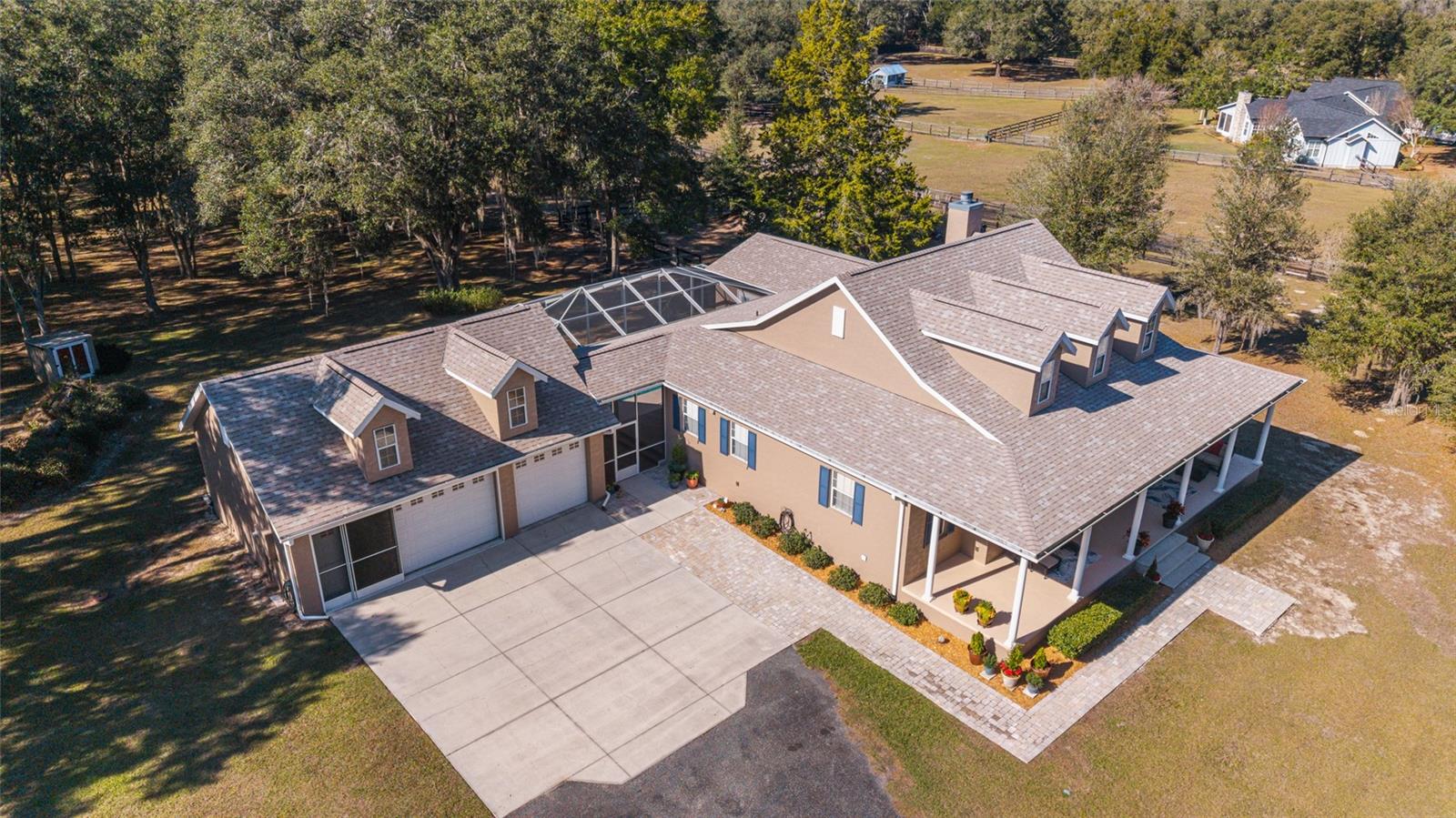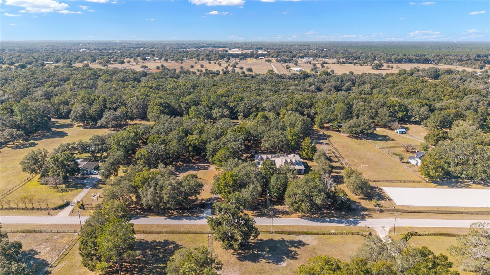 Tucked away on a quiet dead-end road between established private farms, this thoughtfully designed 5.81 acre property offers privacy and timeless Florida charm. Perimeter fenced with an automatic gated entrance, the property is shaded by live oak trees and designed for both comfortable living and versatile use. At the heart of the property is a custom-designed 2-bedroom, 2-bath pool home featuring a dedicated office, ideal for remote work, creative pursuits, or use as a 3rd bedroom. The home boasts ample storage and includes a bonus room flooded with natural light that can accommodate a variety of needs. An oversized three-car garage and workshop provide ample space for vehicles, equipment, and hobbies and a whole house generator ensures that your activities are never interrupted by a power-outage. The inviting farmhouse-style front porch sets the tone—perfect for morning coffee while taking in peaceful views of neighboring pastures and daily equestrian training routines nearby. A separate guest house adds exceptional flexibility, offering a private, 450 sq. ft. studio apartment for family or guests, along with a two-bay, air-conditioned workshop—well suited for storage, projects, or climate-controlled workspace needs. Conveniently located just 4.5 miles from the HITS Show Grounds and approximately 14 miles from the World Equestrian Center, the property also provides easy access to numerous equestrian venues while maintaining a tranquil, country setting. Whether you’re seeking a private retreat, a functional mini-farm, or a property that balances rural serenity with proximity to Ocala’s renowned amenities, this offering delivers versatility, comfort, and location in equal measure. New Roof on Main Home and Guest Home in 2025. Exterior Paint on both homes 2025.