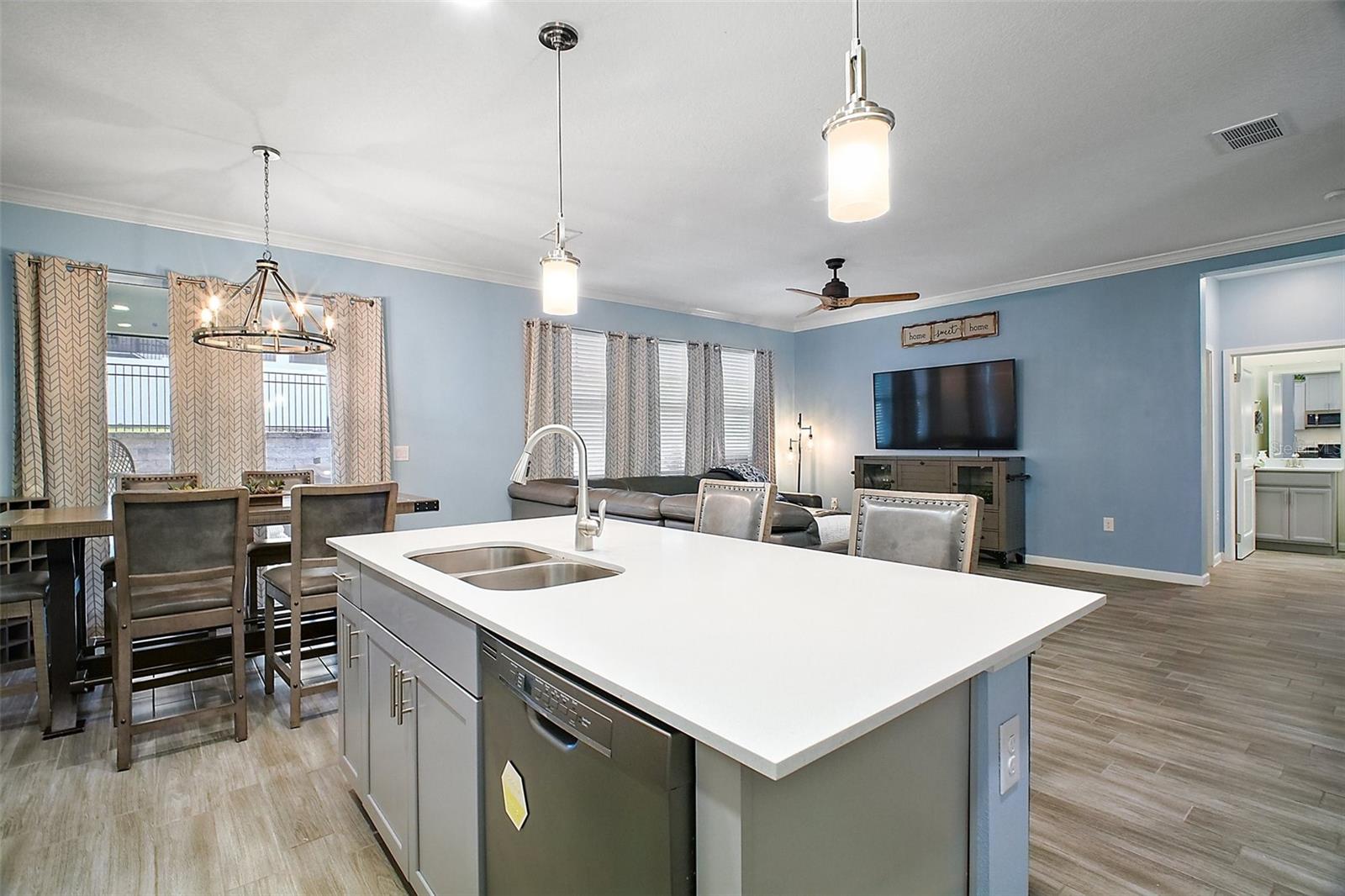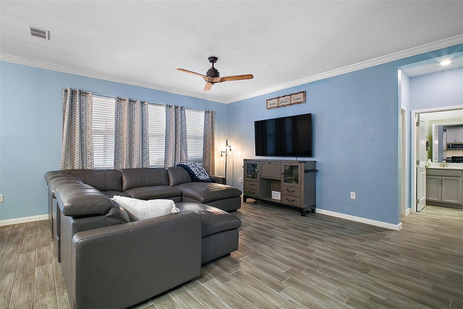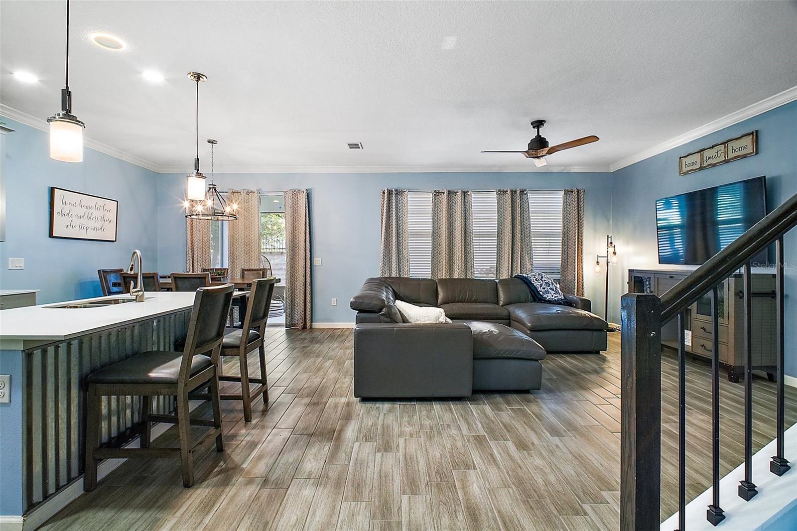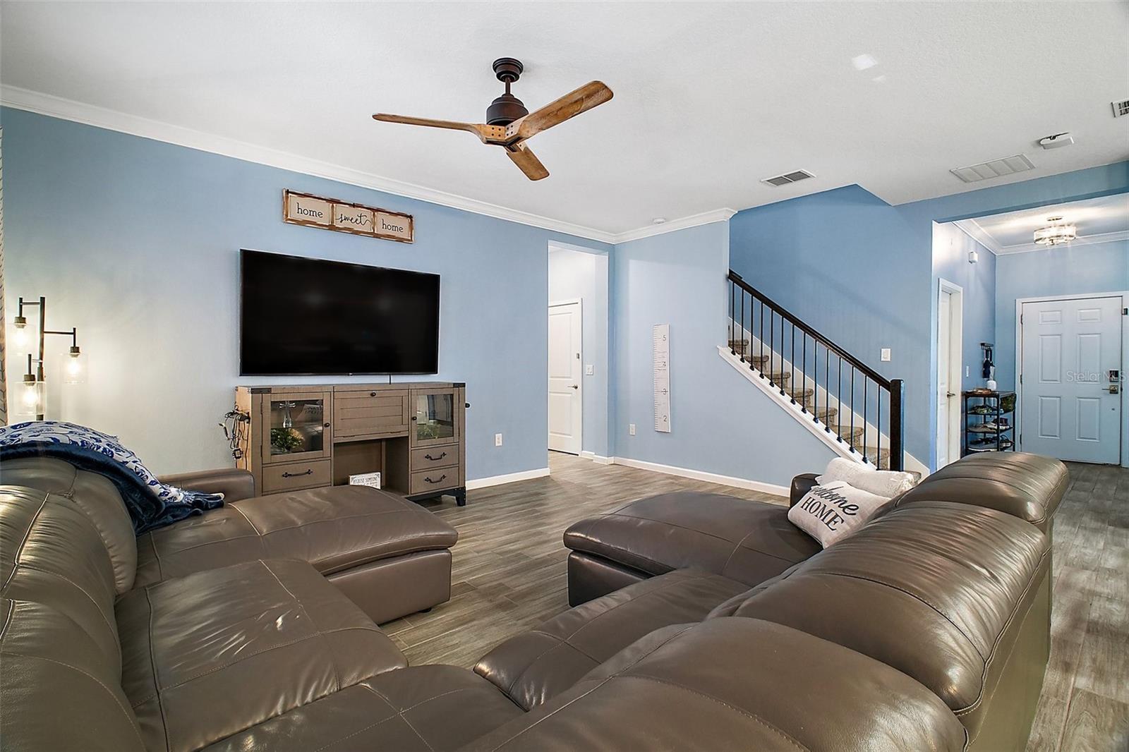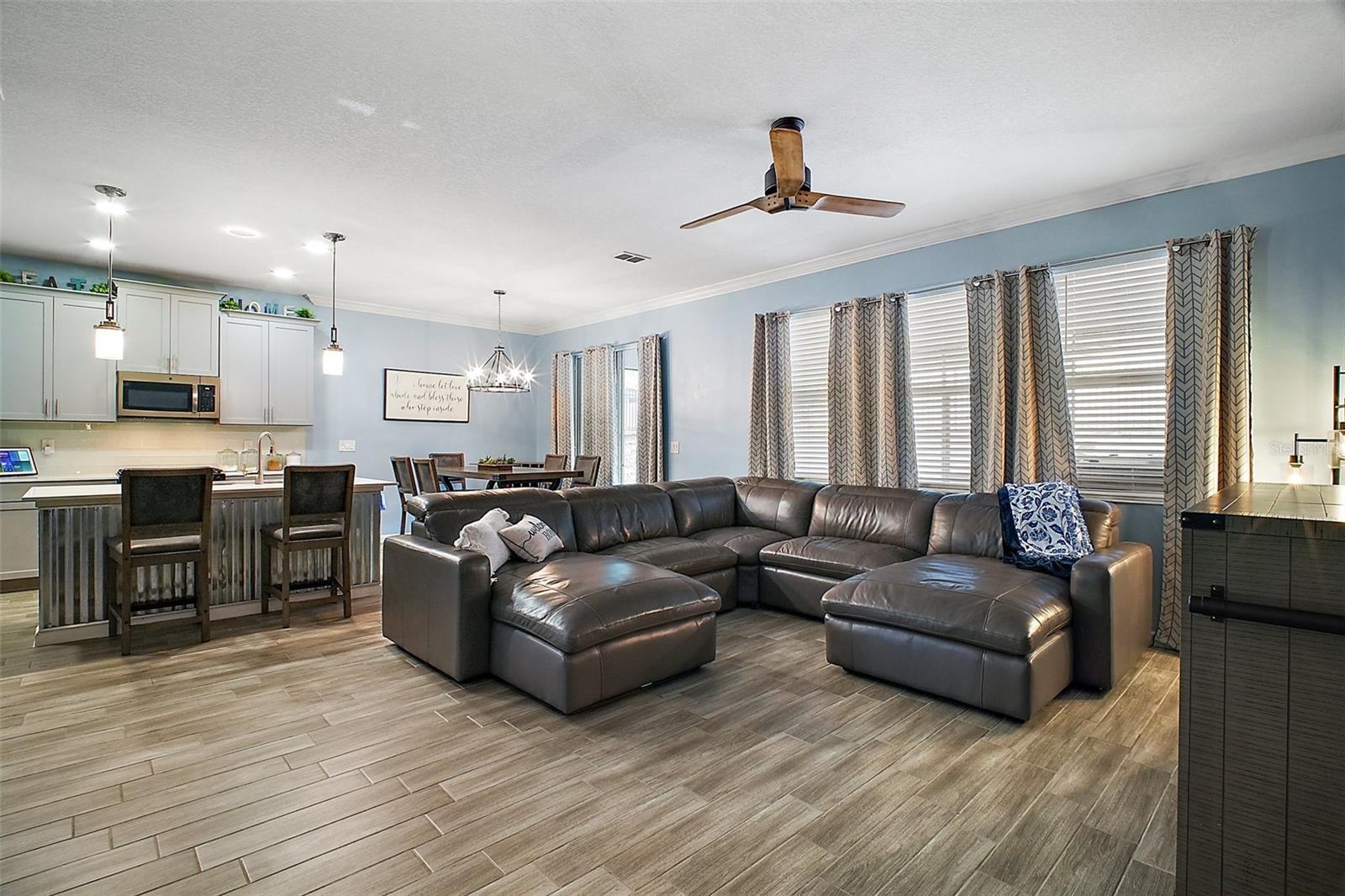 NEW PRICE + MOTIVATED SELLER The sellers are relocating for a job opportunity, which means an incredible chance for you! Welcome to this beautifully appointed two-story home nestled in the exclusive, gated community of Dora Parc in Mount Dora, Florida. This residence offers the perfect blend of modern comfort and lakeside living with private canal access to Lake Dora. The freshly painted exterior invites you to the covered front porch and entry foyer where wood look plank tile flooring, crown molding and volume ceilings flow throughout the main level. The Open-concept design features a spacious living room, dining area, and a well-appointed kitchen with black stainless-steel appliances, gas range, tile backsplash, center island with breakfast bar, and closet pantry. The first floor includes a versatile flex room perfect for office/den/library a bedroom, and a full bath. Upstairs, you'll find the spacious primary suite and ensuite bathroom with separate soaking tub and separate shower, double sinks and custom walk-in closet. Additionally, there are three bedrooms, another full bath with double sinks & tub with shower, a family room, and a convenient laundry room with built in cabinets & plumbed for electric or gas dryer. Equipped with Lennar’s Everything’s Included® and smart home package, this home boasts quartz countertops throughout, natural gas tankless hot water heater, 2 car garage with electric car charger and advanced home automation features like Wi-Fi CERTIFIED™ connectivity, keyless door locks, and ring video doorbell & 2 cameras. Relax year-round on the spacious screened-in back porch, overlooking the private fenced backyard on a corner lot. Dora Parc is a serene, gated community offering residents private canal access to Lake Dora, part of the expansive Harris Chain of Lakes. Enjoy sunsets, boating, fishing, and water sports right from your neighborhood. Located less than a mile from historic, golf cart friendly, downtown Mount Dora, you'll have easy access to charming boutiques, award-winning restaurants, parks, boat ramp and cultural events. The community's proximity to major highways ensures a convenient commute to Orlando and surrounding areas. The Swim spa (valued at Approx $22K), trampoline, refrigerator in garage, washer and dryer combo are negotiable. Sellers assistance with Buyers closing costs is negotiable with acceptable offer!!