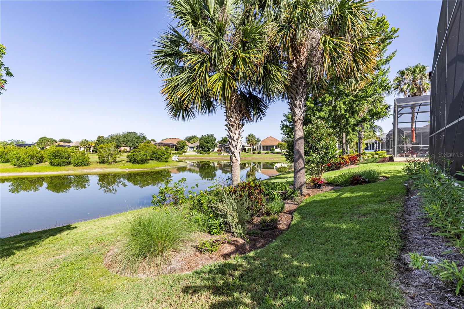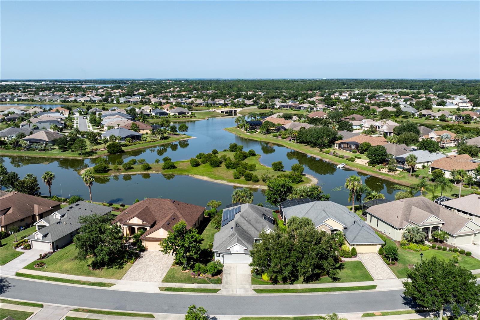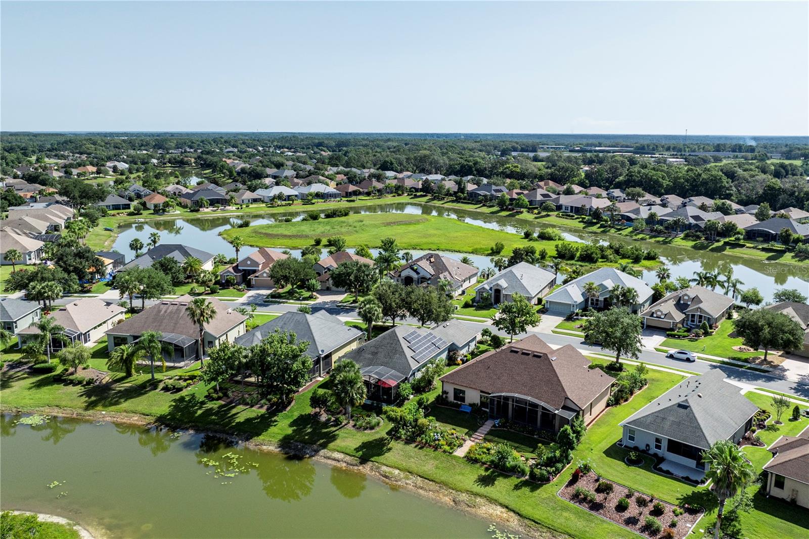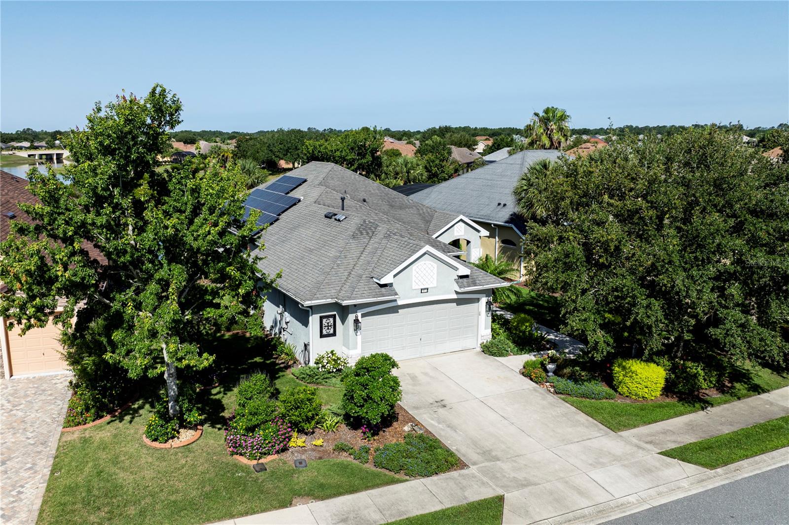 Now available is a truly stunning waterfront home in the highly desirable Lakes of Mount Dora community. This home has undergone an extensive transformation over the past six years, resulting in a thoughtfully designed and meticulously executed floor plan. This beautiful home features two comfortable bedrooms, two full bathrooms, a cozy home office with extra storage (perfect for a remote worker or crafter), and an exceptionally spacious 650 SF garage with 4x16 overhead storage. The paid-off solar panel system keeps the average monthly electric bill remarkably low at just $21. Approaching the residence, you will immediately appreciate the beautifully manicured landscaping. A uniquely designed screened-in courtyard has a security gate and offers a wonderful private area for seating and relaxation. The arched solid mahogany front door creates a striking first impression, hinting at the beauty within. Upon entering, you will be greeted by an open floor plan enhanced by luxury vinyl flooring throughout and an expansive kitchen. The high ceilings and abundant windows flood the home with natural light. The kitchen is truly a highlight, boasting abundant storage with convenient pullouts in every cabinet, stainless steel appliances, and a gorgeous, oversized island perfect for entertaining and providing even more storage. The storage theme continues into the 4x10 walk-in pantry with custom shelving. The perfect place for your coffee bar! The primary suite is a delightful retreat, offering water views, more luxury vinyl flooring, an en-suite bathroom and an oversized walk-in closet. The en-suite bathroom features tile floors, dual sinks, and a step-free shower. The walk-in closet has been thoughtfully designed with built-in organizers and conveniently houses a stackable washer and dryer. The second well-sized bedroom and updated second bathroom are ideal for family and guests. From the living room, sliding doors lead out to the rear screened-in lanai, where you can enjoy breathtaking sunsets over the water – the perfect spot for evening relaxation. The 10x10 pergola will remain with the home, offering a lovely, shaded space even during afternoon showers. The Lakes of Mount Dora has so much to offer to its Residents! This community offers 4.5 miles of interconnecting waterways, RV and boat storage, state of the art Clubhouse, pickleball, tennis, a fitness center, card room, billiard room, craft room, a Grand Ballroom for social gatherings and is close to downtown Mount Dora and all that Mount Dora and Lake County has to offer. You are located just a short distance to Restaurants, Shopping and major highways. This isn't just a home; it's a lifestyle. It's the tranquility of waterfront living, the convenience of a thoughtfully renovated space, and the pride of ownership in a highly sought-after community. Don't miss the opportunity to make this exceptional Lakes of Mount Dora residence your own, You do not want to miss out on this Opportunity! All information recorded in the MLS is intended to be accurate; however, it should be independently verified by buyer and their agent.