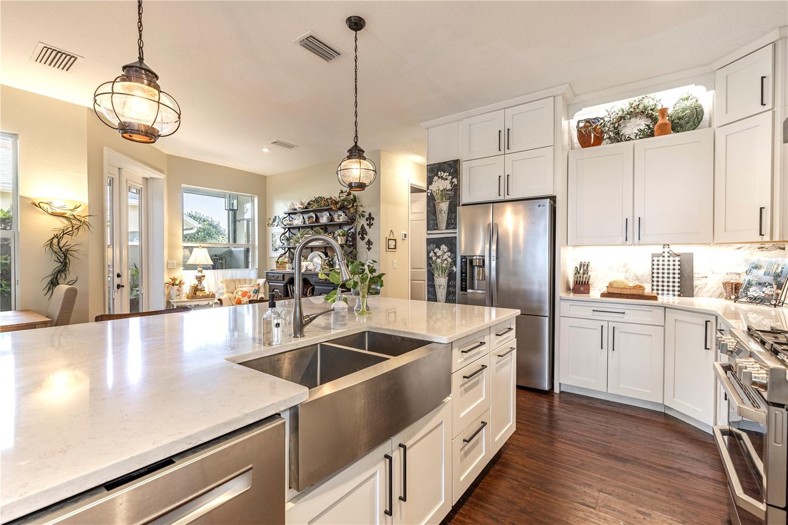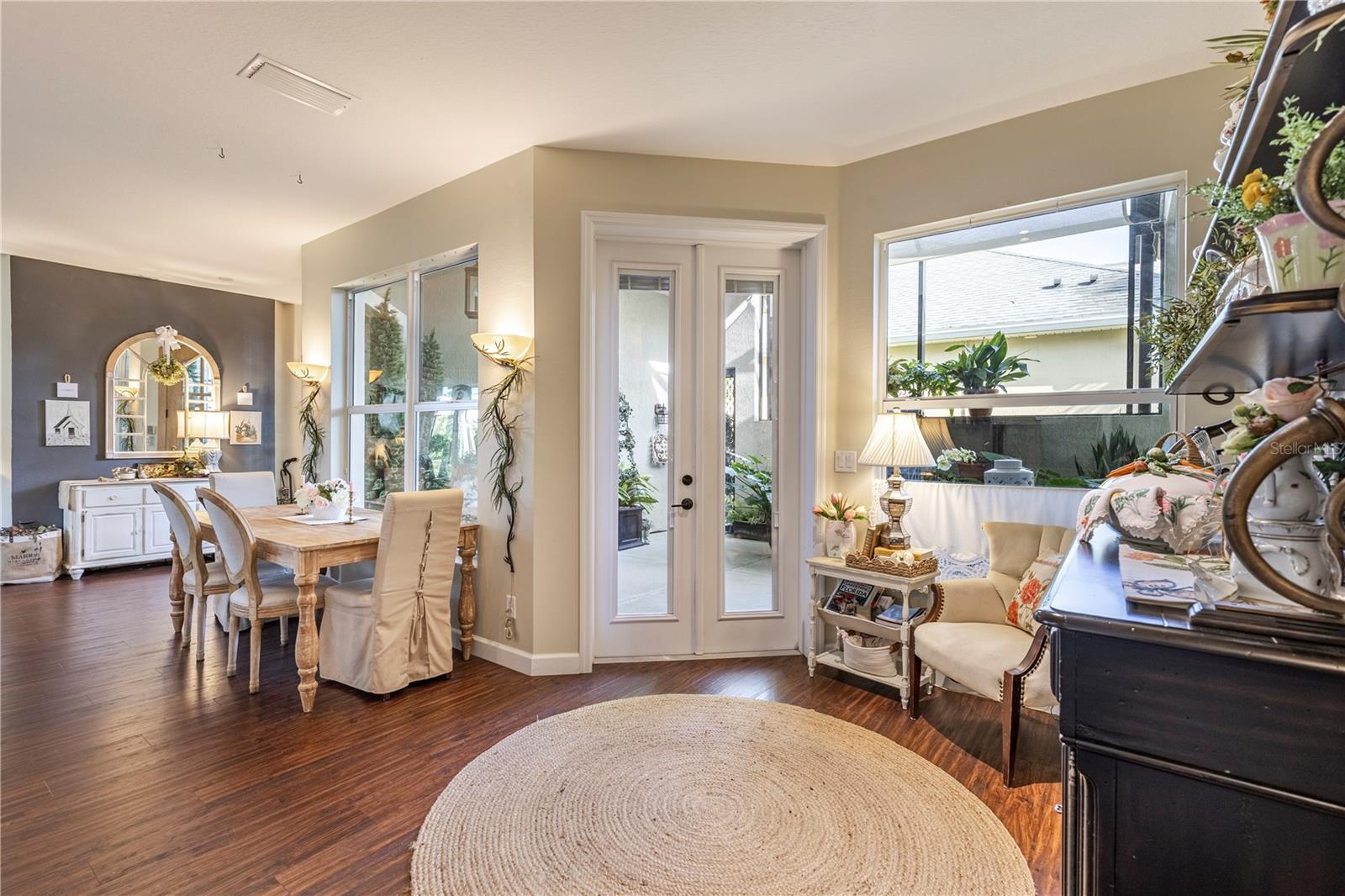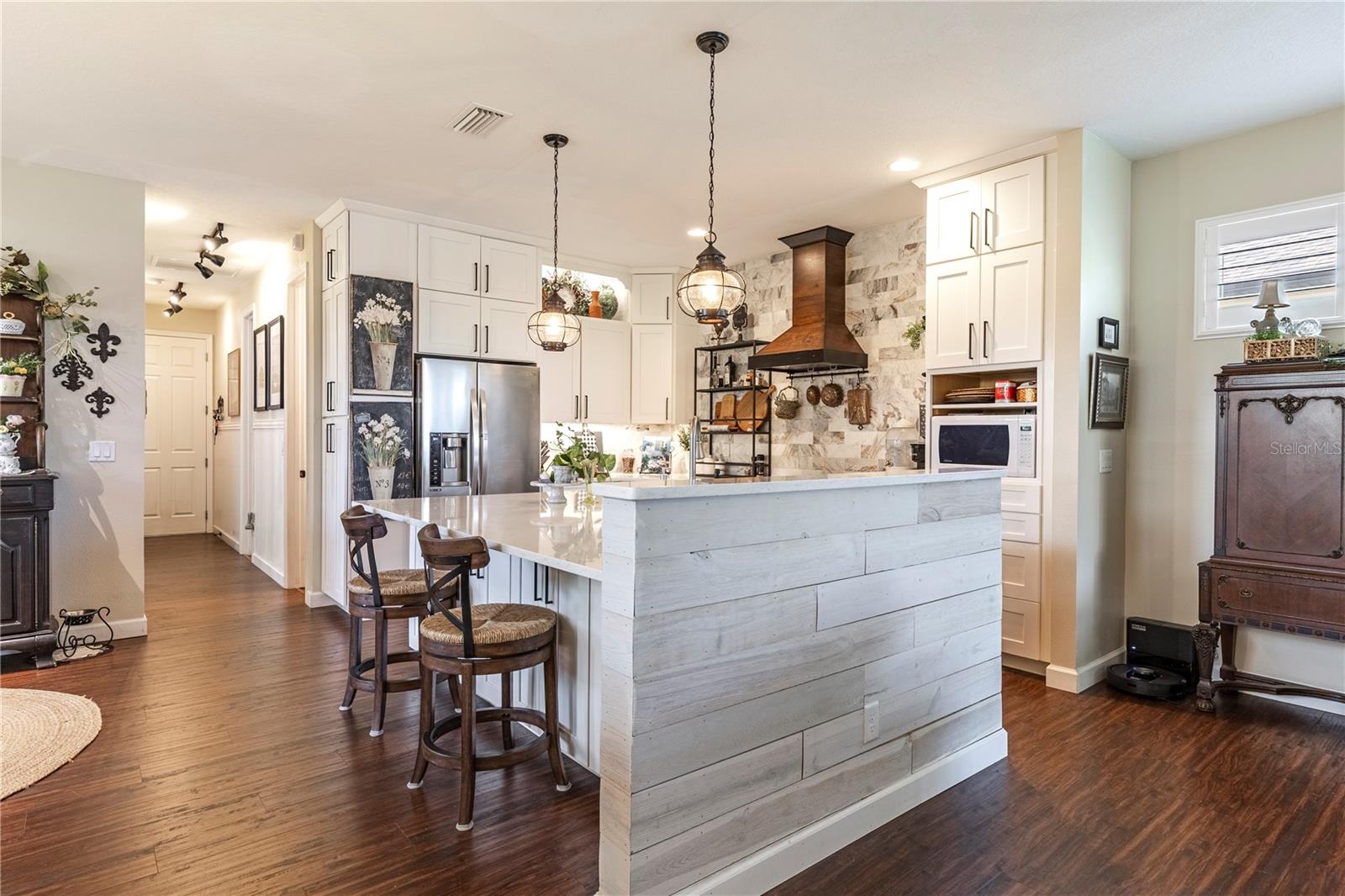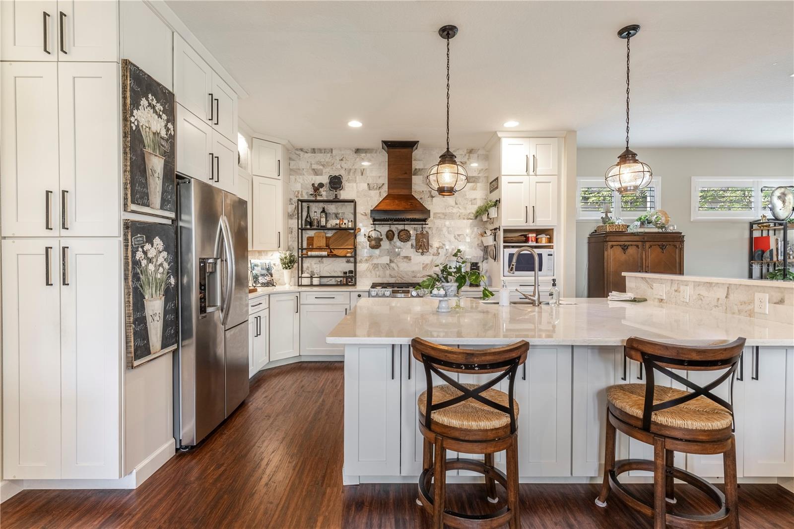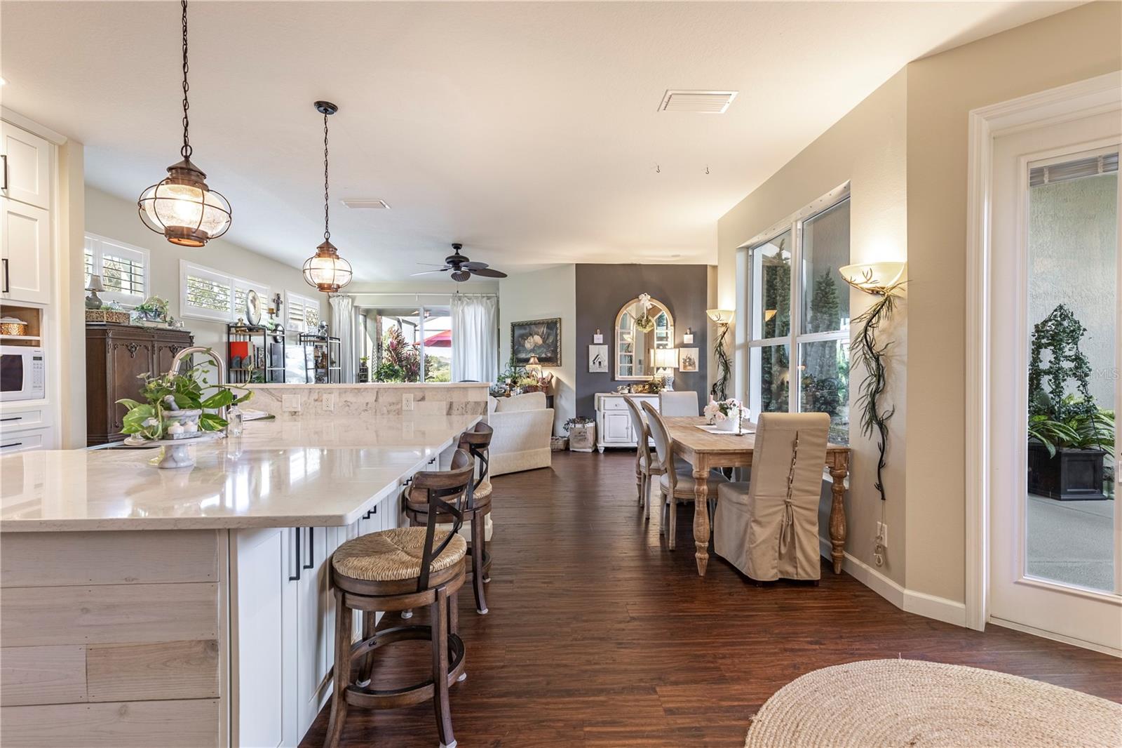 Now available is a truly stunning waterfront home in the highly desirable Lakes of Mount Dora community. This home has undergone an extensive transformation over the past six years, resulting in a thoughtfully designed and meticulously executed floor plan. This beautiful home features two comfortable bedrooms, two full bathrooms, a cozy home office with extra storage (perfect for a remote worker or crafter), and an exceptionally spacious 650 SF garage with 4x16 overhead storage. The paid-off solar panel system keeps the average monthly electric bill remarkably low at just $21. Approaching the residence, you will immediately appreciate the beautifully manicured landscaping. A uniquely designed screened-in courtyard has a security gate and offers a wonderful private area for seating and relaxation. The arched solid mahogany front door creates a striking first impression, hinting at the beauty within. Upon entering, you will be greeted by an open floor plan enhanced by luxury vinyl flooring throughout and an expansive kitchen. The high ceilings and abundant windows flood the home with natural light. The kitchen is truly a highlight, boasting abundant storage with convenient pullouts in every cabinet, stainless steel appliances, and a gorgeous, oversized island perfect for entertaining and providing even more storage. The storage theme continues into the 4x10 walk-in pantry with custom shelving. The perfect place for your coffee bar! The primary suite is a delightful retreat, offering water views, more luxury vinyl flooring, an en-suite bathroom and an oversized walk-in closet. The en-suite bathroom features tile floors, dual sinks, and a step-free shower. The walk-in closet has been thoughtfully designed with built-in organizers and conveniently houses a stackable washer and dryer. The second well-sized bedroom and updated second bathroom are ideal for family and guests. From the living room, sliding doors lead out to the rear screened-in lanai, where you can enjoy breathtaking sunsets over the water – the perfect spot for evening relaxation. The 10x10 pergola will remain with the home, offering a lovely, shaded space even during afternoon showers. The Lakes of Mount Dora has so much to offer to its Residents! This community offers 4.5 miles of interconnecting waterways, RV and boat storage, state of the art Clubhouse, pickleball, tennis, a fitness center, card room, billiard room, craft room, a Grand Ballroom for social gatherings and is close to downtown Mount Dora and all that Mount Dora and Lake County has to offer. You are located just a short distance to Restaurants, Shopping and major highways. This isn't just a home; it's a lifestyle. It's the tranquility of waterfront living, the convenience of a thoughtfully renovated space, and the pride of ownership in a highly sought-after community. Don't miss the opportunity to make this exceptional Lakes of Mount Dora residence your own, You do not want to miss out on this Opportunity! All information recorded in the MLS is intended to be accurate; however, it should be independently verified by buyer and their agent.