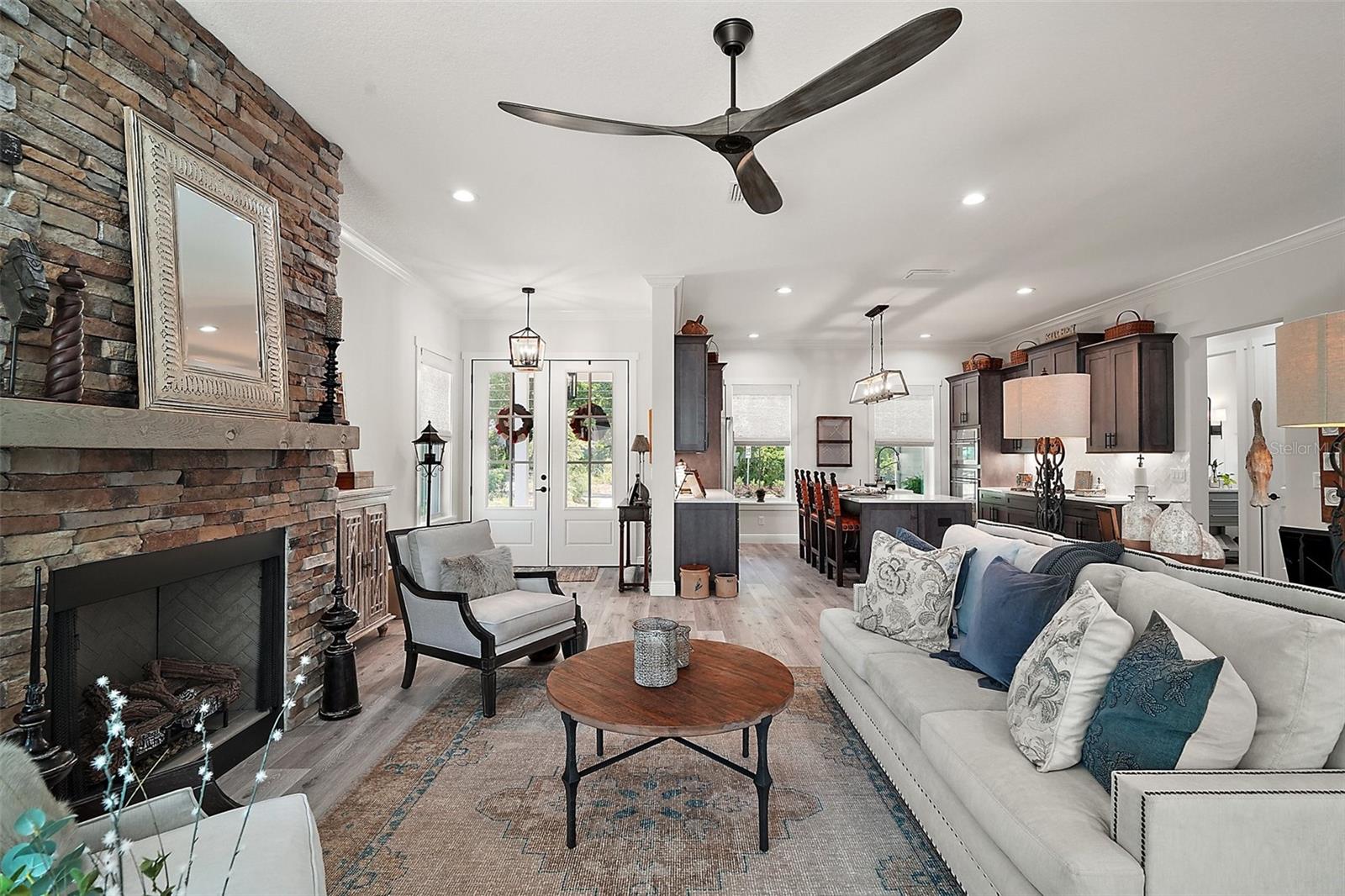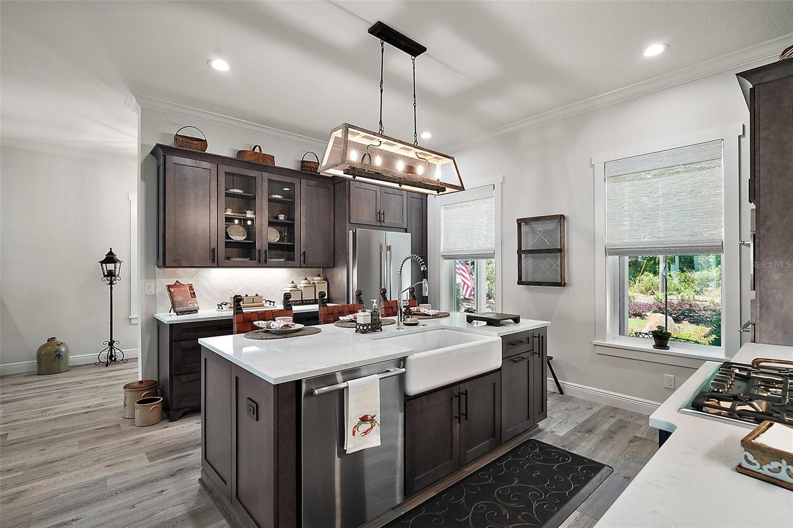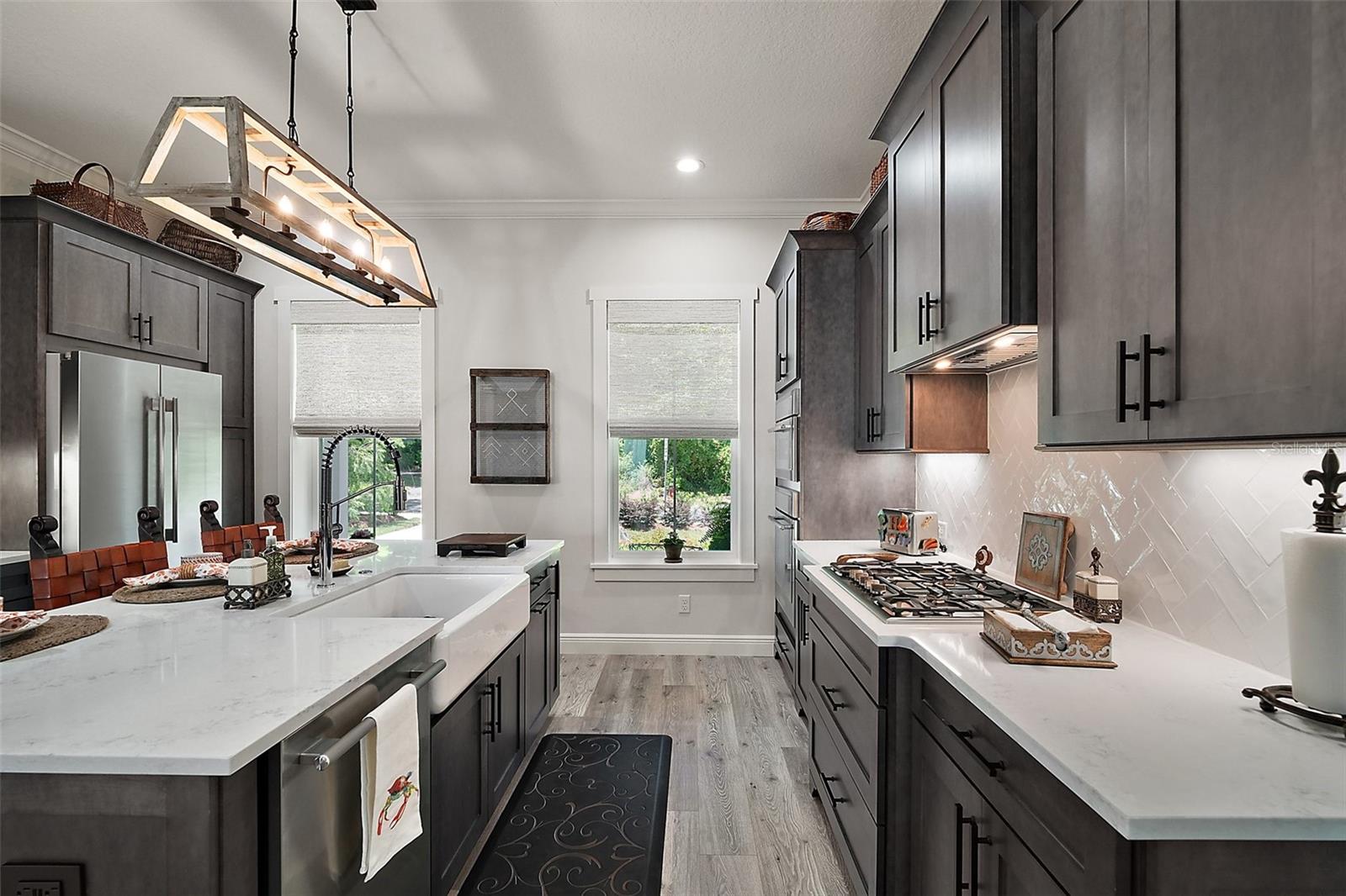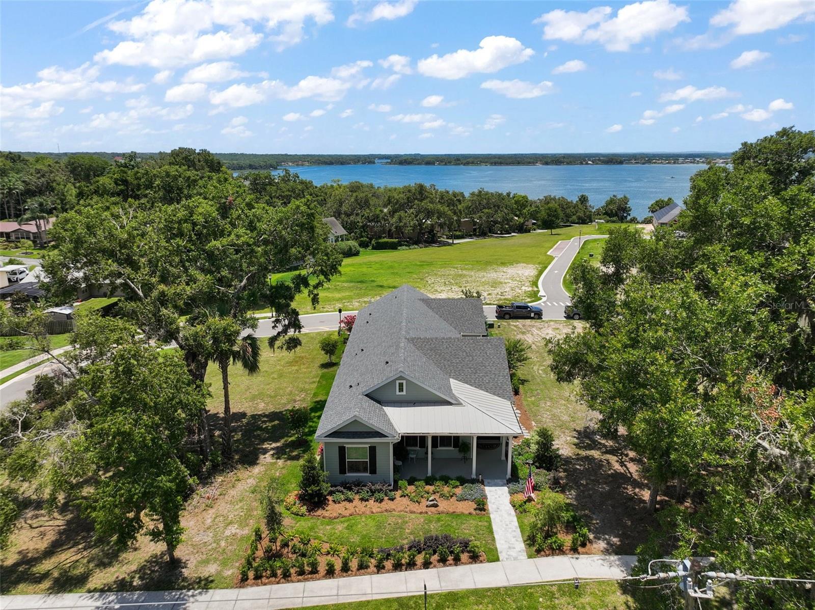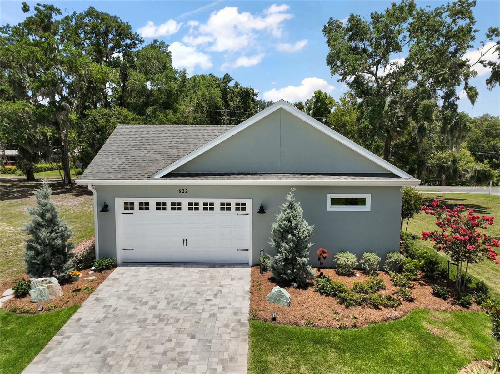 Welcome to 622 W 11th Avenue, a stunning 2024 custom-built home by Kevco Builders located in the highly desirable Cottages on 11th neighborhood in historic Mount Dora. This thoughtfully designed residence combines timeless charm with modern luxury and is just blocks from downtown shops, restaurants, parks, and the Lake Dora waterfront. From the moment you arrive, you'll be captivated by the home’s inviting curb appeal, accent metal roof, shutters, flagstone walkway, professional landscaping, and peaceful lake views beyond. Step inside to discover a beautifully appointed interior featuring crown molding throughout, solid core doors, 3" trim and return molding on all windows, and laminate wood flooring throughout. The open concept living area is anchored by a custom stone fireplace with gas logs and barn doors add a touch of farmhouse elegance to both the living room and owner’s suite. The gourmet kitchen showcases custom cabinetry, quartz countertops, a subway tile backsplash in a herringbone pattern, Thermador stainless steel appliances, gas cooktop, farmhouse sink, center island and decorator lighting. The owner's suite is a peaceful retreat with shiplap detailing, a spa-style bath with glass barn door shower enclosure, garden tub, double vanity with custom cabinets & custom mirrors and large walk in closet. The second bath is equally stylish with additional shiplap, walk in shower and high-end finishes. Designer-selected woven wood blinds are installed throughout the home, and the laundry area includes a full-size LG washer and dryer combination unit for added convenience. Exterior features include energy-efficient spray foam attic insulation, MI Energy Efficient Impact Windows, gas tankless hot water heater, seamless gutters, paver driveway and walkways, an acrylic-finished front porch and rear lanai, and an epoxy-coated garage floor. The garage also comes equipped with a Gladiator cabinet and tool organization system. Irrigation and professional landscaping complete this move-in-ready home. Whether you’re enjoying a quiet morning on the porch or entertaining friends on the covered lanai, this home offers the perfect blend of comfort, efficiency, and style in one of Mount Dora’s most walkable and charming communities.