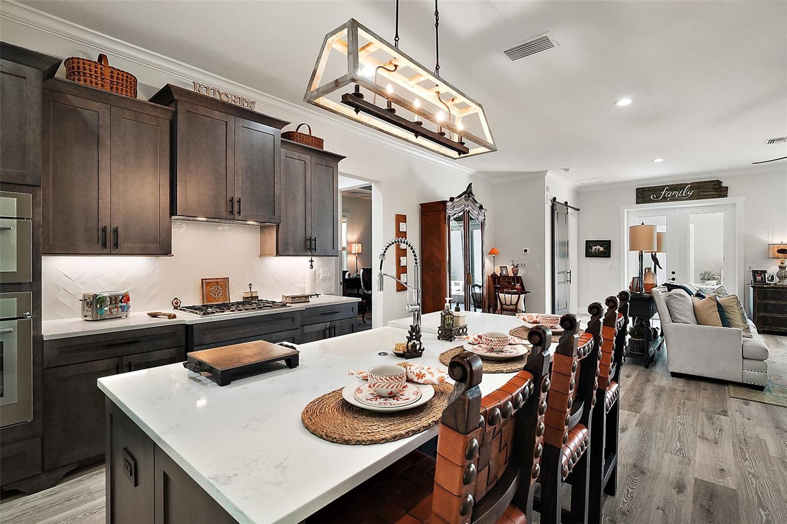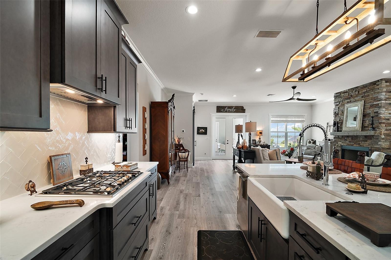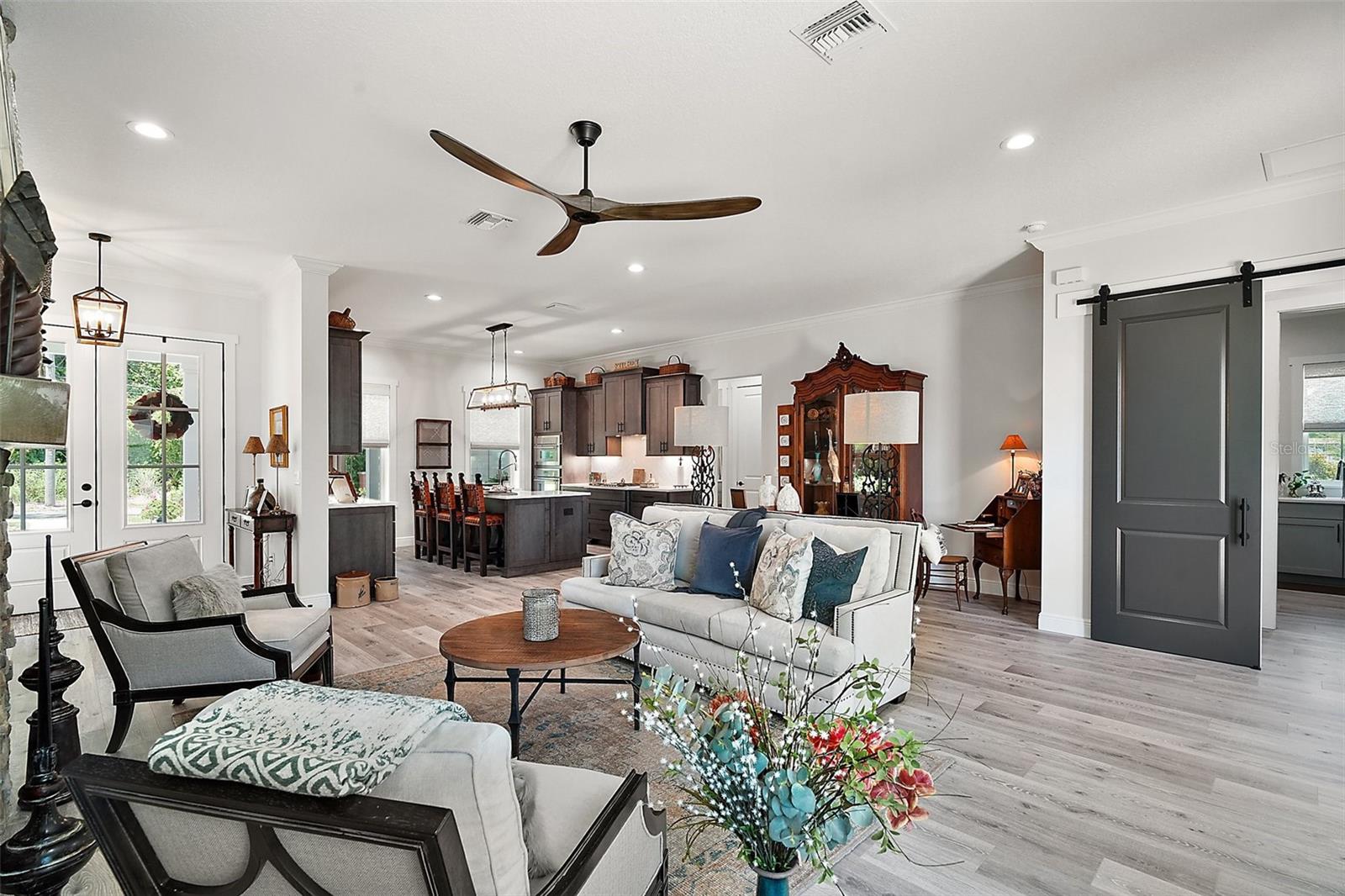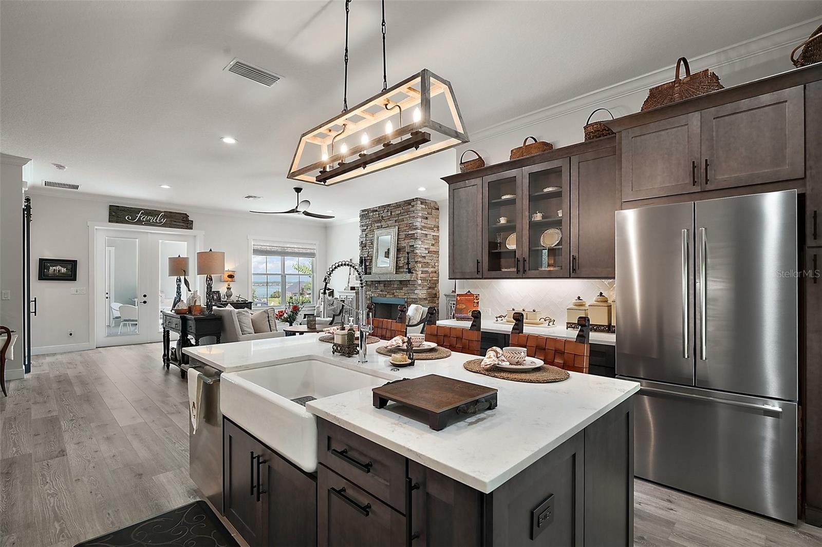 Welcome to 622 W 11th Avenue, a stunning 2024 custom-built home by Kevco Builders located in the highly desirable Cottages on 11th neighborhood in historic Mount Dora. This thoughtfully designed residence combines timeless charm with modern luxury and is just blocks from downtown shops, restaurants, parks, and the Lake Dora waterfront. From the moment you arrive, you'll be captivated by the home’s inviting curb appeal, accent metal roof, shutters, flagstone walkway, professional landscaping, and peaceful lake views beyond. Step inside to discover a beautifully appointed interior featuring crown molding throughout, solid core doors, 3" trim and return molding on all windows, and laminate wood flooring throughout. The open concept living area is anchored by a custom stone fireplace with gas logs and barn doors add a touch of farmhouse elegance to both the living room and owner’s suite. The gourmet kitchen showcases custom cabinetry, quartz countertops, a subway tile backsplash in a herringbone pattern, Thermador stainless steel appliances, gas cooktop, farmhouse sink, center island and decorator lighting. The owner's suite is a peaceful retreat with shiplap detailing, a spa-style bath with glass barn door shower enclosure, garden tub, double vanity with custom cabinets & custom mirrors and large walk in closet. The second bath is equally stylish with additional shiplap, walk in shower and high-end finishes. Designer-selected woven wood blinds are installed throughout the home, and the laundry area includes a full-size LG washer and dryer combination unit for added convenience. Exterior features include energy-efficient spray foam attic insulation, MI Energy Efficient Impact Windows, gas tankless hot water heater, seamless gutters, paver driveway and walkways, an acrylic-finished front porch and rear lanai, and an epoxy-coated garage floor. The garage also comes equipped with a Gladiator cabinet and tool organization system. Irrigation and professional landscaping complete this move-in-ready home. Whether you’re enjoying a quiet morning on the porch or entertaining friends on the covered lanai, this home offers the perfect blend of comfort, efficiency, and style in one of Mount Dora’s most walkable and charming communities.