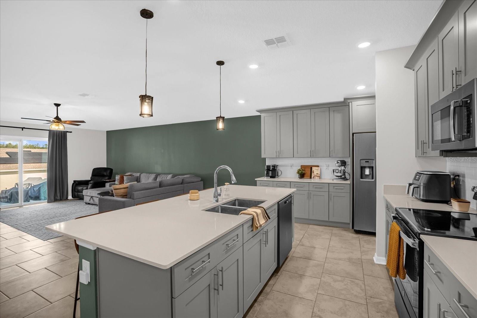 Located in the popular, gated community of Stoneybrook Hills, this inviting 4-bedroom, 2-bath home features 1,850 square feet of comfortable living space with an open, split floor plan ideal for family living. The neighborhood supports an active lifestyle, with wide sidewalks perfect for bike rides, walking pets, running, or evening strolls. The heart of the home is the bright, open kitchen with a large center island and built-in sink, providing ample space for meal preparation while staying connected to the living area. Bar seating at the counter and a cozy dining nook make this space ideal for family meals and casual gatherings. The spacious living room is filled with natural light and opens through sliding glass doors to the backyard patio. The yard is partially fenced, providing a safe area for pets to enjoy outdoor activities. The primary suite is thoughtfully positioned for privacy and includes a generous walk-in closet and an en-suite bath with dual vanities and a step-in shower. Three additional bedrooms provide flexibility for guest rooms, a home office, or recreational space. Residents of Stoneybrook Hills enjoy resort-style amenities, including a community pool, clubhouse, fitness center, playground, tennis and pickleball courts, and basketball courts—all within a secure, gated setting. Conveniently located near State Road 429, this home provides easy access to Disney World, shopping, Orlando International Airport, and everyday conveniences. The nearby Stoneybrook Shopping Center features Publix, dining, and retail options, while historic downtown Mount Dora is just minutes away, known for its charming boutiques, restaurants, festivals, and community events. This home combines functional family living, great amenities, and a prime location—a remarkable opportunity in one of the area’s most sought-after communities. Schedule your private showing today!