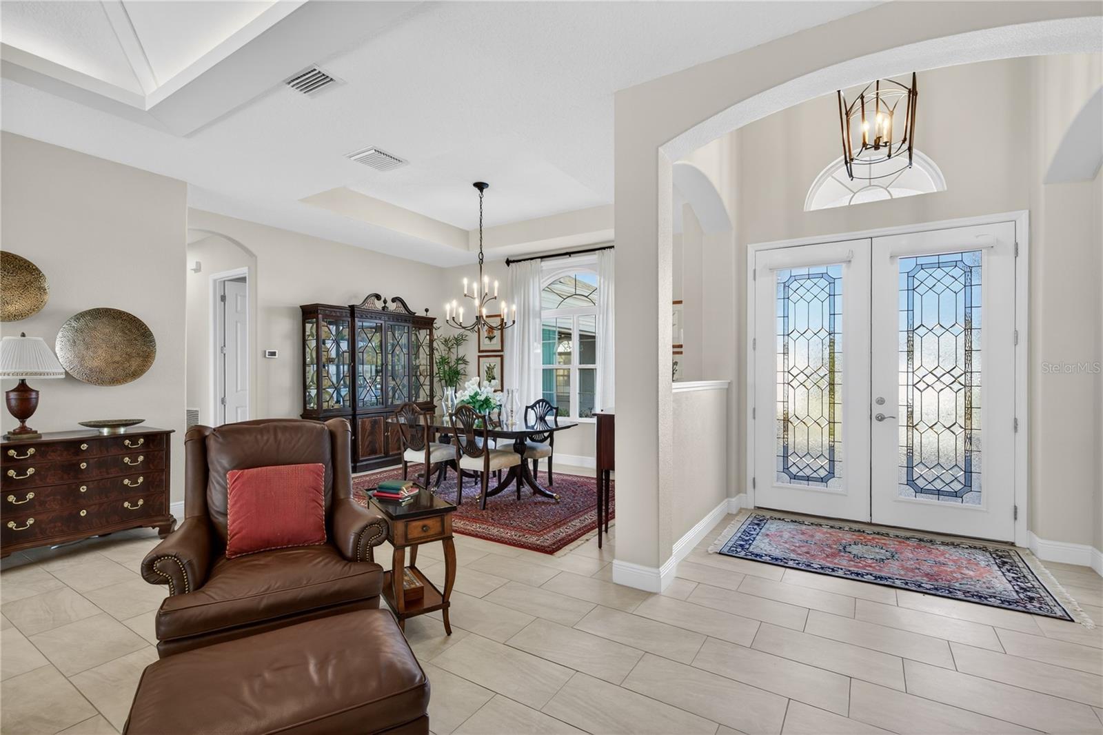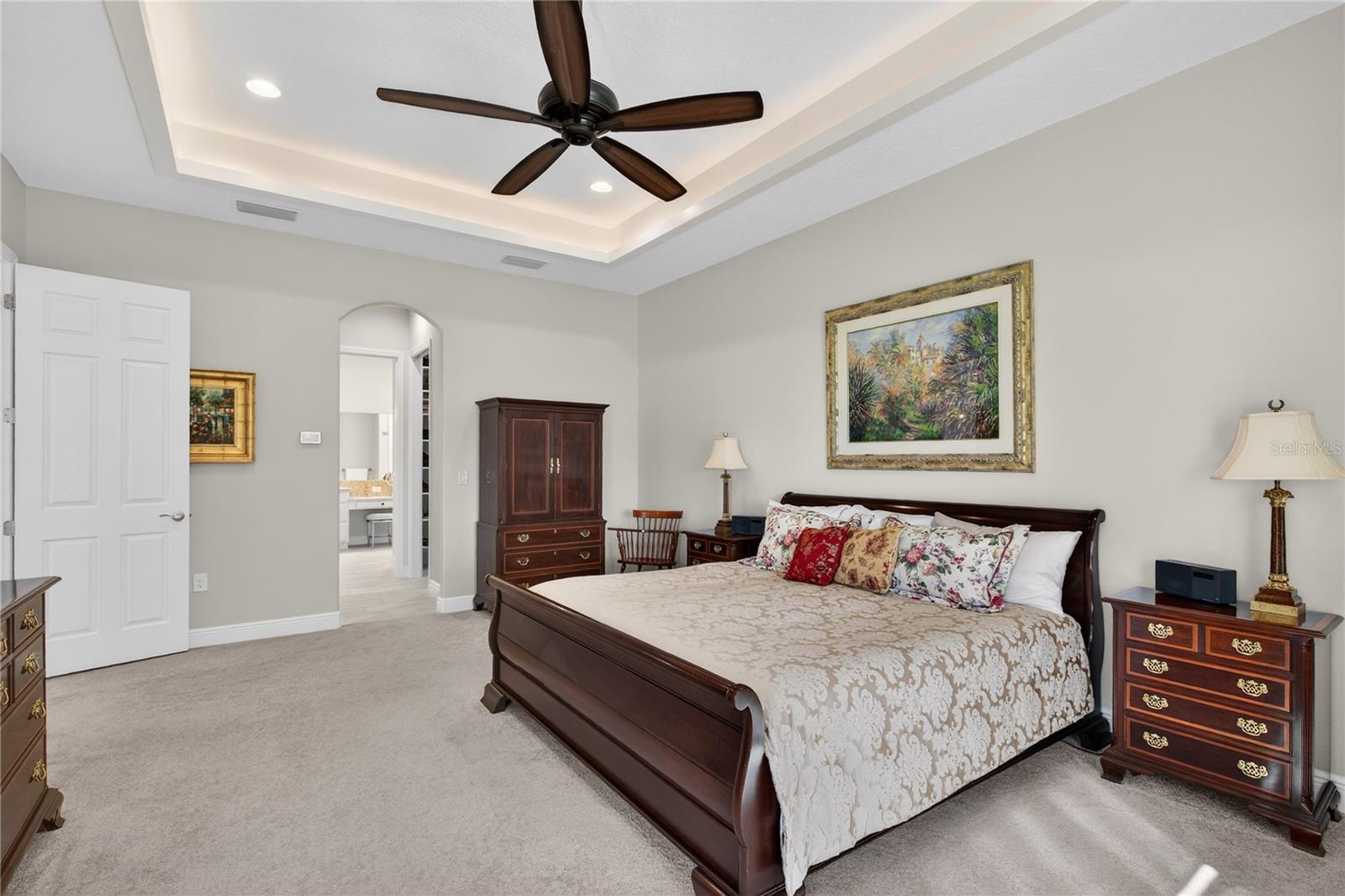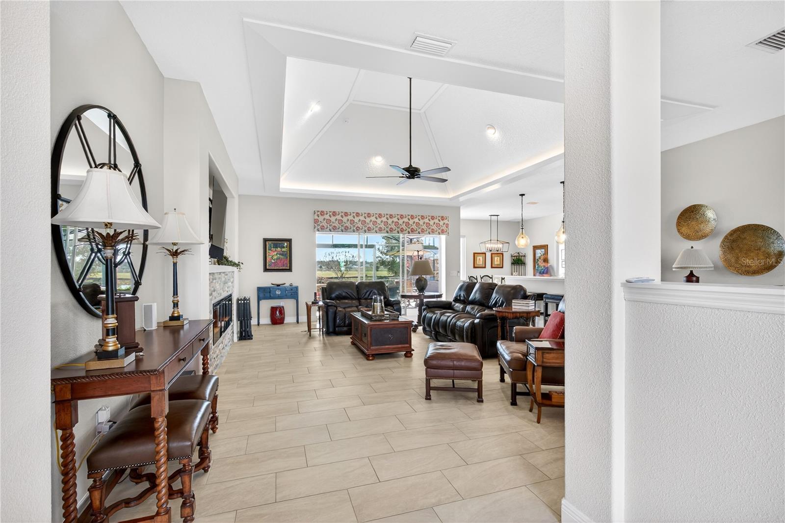 Welcome to 8674 Bridgeport Bay, a much sought after floor plan in a desirable 55+ community in Central Florida. A beautifully upgraded waterfront home with 3rd car garage, larger pavered drive, and offering 2,579 sq ft of living space. This home features 3-4 bedrooms, 3 baths, with a study/media room that can easily serve as the fourth bedroom, and which includes a closet and en-suite bath. Lots of room for the kids and grandkids to visit! Porcelain floors flow through the main living areas, highlighted by a fabulous, coffered ceiling with rope lighting, a stacked stone electric fireplace for ambience, and motorized shades in the great room are just a few of the special touches. Take pleasure in the water views from great room, breakfast nook and kitchen. Your gorgeous and bright gourmet kitchen features an electric cooktop (also plumbed for gas if you prefer), built-in wine/beverage refrigerator, and pull-out cabinets with soft close doors. You'll have plenty of space to cook and create at the lovely quartz countertops. Kitchen also features a bonus water filtration system. The primary suite features a tray ceiling with rope lighting, a private door to your screened back lanai and includes custom his-and-her walk-in closets. Move through to the primary bathroom which boasts quartz countertops, dual sinks, large walk-in shower, and linen closet. Entertaining is a joy in your outdoor living area with a large, screened lanai showcasing a 30-foot picture window screen, an inviting heated pool and spa, and full outdoor kitchen with natural gas grill and roof-vented exhaust. There is a pool safety screen in the garage for when those grands are visiting. Waterfront access allows you to launch a kayak or fish from your backyard. Additional features include a 3-zone 17 SEER HVAC system, 22KW whole-house Generac generator, whole-house surge protection, hard-wired alarm, Ring doorbell, Level 2 EV charger in garage, oversized 2-car garage with 18-foot door, separate single-car garage, and expanded paver driveway with extra parking pad. The Lakes of Mount Dora is an award-winning 55+ gated community in Central Florida with an 18,000 sq ft Clubhouse, library, billiards room, card/game room, social hall, gym, arts/crafts room, 4 miles of interconnecting waterways, pickle ball, tennis, bocce ball and croquet lawns, pool, hot tub, walking trails, fire pits, and an amazing fenced and gated RV/Boat Parking! All of this, plus reclaimed sprinkler system lawn irrigation AND internet/cable, is included in the low fee of $290. per month! This home is less than 15 minutes from downtown Mount Dora—a charming town filled with art, festivals, shopping, unique restaurants, and coffee shops—and a little over an hour from Orlando and its many attractions, ensuring there's always something to do. One hour from the beach! Don't let this opportunity pass you by - discover your perfect Florida home today!