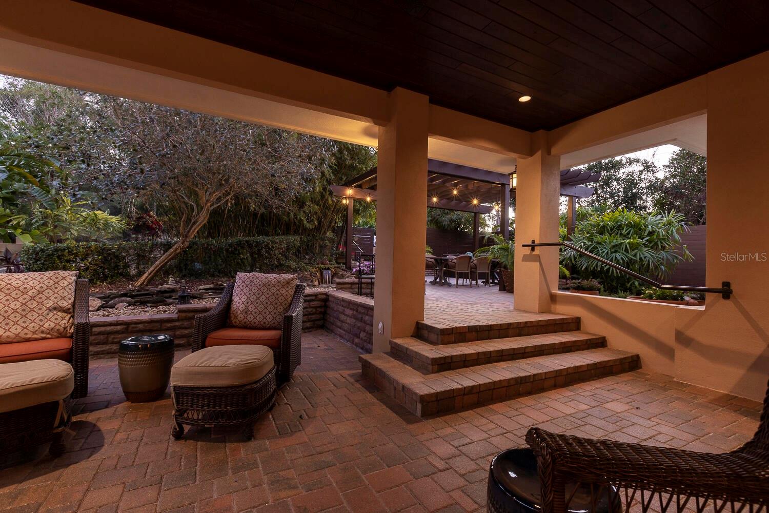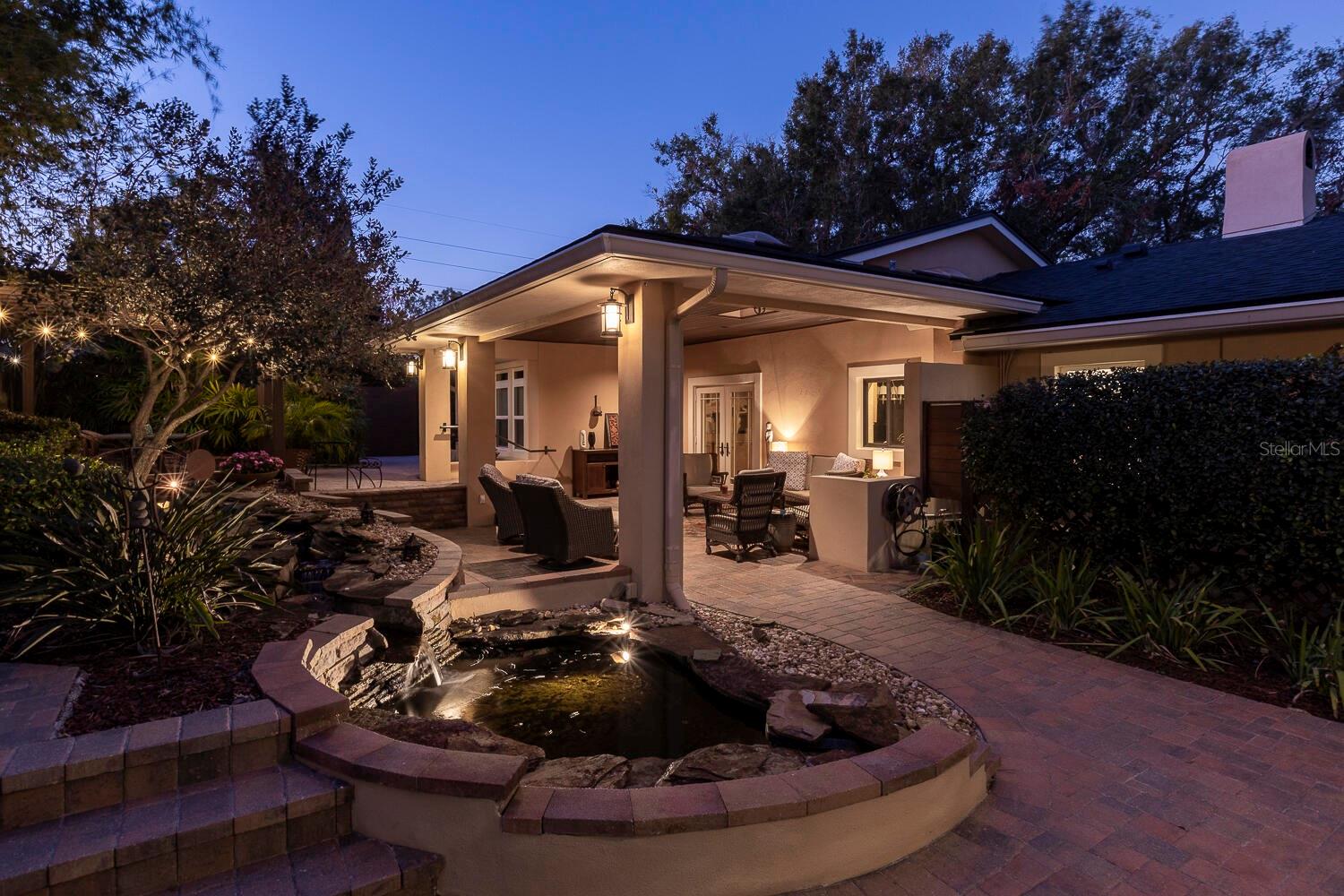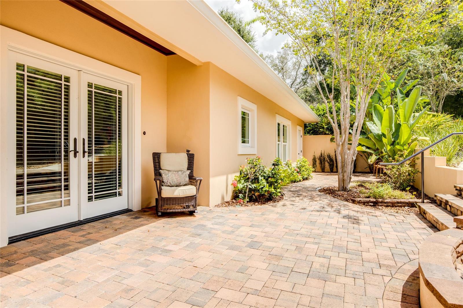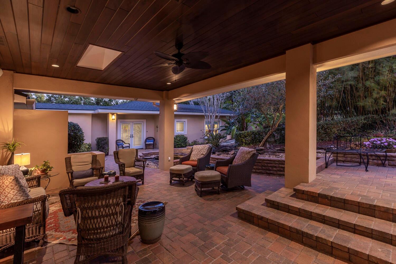 Courtyard home with In-law suite in the desirable Lake Gertrude neighborhood, one block from the scenic lakeside walking path. This is a custom home. The main home is 3 bd / 2 baths, with an attached in-law suite 1 bd / 1 bath, for a total of 3268 SF. The home was fully renovated in 2014 and the in-law suite was built in 2016. All work was permitted and built to code, including structural improvements throughout and high efficiency items: insulation, doors and windows. High efficiency A/C's were added in 2023. The efficiency features, including an irrigation well, contribute to a low monthly utility bill of approx. $250. This courtyard home with In-Law suite features a large double lot with a front circular driveway and a large rear driveway on normandy drive with an EV/RV charging receptacle. The home has a split floor plan. The foyer steps up to the living room with 11 ft high ceilings and large windows viewing an oak tree canopy. The dining room has a fireplace and a wet bar with quartz countertops and refrigerator with an ice maker. The kitchen has a skylight and features granite countertops, large island, a walk-in pantry, gas range and stainless appliances. Double french doors open to the rear porch. The primary suite features a high tray ceiling and the bedroom and bath are spacious. There are his & hers closets, a linen closet, soaking tub, shower and a toilet room. The split plan's second bedroom is currently used by the homeowner as an office and features built-ins for storage. The third bedroom is currently used as an exercise room and features an infrared sauna. The hall bath has a french door to a private courtyard with an outdoor shower. The laundry room has an adjacent multi-purpose closet. Additional closets are a coat closet, second linen closet and a 7x10 storage room off the courtyard. The resort style outdoor area is great for entertaining or relaxing. There is a large rear porch open to the terraced patio, courtyard, dining pergola and hot tub surrounded by tropical foliage. A tranquil water feature in natural stone has a babbling brook cascading to the lower pond and is surrounded by lush bamboo. The in-law suite or multi-generational suite is attached to the main house and has two entries. The front side entry has a foyer, and the rear courtyard is accessed by double french doors. The suite has high ceilings with a living room skylight, dining area and kitchenette with quartz countertops, custom cabinetry and stainless appliances. Double doors open to the bedroom built-in with a desk area and additional storage. There is an extra large closet and private bath with a large shower and two shower heads. This suite was originally used as an in-law suite and most recently used as an airbnb. This custom home has premium finishes throughout, wood floors, granite kitchen countertops, porch ceilings finished with T&G cypress and is energy efficient. This is an exceptionally well maintained custom home and has unique outdoor areas created for Florida living.