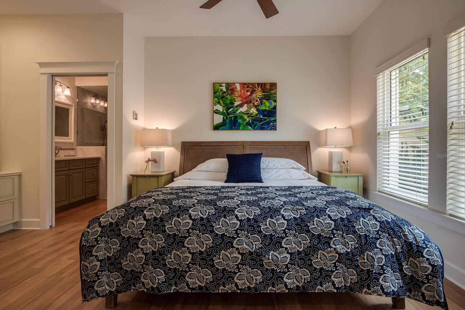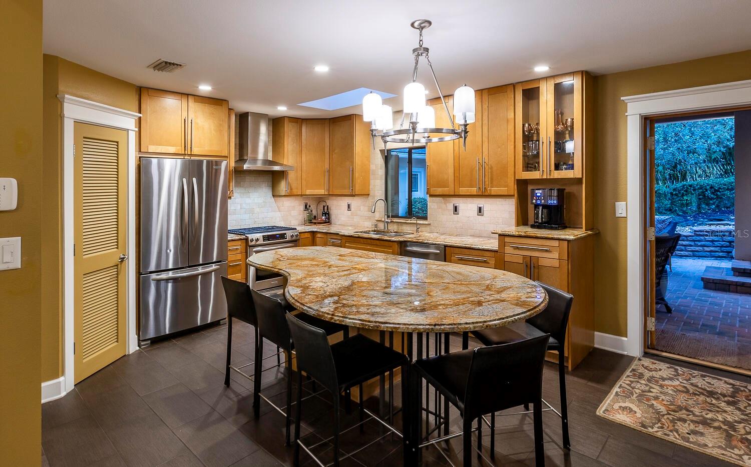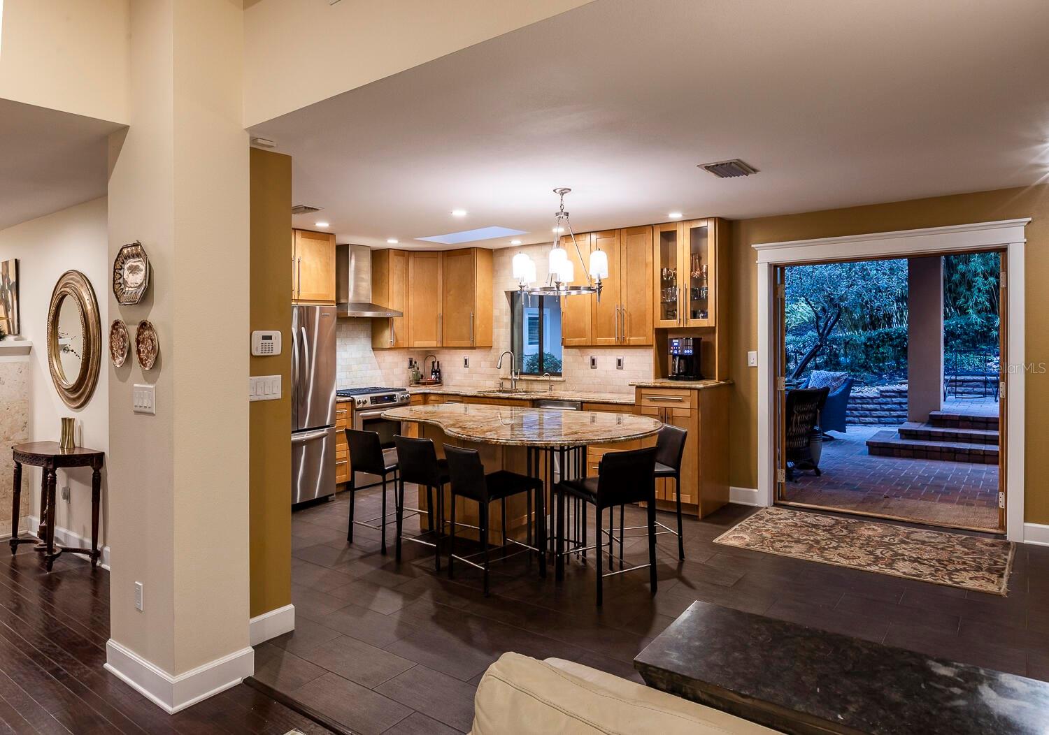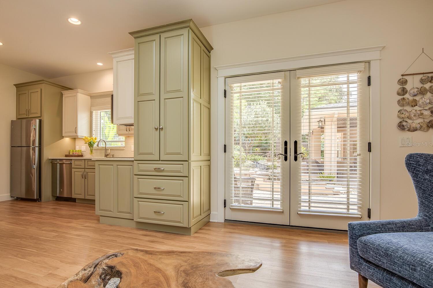 Courtyard home with In-law suite in the desirable Lake Gertrude neighborhood, one block from the scenic lakeside walking path. This is a custom home. The main home is 3 bd / 2 baths, with an attached in-law suite 1 bd / 1 bath, for a total of 3268 SF. The home was fully renovated in 2014 and the in-law suite was built in 2016. All work was permitted and built to code, including structural improvements throughout and high efficiency items: insulation, doors and windows. High efficiency A/C's were added in 2023. The efficiency features, including an irrigation well, contribute to a low monthly utility bill of approx. $250. This courtyard home with In-Law suite features a large double lot with a front circular driveway and a large rear driveway on normandy drive with an EV/RV charging receptacle. The home has a split floor plan. The foyer steps up to the living room with 11 ft high ceilings and large windows viewing an oak tree canopy. The dining room has a fireplace and a wet bar with quartz countertops and refrigerator with an ice maker. The kitchen has a skylight and features granite countertops, large island, a walk-in pantry, gas range and stainless appliances. Double french doors open to the rear porch. The primary suite features a high tray ceiling and the bedroom and bath are spacious. There are his & hers closets, a linen closet, soaking tub, shower and a toilet room. The split plan's second bedroom is currently used by the homeowner as an office and features built-ins for storage. The third bedroom is currently used as an exercise room and features an infrared sauna. The hall bath has a french door to a private courtyard with an outdoor shower. The laundry room has an adjacent multi-purpose closet. Additional closets are a coat closet, second linen closet and a 7x10 storage room off the courtyard. The resort style outdoor area is great for entertaining or relaxing. There is a large rear porch open to the terraced patio, courtyard, dining pergola and hot tub surrounded by tropical foliage. A tranquil water feature in natural stone has a babbling brook cascading to the lower pond and is surrounded by lush bamboo. The in-law suite or multi-generational suite is attached to the main house and has two entries. The front side entry has a foyer, and the rear courtyard is accessed by double french doors. The suite has high ceilings with a living room skylight, dining area and kitchenette with quartz countertops, custom cabinetry and stainless appliances. Double doors open to the bedroom built-in with a desk area and additional storage. There is an extra large closet and private bath with a large shower and two shower heads. This suite was originally used as an in-law suite and most recently used as an airbnb. This custom home has premium finishes throughout, wood floors, granite kitchen countertops, porch ceilings finished with T&G cypress and is energy efficient. This is an exceptionally well maintained custom home and has unique outdoor areas created for Florida living.