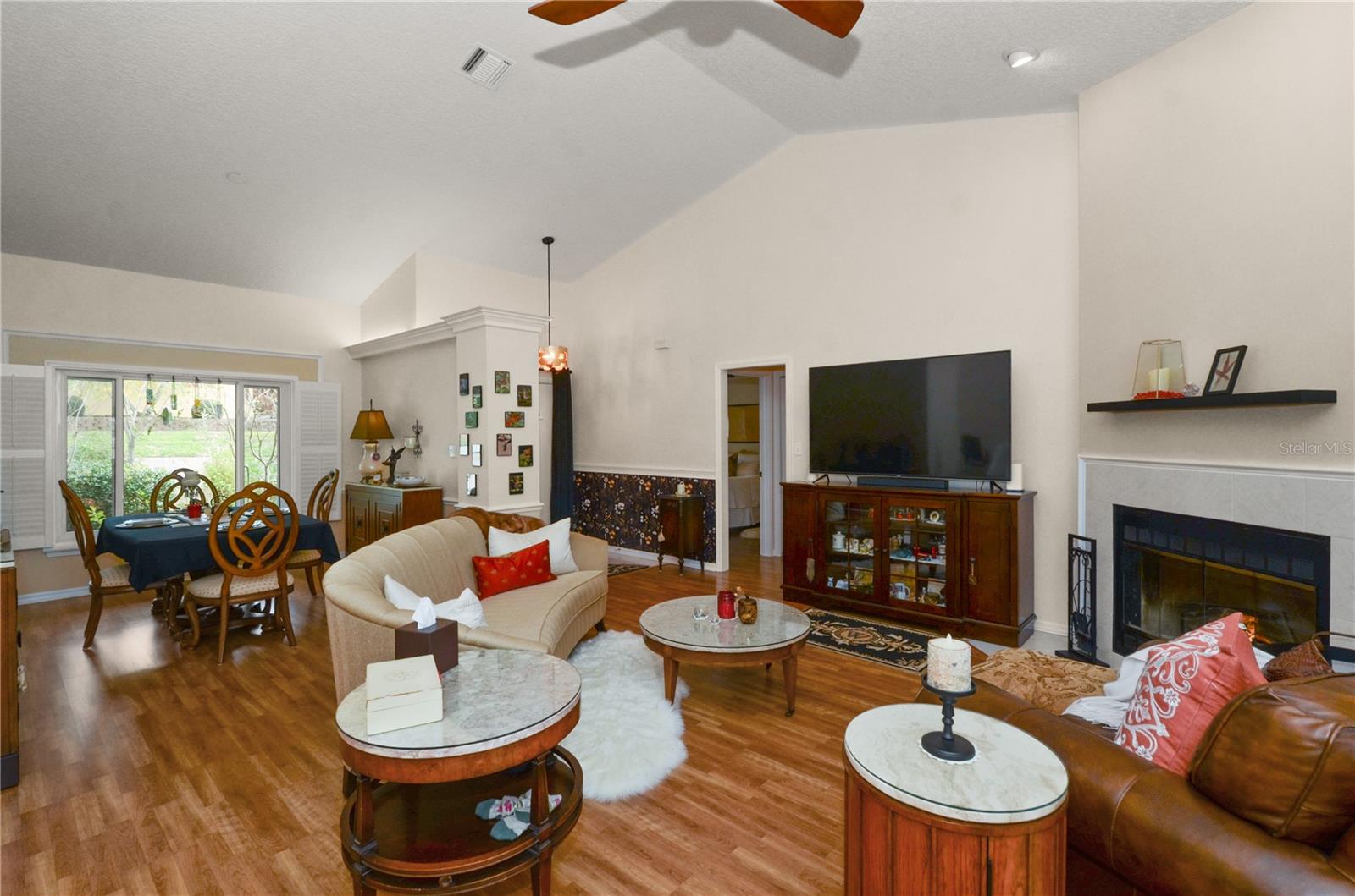 Welcome home to this beautifully maintained 2 bedroom, 2 bath split floor plan offering 1,600 square feet of comfortable living space, located less than a mile from the heart of charming downtown Mt. Dora. Designed for a low-maintenance lifestyle, this home is perfect for those who want to enjoy more time exploring local shops, dining, and waterfront activities. Step inside to discover vaulted ceilings and an open, airy floor plan that fills the home with natural light and creates a spacious, welcoming atmosphere. The living and dining areas flow seamlessly, making the space ideal for both everyday living and entertaining. Unwind on the large screened-in back patio or one of your many outdoor bistro, paver patio areas which is perfect for morning coffee, evening relaxation, or hosting guests. Owner has vinyl windows that can be used on back patio to make it a Florida Room. Community has a boat ramp accessible to Lake Dora and chain of lakes via a canal. Recent updates include NEW windows (2017), NEW roof (2023), NEW water heater (2023), NEW upgraded electrical panel to 200 amps (2023), NEW kitchen appliances (2024), additional blown attic insulation (2024), NEW exterior paint (2025), NEW AC condenser unit (2026).