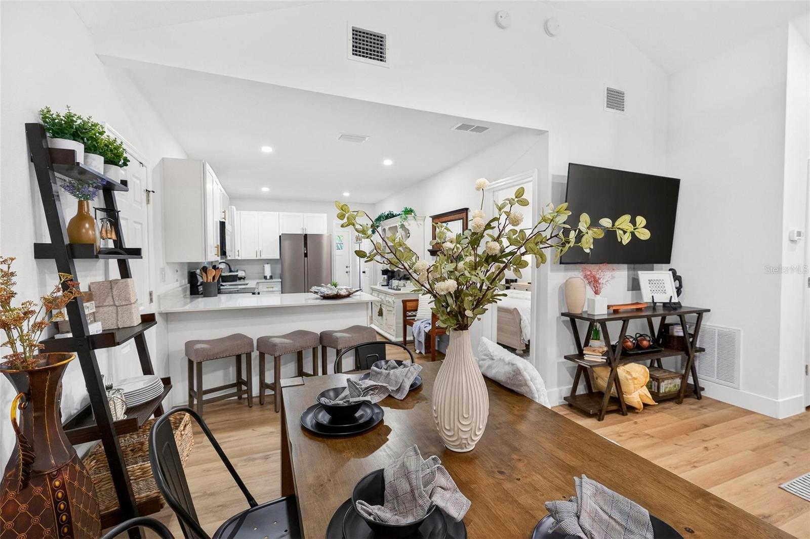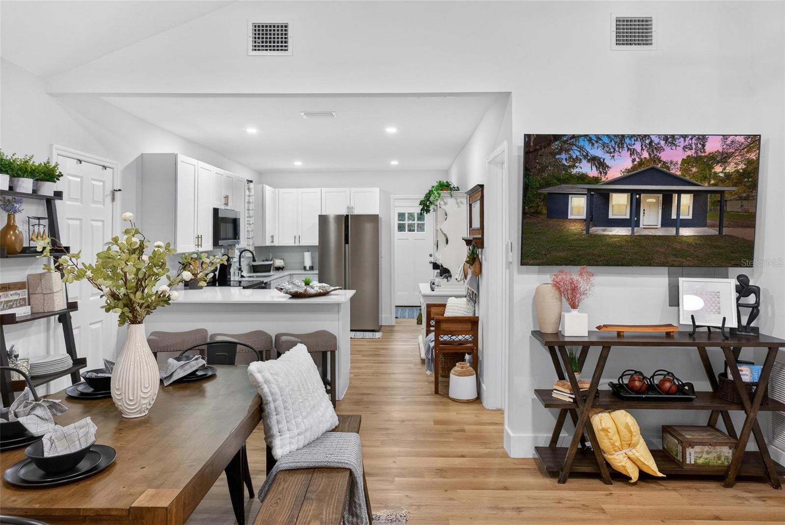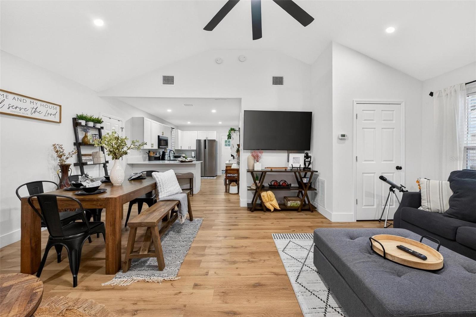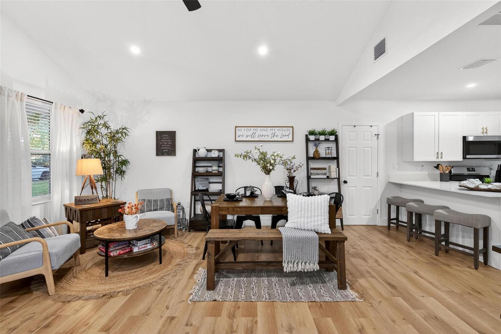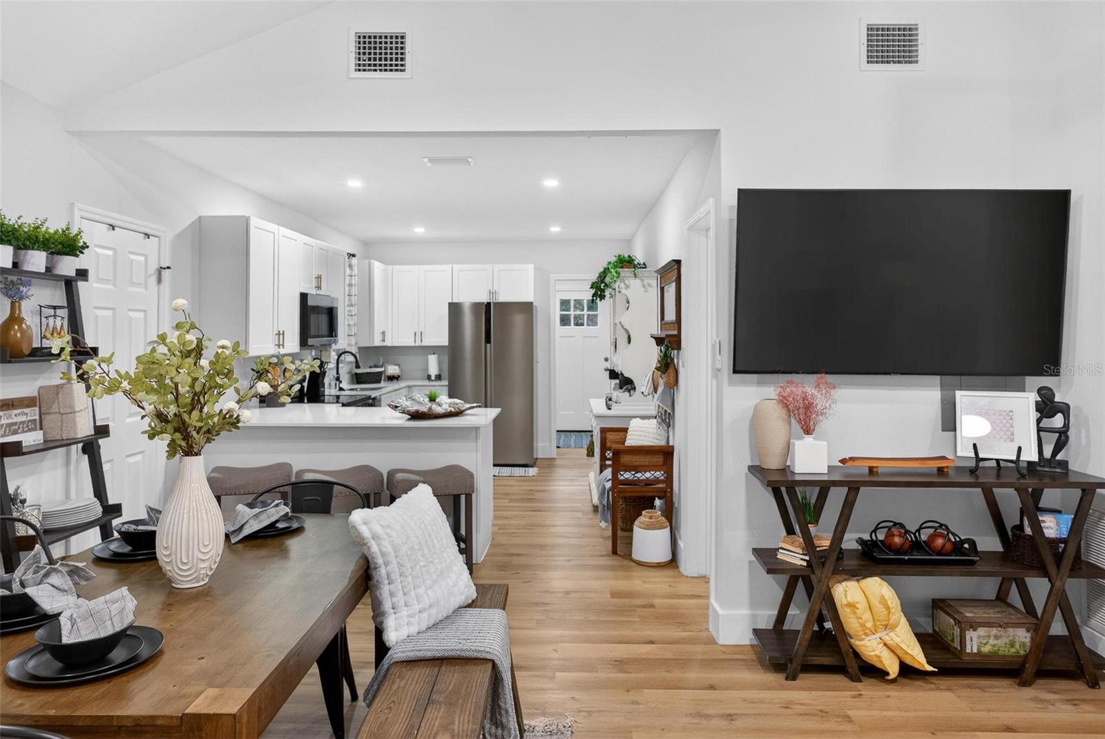 Set on a one-third acre lot just one block from N. Donnelly Street, this thoughtfully updated single-story home places you minutes from downtown Mount Dora’s shops, lakeside dining, art festivals, and antique markets while offering space, privacy, and modern comfort, permitted and fully renovated in 2024 with a metal roof, updated plumbing and electrical, new A/C, new windows, and an added bathroom, featuring light brown luxury vinyl plank flooring throughout, an open-concept living and dining area with a cathedral ceiling and recessed LED lighting that creates an airy, light-filled atmosphere, a refreshed kitchen with shaker cabinetry, stylish gold hardware, quartz-style countertops, and stainless steel appliances, two primary bedroom suites providing flexible living arrangements, an interior laundry and oversized utility room with washer and dryer hookups, tankless water heater, and additional storage or mudroom potential, completely remodeled bathrooms including a walk-in shower and a bath and shower combination, a covered front porch, a newly installed red brick driveway, and an expansive yard with ample space for boat parking and Class A RV parking, with furnishings negotiable, all located in one of Central Florida’s most charming historic communities approximately 40 minutes from Orlando.