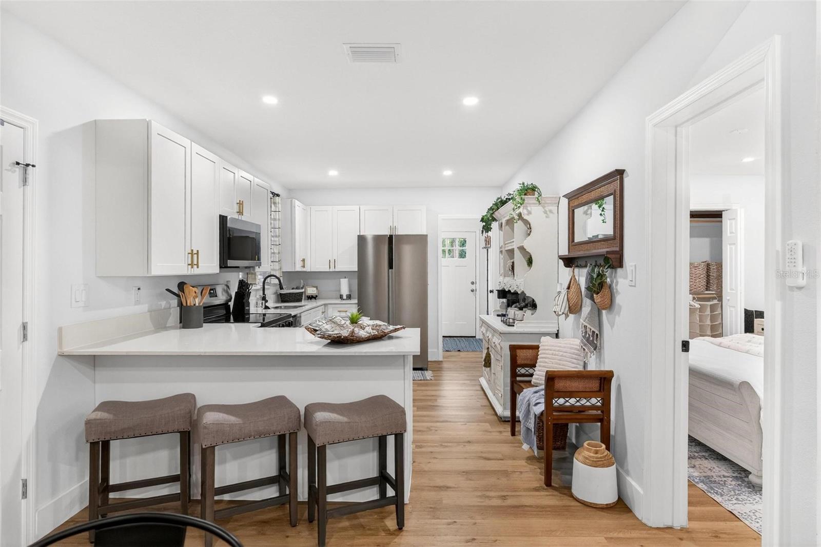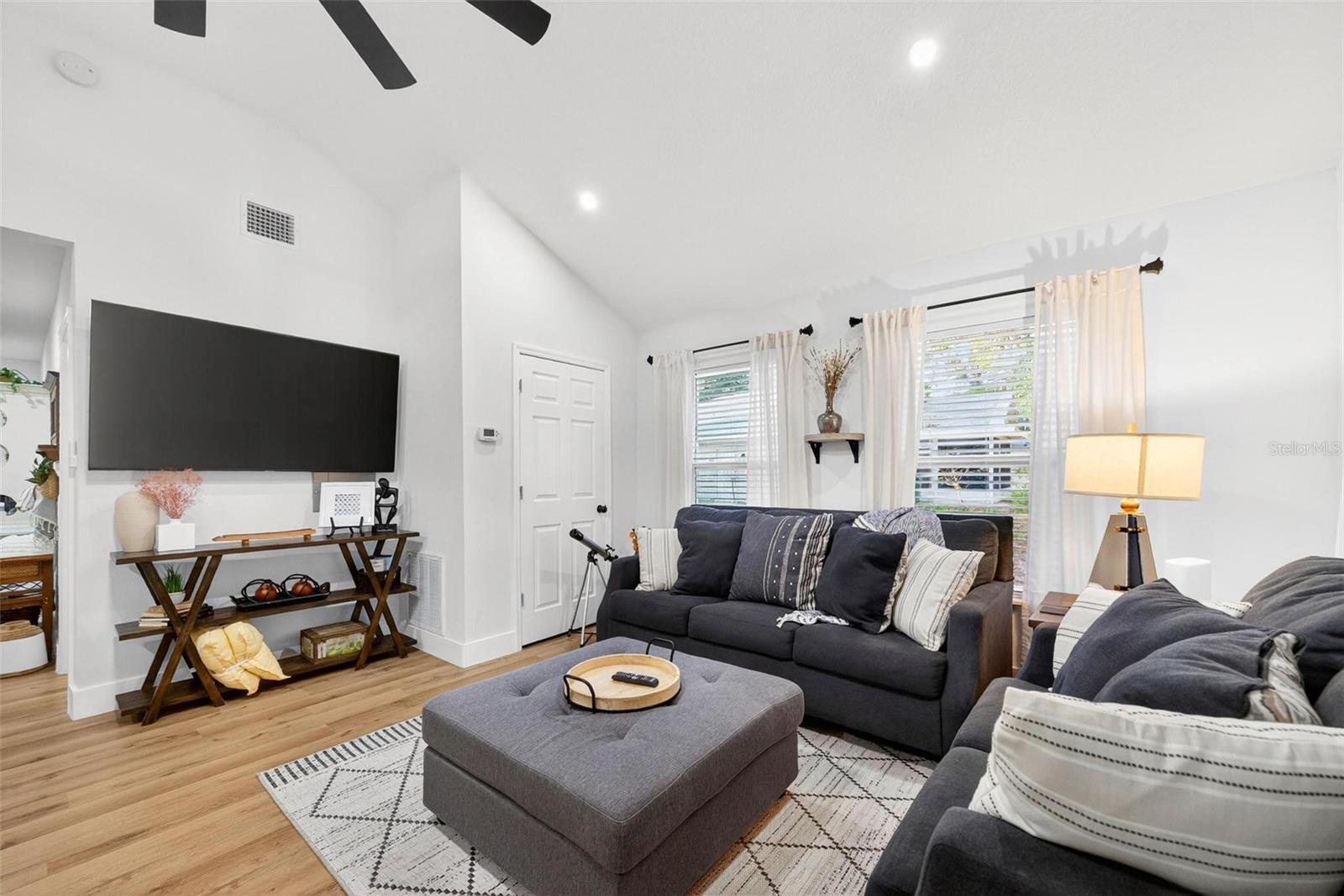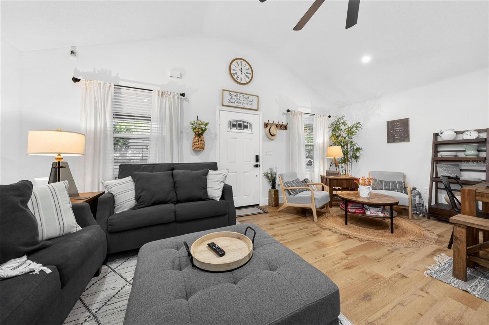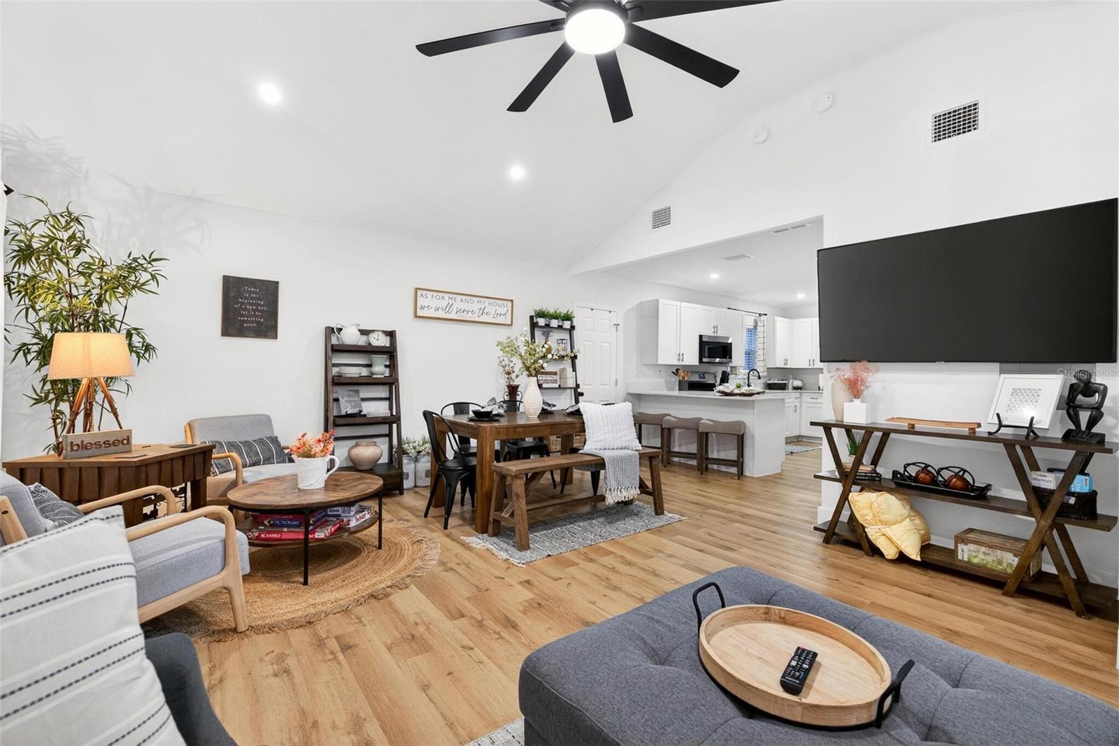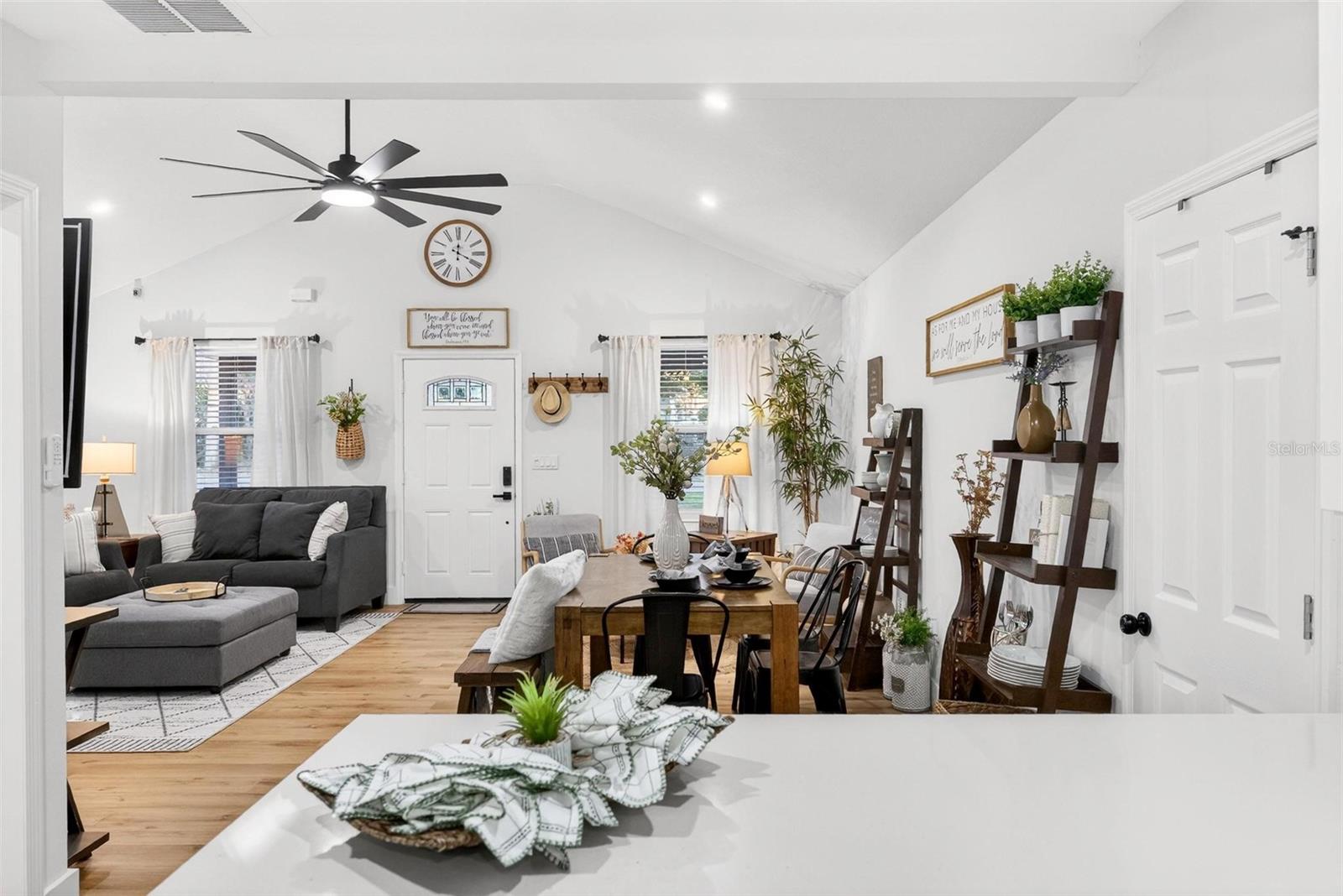 Set on a one-third acre lot just one block from N. Donnelly Street, this thoughtfully updated single-story home places you minutes from downtown Mount Dora’s shops, lakeside dining, art festivals, and antique markets while offering space, privacy, and modern comfort, permitted and fully renovated in 2024 with a metal roof, updated plumbing and electrical, new A/C, new windows, and an added bathroom, featuring light brown luxury vinyl plank flooring throughout, an open-concept living and dining area with a cathedral ceiling and recessed LED lighting that creates an airy, light-filled atmosphere, a refreshed kitchen with shaker cabinetry, stylish gold hardware, quartz-style countertops, and stainless steel appliances, two primary bedroom suites providing flexible living arrangements, an interior laundry and oversized utility room with washer and dryer hookups, tankless water heater, and additional storage or mudroom potential, completely remodeled bathrooms including a walk-in shower and a bath and shower combination, a covered front porch, a newly installed red brick driveway, and an expansive yard with ample space for boat parking and Class A RV parking, with furnishings negotiable, all located in one of Central Florida’s most charming historic communities approximately 40 minutes from Orlando.