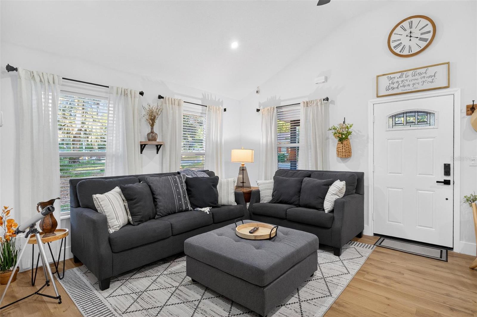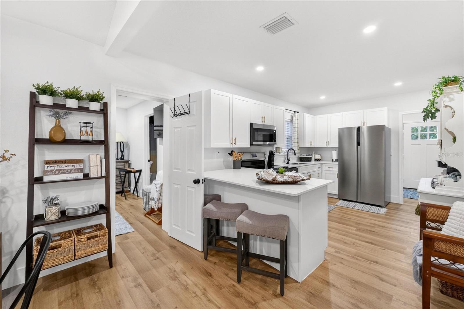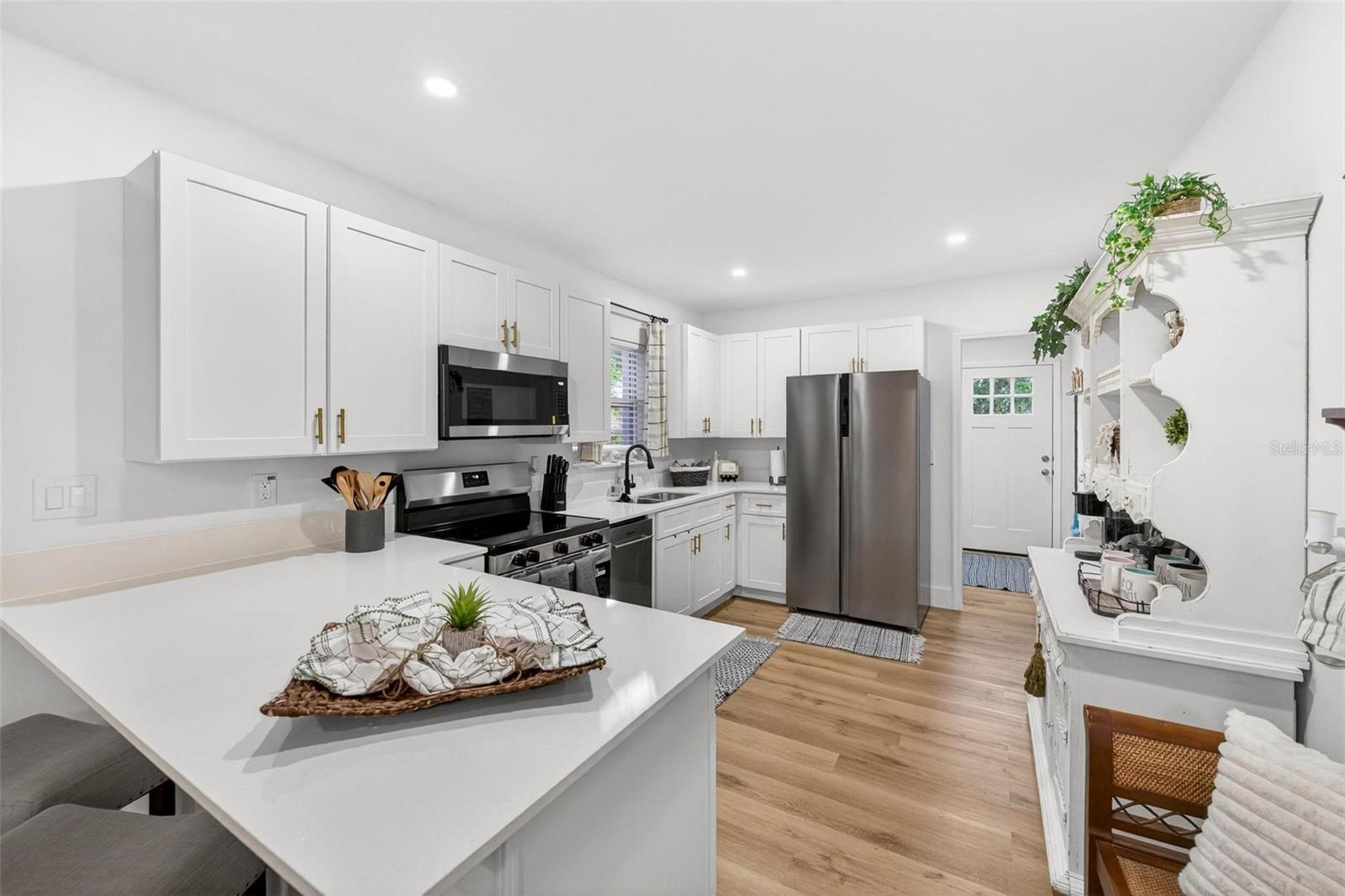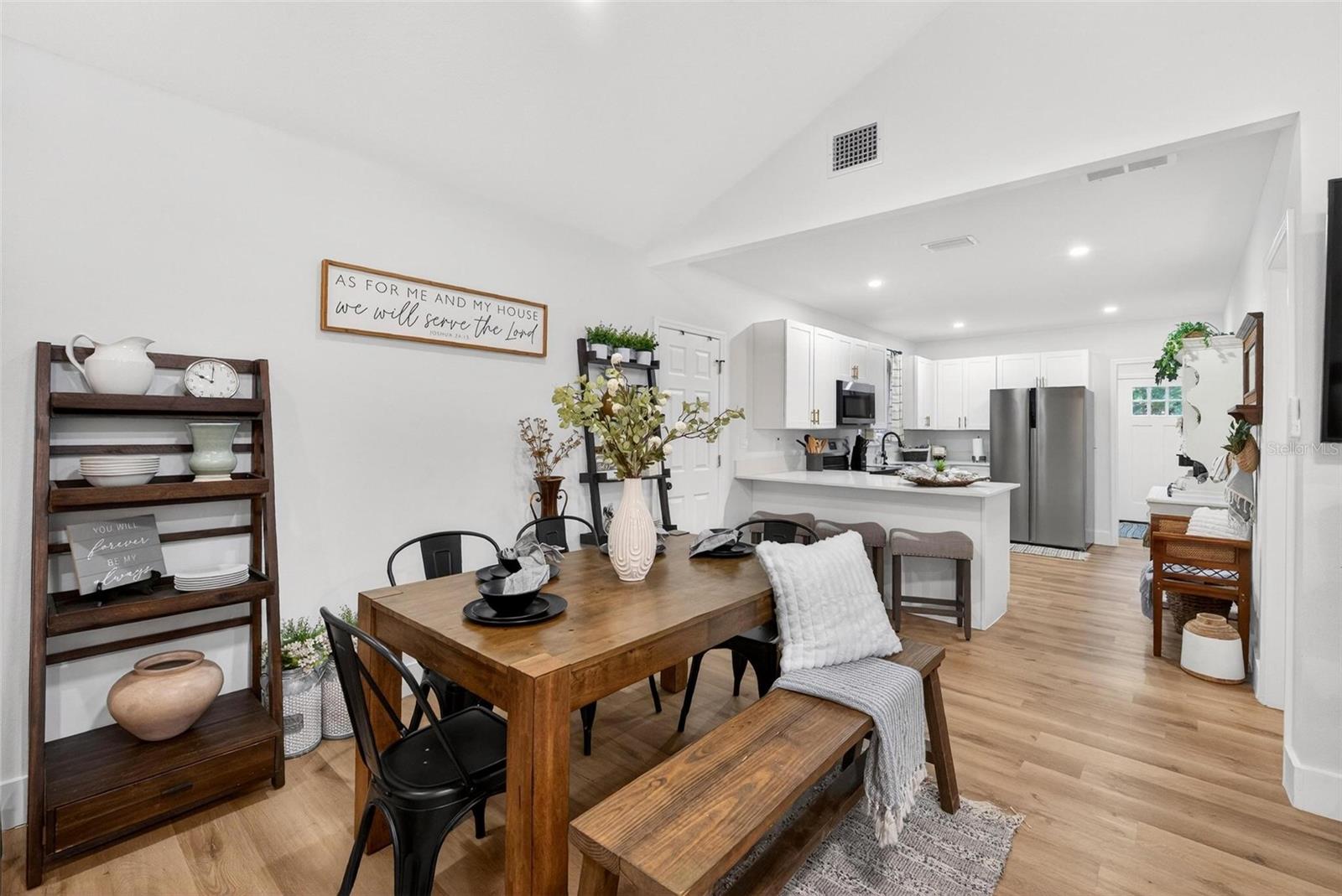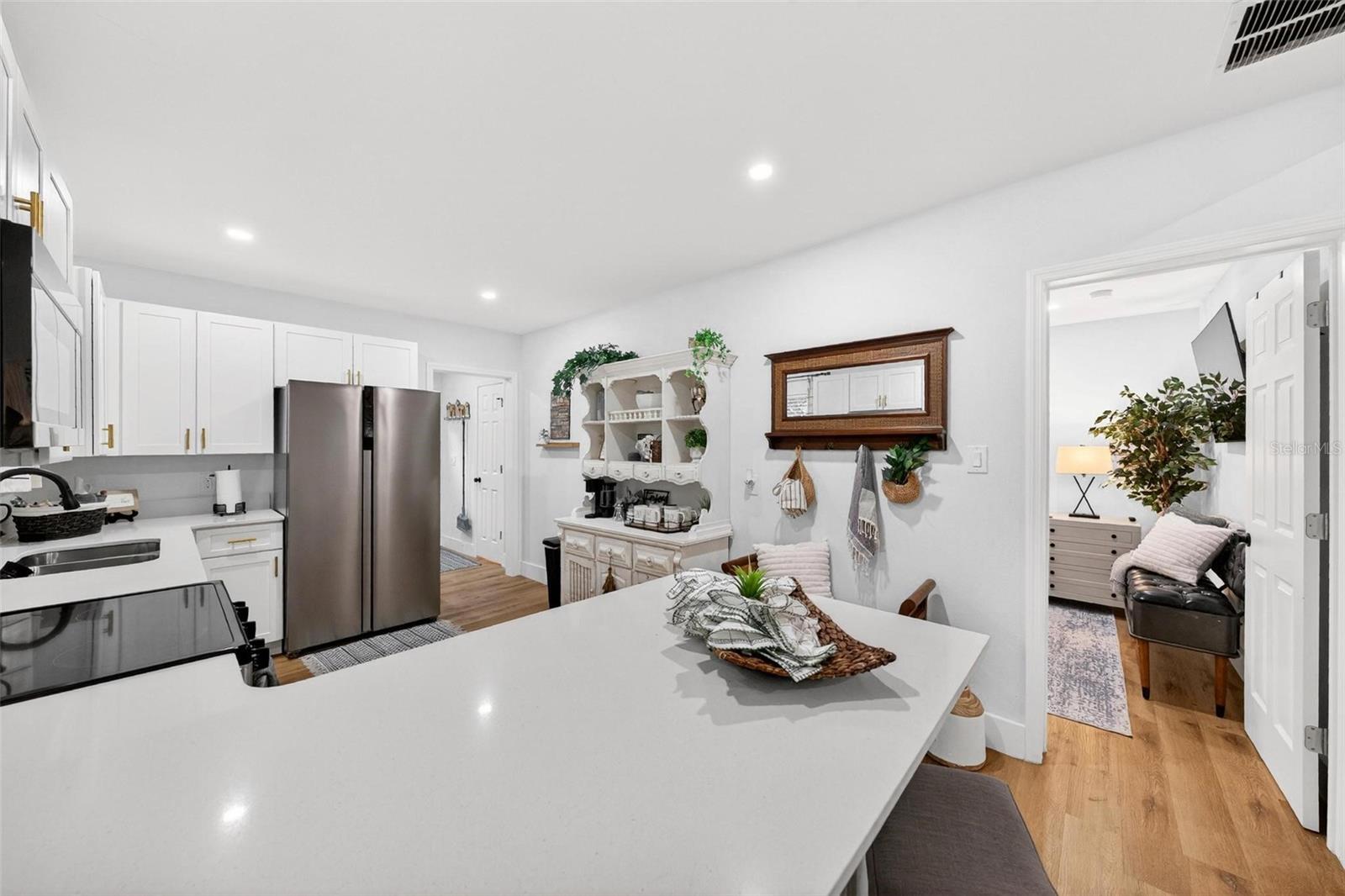 Set on a one-third acre lot just one block from N. Donnelly Street, this thoughtfully updated single-story home places you minutes from downtown Mount Dora’s shops, lakeside dining, art festivals, and antique markets while offering space, privacy, and modern comfort, permitted and fully renovated in 2024 with a metal roof, updated plumbing and electrical, new A/C, new windows, and an added bathroom, featuring light brown luxury vinyl plank flooring throughout, an open-concept living and dining area with a cathedral ceiling and recessed LED lighting that creates an airy, light-filled atmosphere, a refreshed kitchen with shaker cabinetry, stylish gold hardware, quartz-style countertops, and stainless steel appliances, two primary bedroom suites providing flexible living arrangements, an interior laundry and oversized utility room with washer and dryer hookups, tankless water heater, and additional storage or mudroom potential, completely remodeled bathrooms including a walk-in shower and a bath and shower combination, a covered front porch, a newly installed red brick driveway, and an expansive yard with ample space for boat parking and Class A RV parking, with furnishings negotiable, all located in one of Central Florida’s most charming historic communities approximately 40 minutes from Orlando.