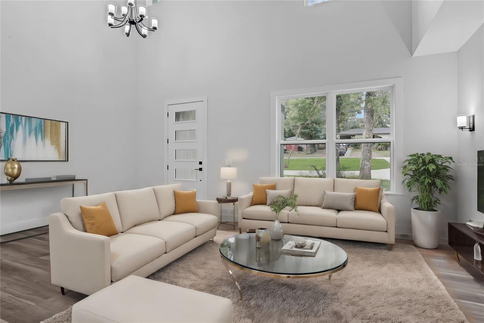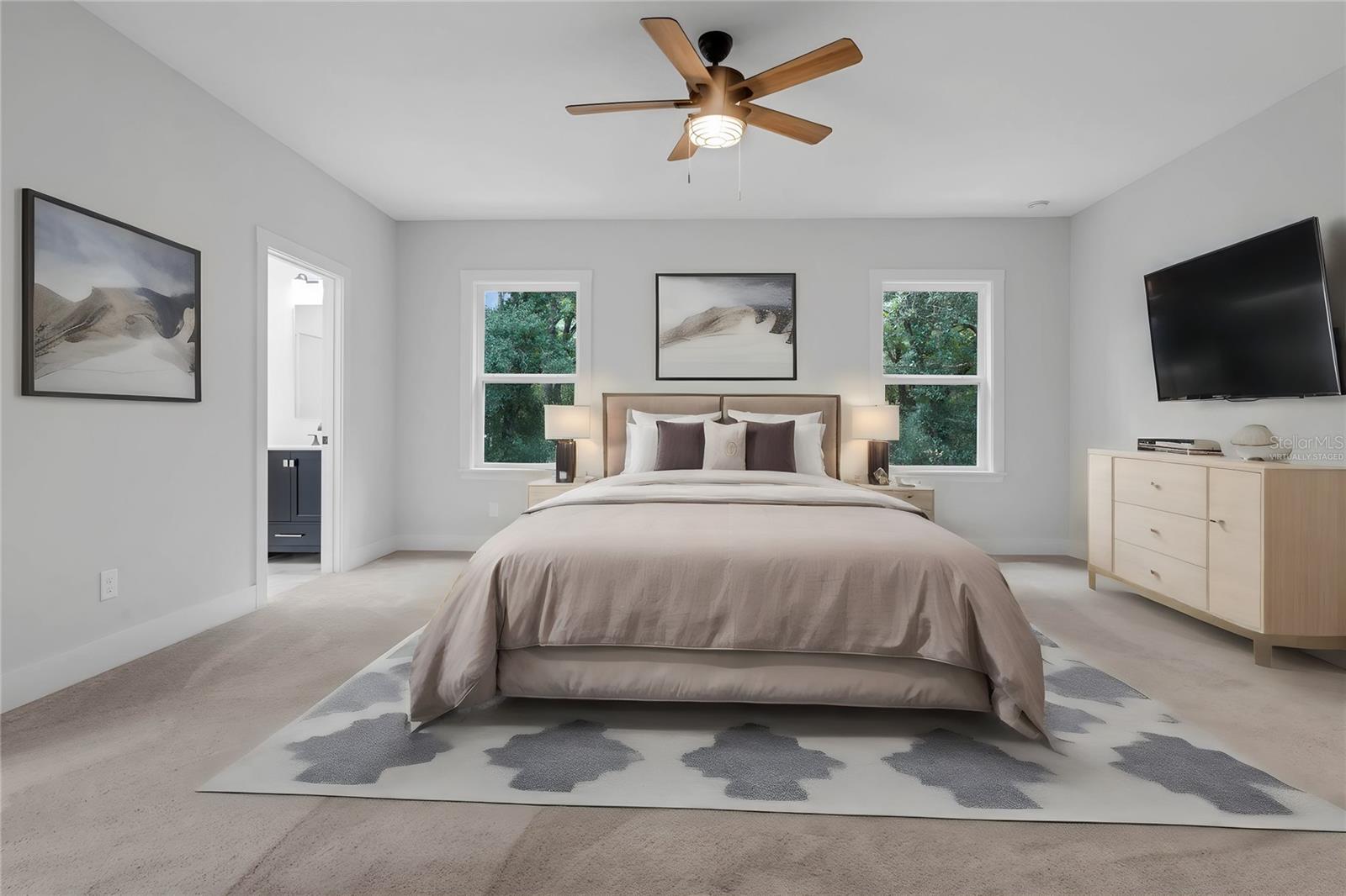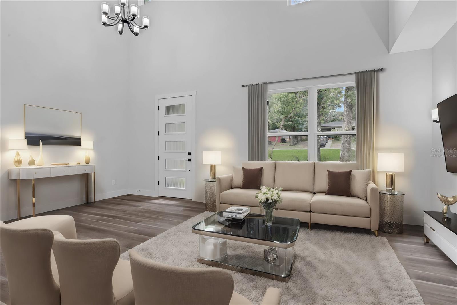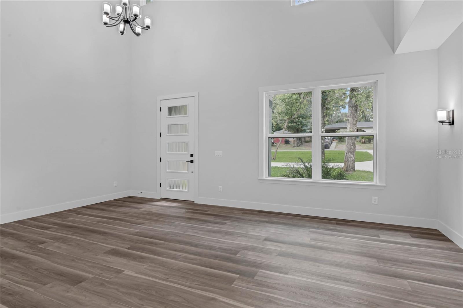 One or more photo(s) has been virtually staged. Welcome to the serene neighborhood of Mount Plymouth, where the essence of country living meets modern convenience. Nestled amidst the charm of this delightful community, this home presents a bespoke two-story, 5-bedroom, 3.5-bathroom residence designed to accommodate the needs of a growing family with style and functionality. This custom-built home stands as a testament to quality craftsmanship, with a sturdy concrete block construction spanning both floors, ensuring durability and peace of mind for years to come. As you step into the foyer, be greeted by soaring 20-foot ceilings, a grandeur that sets the tone for the elegance within. The formal dining room, adjacent to the entry, boasts a regal ambiance complemented by the expansive ceiling height. Throughout the home, attention to detail is evident, with 9-foot 4-inch flat ceilings gracing every room, adorned with refined 1 x 4 casing and 5¼-inch baseboards framing doors and windows. The heart of the home, the kitchen, and laundry areas, feature shaker-style cabinets adorned with 42-inch uppers and luxurious quartz countertops, offering both functionality and aesthetic appeal. A harmonious blend of flooring materials defines each space, with resilient luxury vinyl plank flooring adorning common areas, plush carpeting in the bedrooms, and elegant 24 x 48 porcelain tiles enhancing the bathrooms on the upper floor. Every fixture exudes quality, from Kohler to Price Pfister, ensuring a standard of excellence throughout the home. Designed for comfort and convenience, this residence boasts dual master bedrooms, each offering sanctuary and privacy. The generously sized bedrooms, provide ample space for relaxation and personalization. Meanwhile, the bathrooms showcase furniture-style vanities with double sinks and exquisite quartz countertops, adding a touch of luxury to daily routines. With an eye toward efficiency and sustainability, this home is thoughtfully equipped to minimize future maintenance and monthly living costs. The exterior is adorned with Behr Marquis paint, while the vinyl bead board ceilings in the entry and rear porch exude timeless charm. A Carrier unit with a zone system ensures customizable comfort on each floor, while an 80-gallon hybrid water heater offers both energy efficiency and convenience. Outdoor living is embraced with open arms, thanks to PVC porch railings with steel balusters and a lush St. Augustine grass lawn irrigated by a well, eliminating the need for a city water bill. Ample parking ensures convenience for residents and guests alike, completing the picture of effortless living in this idyllic countryside retreat. Welcome home, where thoughtful design, superior craftsmanship, and modern amenities converge to create a haven for anyone seeking the perfect blend of comfort and style.