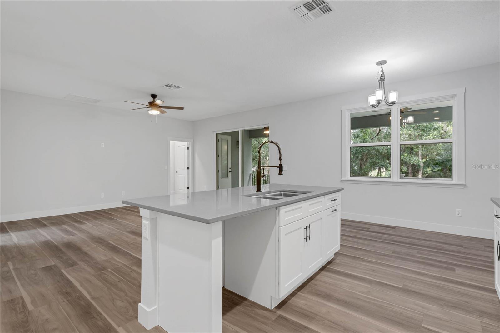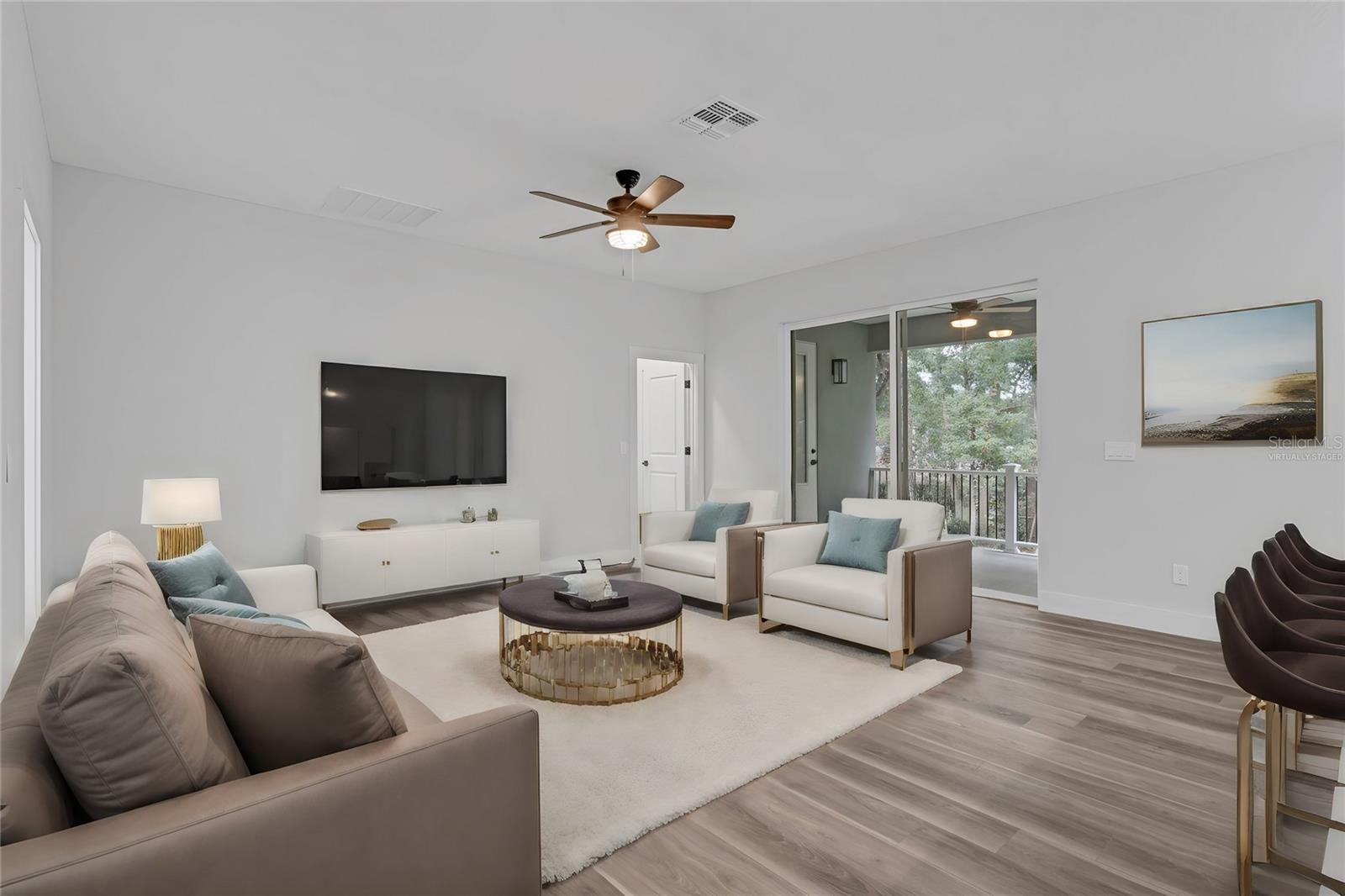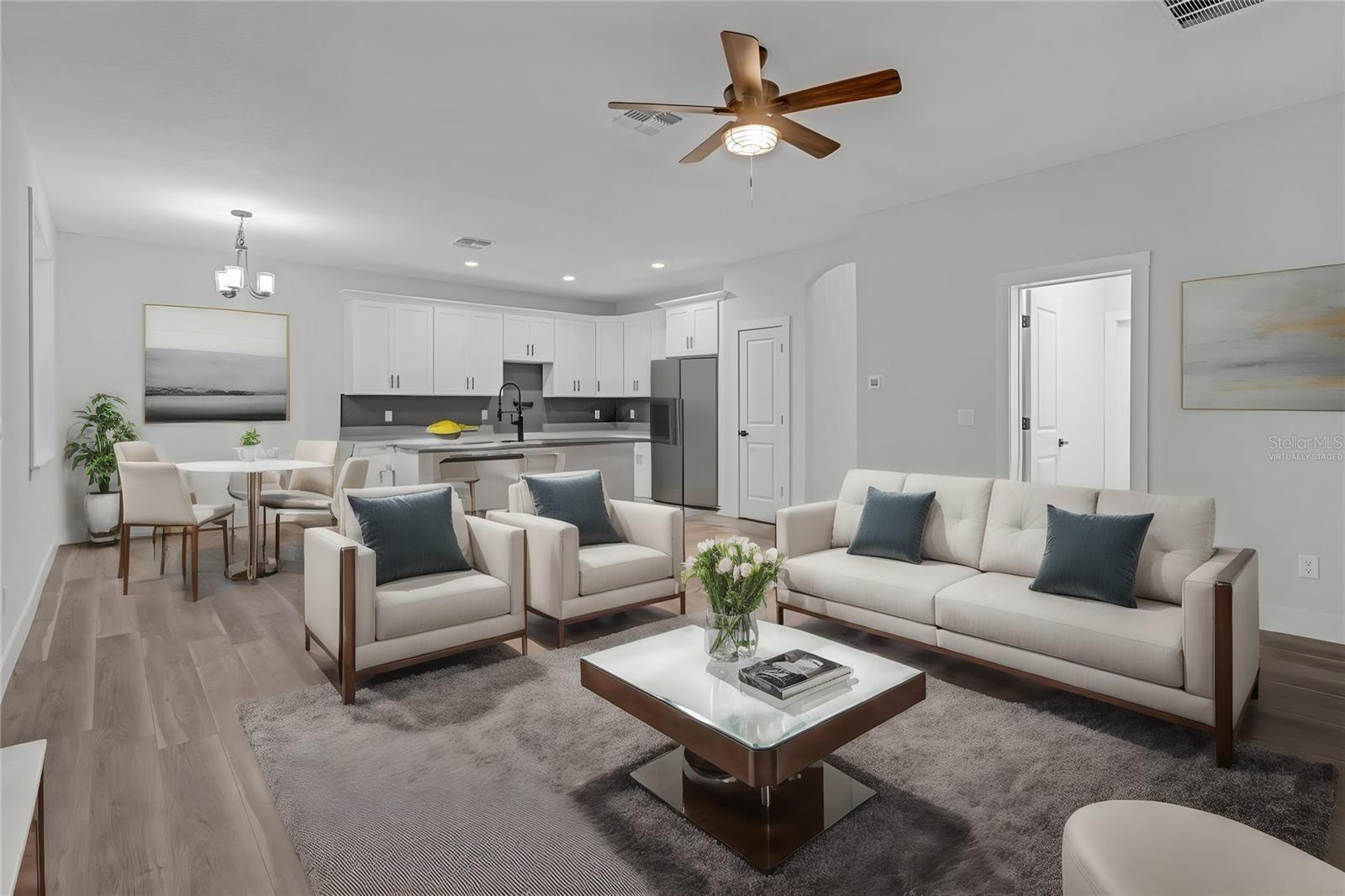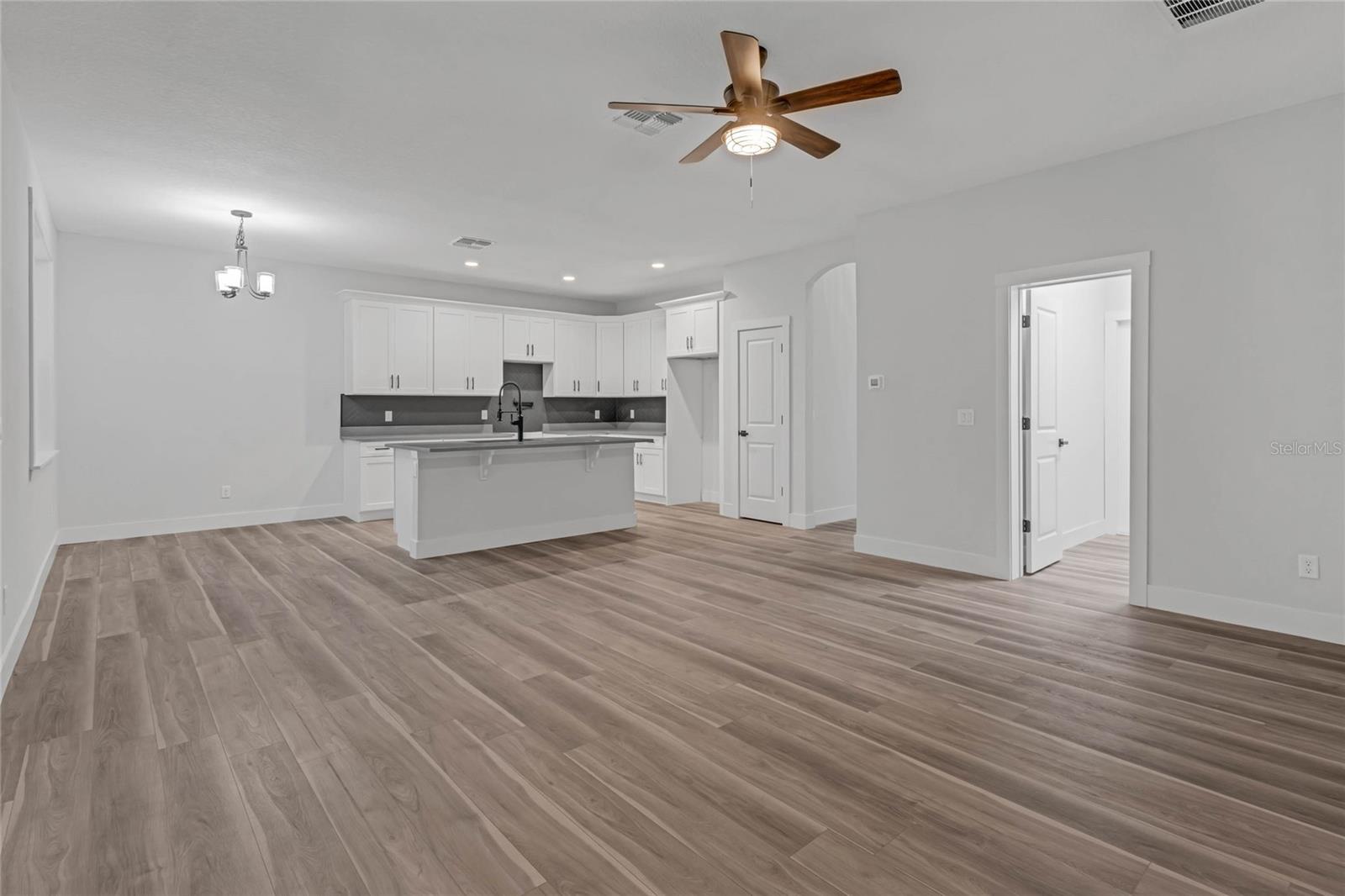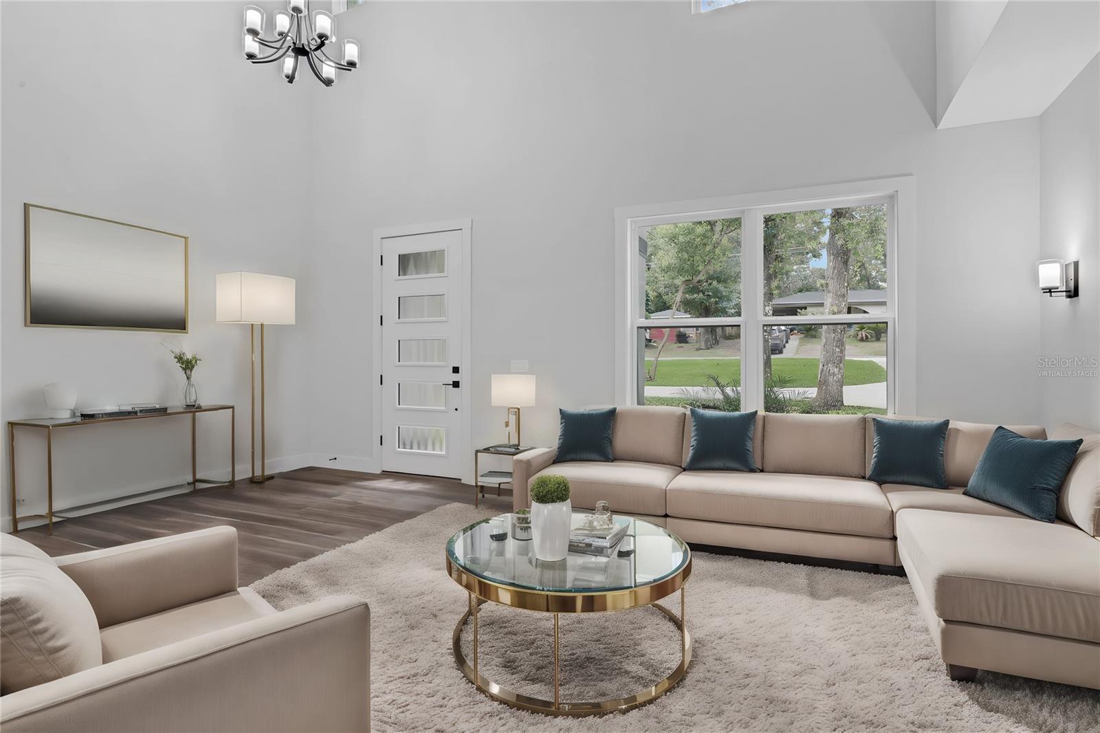 One or more photo(s) has been virtually staged. Welcome to the serene neighborhood of Mount Plymouth, where the essence of country living meets modern convenience. Nestled amidst the charm of this delightful community, this home presents a bespoke two-story, 5-bedroom, 3.5-bathroom residence designed to accommodate the needs of a growing family with style and functionality. This custom-built home stands as a testament to quality craftsmanship, with a sturdy concrete block construction spanning both floors, ensuring durability and peace of mind for years to come. As you step into the foyer, be greeted by soaring 20-foot ceilings, a grandeur that sets the tone for the elegance within. The formal dining room, adjacent to the entry, boasts a regal ambiance complemented by the expansive ceiling height. Throughout the home, attention to detail is evident, with 9-foot 4-inch flat ceilings gracing every room, adorned with refined 1 x 4 casing and 5¼-inch baseboards framing doors and windows. The heart of the home, the kitchen, and laundry areas, feature shaker-style cabinets adorned with 42-inch uppers and luxurious quartz countertops, offering both functionality and aesthetic appeal. A harmonious blend of flooring materials defines each space, with resilient luxury vinyl plank flooring adorning common areas, plush carpeting in the bedrooms, and elegant 24 x 48 porcelain tiles enhancing the bathrooms on the upper floor. Every fixture exudes quality, from Kohler to Price Pfister, ensuring a standard of excellence throughout the home. Designed for comfort and convenience, this residence boasts dual master bedrooms, each offering sanctuary and privacy. The generously sized bedrooms, provide ample space for relaxation and personalization. Meanwhile, the bathrooms showcase furniture-style vanities with double sinks and exquisite quartz countertops, adding a touch of luxury to daily routines. With an eye toward efficiency and sustainability, this home is thoughtfully equipped to minimize future maintenance and monthly living costs. The exterior is adorned with Behr Marquis paint, while the vinyl bead board ceilings in the entry and rear porch exude timeless charm. A Carrier unit with a zone system ensures customizable comfort on each floor, while an 80-gallon hybrid water heater offers both energy efficiency and convenience. Outdoor living is embraced with open arms, thanks to PVC porch railings with steel balusters and a lush St. Augustine grass lawn irrigated by a well, eliminating the need for a city water bill. Ample parking ensures convenience for residents and guests alike, completing the picture of effortless living in this idyllic countryside retreat. Welcome home, where thoughtful design, superior craftsmanship, and modern amenities converge to create a haven for anyone seeking the perfect blend of comfort and style.
