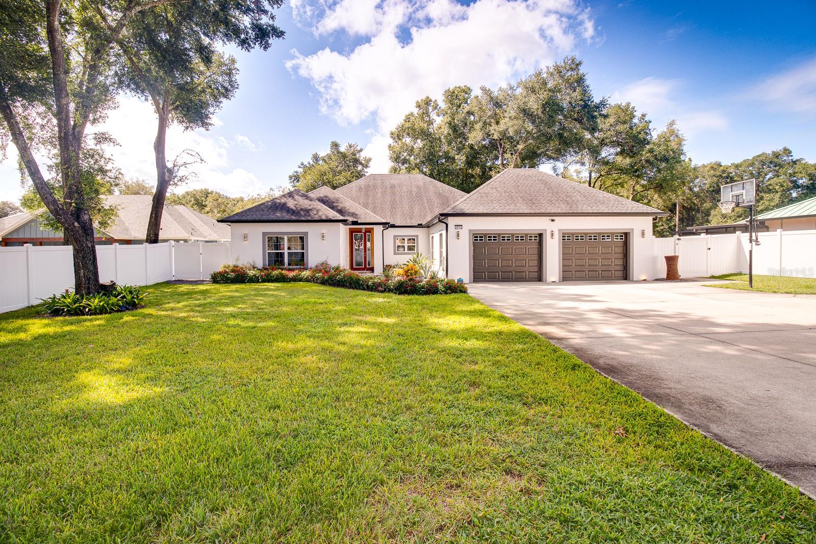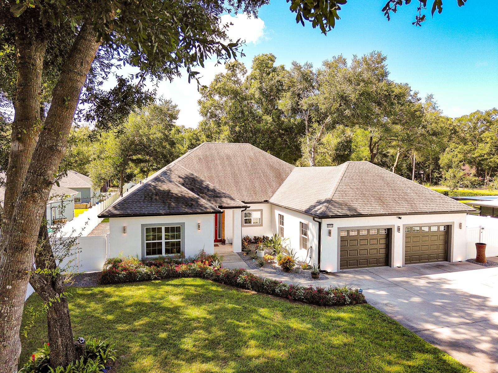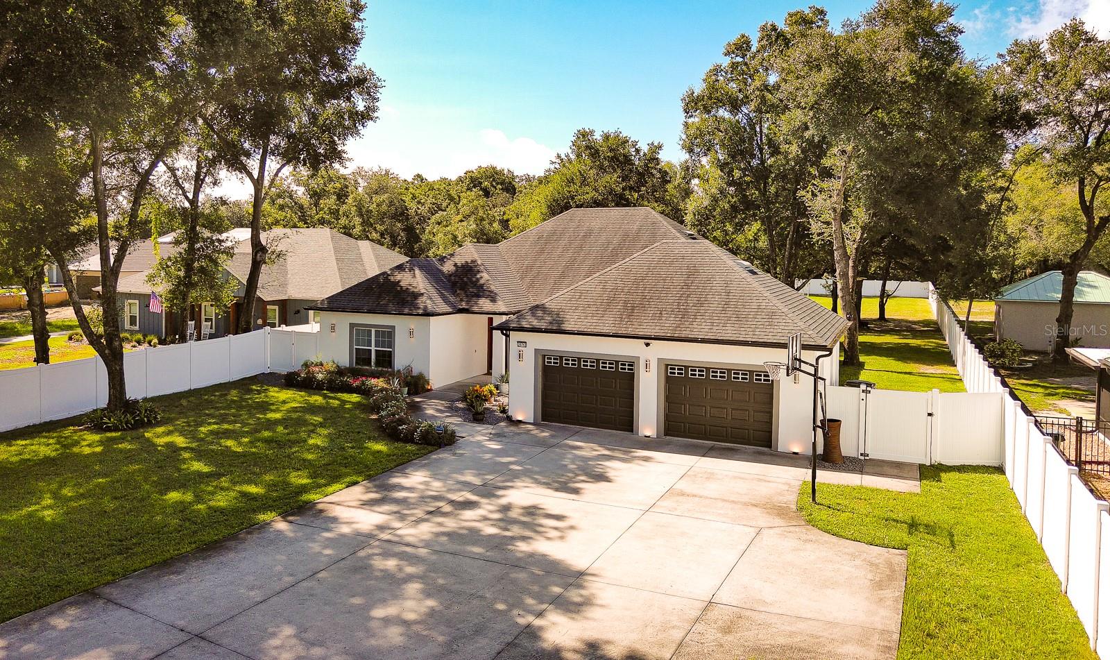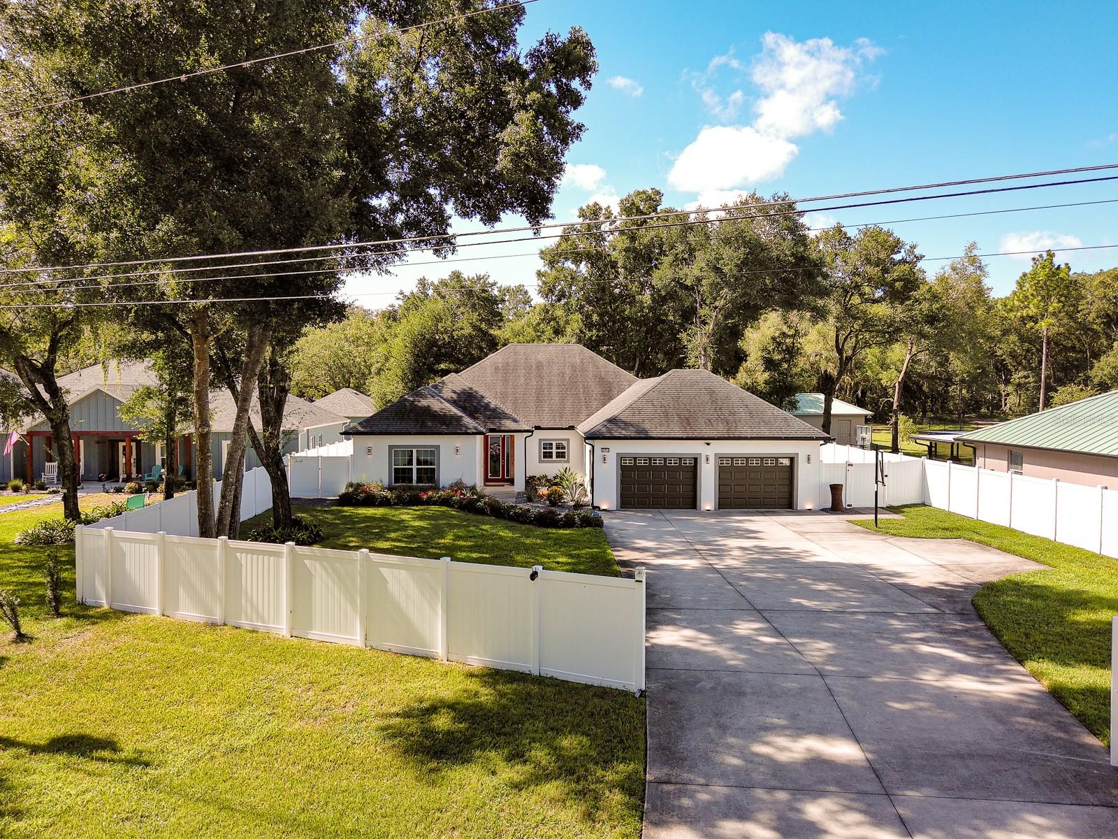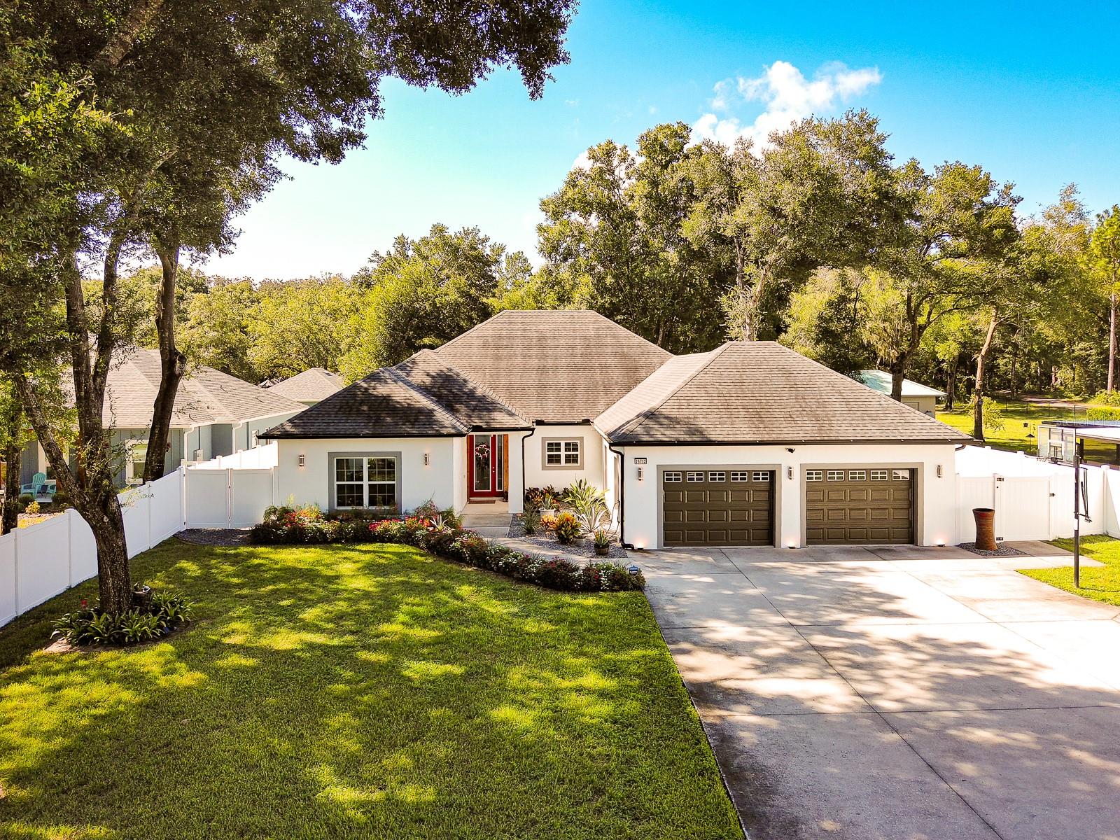 Welcome Home to this Stunning custom home on over 3/4 of an acre and shows proud ownership the minute you arrive with so much attention to details and loaded with high end features. Upon entering the home you will notice the beautiful engineered hardwood flooring, soaring ceilings and double crown moulding. The kitchen, is at the center of this amazing home, is truly a chef's dream. Designed with multiple cooks in mind, it contains two workstations, each with their own farmhouse sink, top of the line whisper quiet stainless steel appliances, a Mercury 48" range with induction stove top, two full size convection ovens and separate broiler, direct vented hood, double stacked cabinets with glass inserts, drawers for all the lower cabinets and granite countertops. The huge 7' by 3' center island offers great prep space and extra seating. The kitchen is open to the living, dining and outdoor screened in porch, providing for easy entertaining for all your family and friends. Private Double Master suites flank each side of the living room. Each wing contains its own en suite bathroom, equipped with stylish porcelain tile, double vanities with granite counters, bluetooth lighted mirrors and a huge handicap accessible shower with body jets and rain-head shower. There is an extra deep soaking tub for relaxing after a long days work in one master, the other bathroom is plumbed and wired for a jetted tub. Each wing also contains large walk-in closets with built-in shelving. The third bedroom and third bathroom are located near the front of the home. Other custom features include 3 separate heating and cooling zones, whole house water filtration, energy efficient LED lighting, fire suppression sprinkler system ,tankless hot water heater,3 Ring security cameras plus a solar powered entry gate security camera, brand new exterior and all interior paint , LED lighted custom tray ceiling in Living room, new irrigation system, custom solar landscape lighting, oak trees professionally canopied, high impact double paned windows, custom blinds and privacy tint just to name a few. Oversized garage with a Versa lift attic storage lifting system and extra long driveway with an in-ground adjustable basketball hoop that can accommodate multiple vehicles with extra parking in the back for storing a boat or RV. Plenty of space in the large fully fenced in property with gate to add a pool or outbuilding. Perfect location for those looking for privacy but want convenient access to all the amenities Lake County and surrounding areas has. Don't miss this one and Schedule your showing today for this fabulous home!