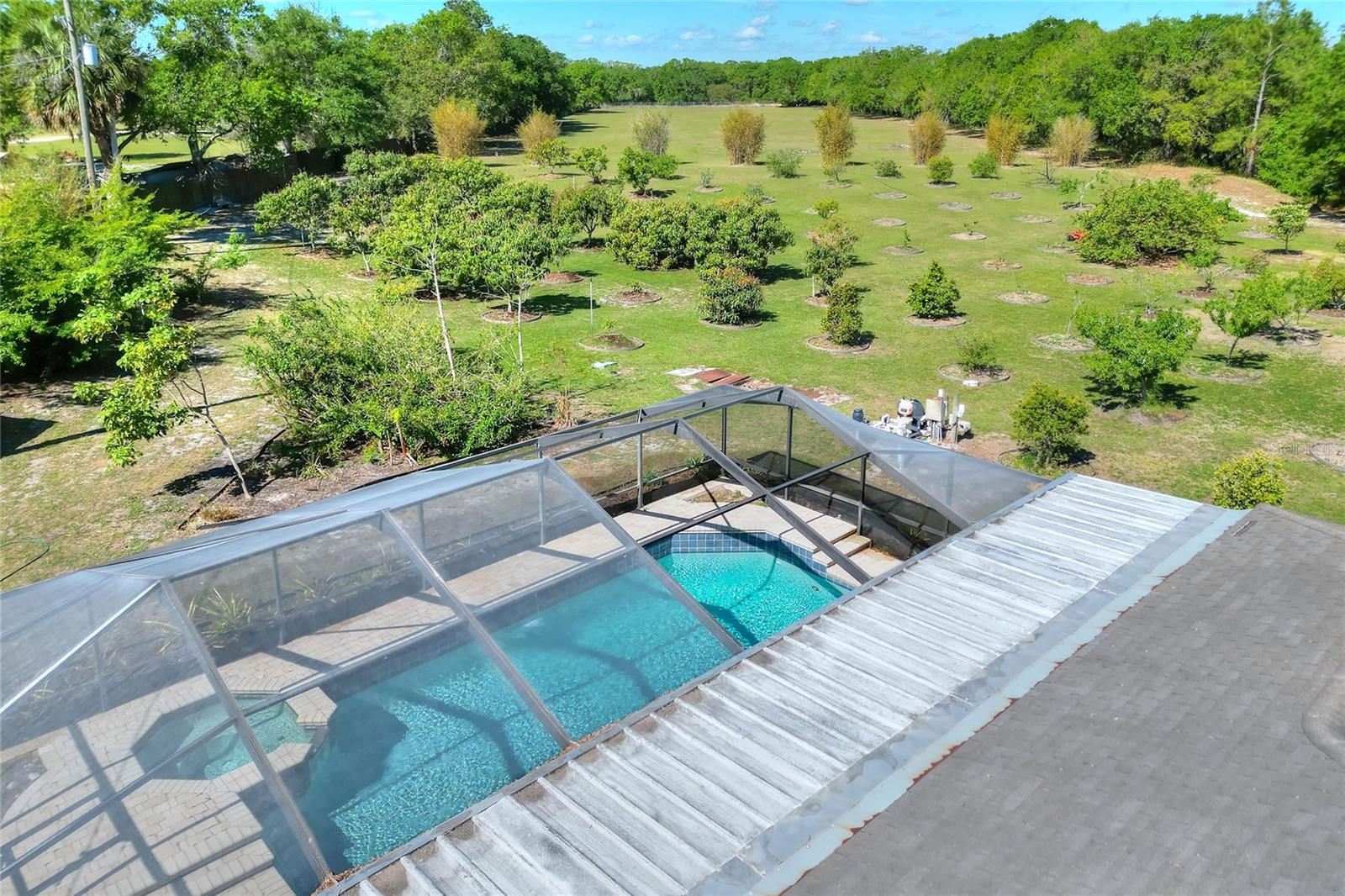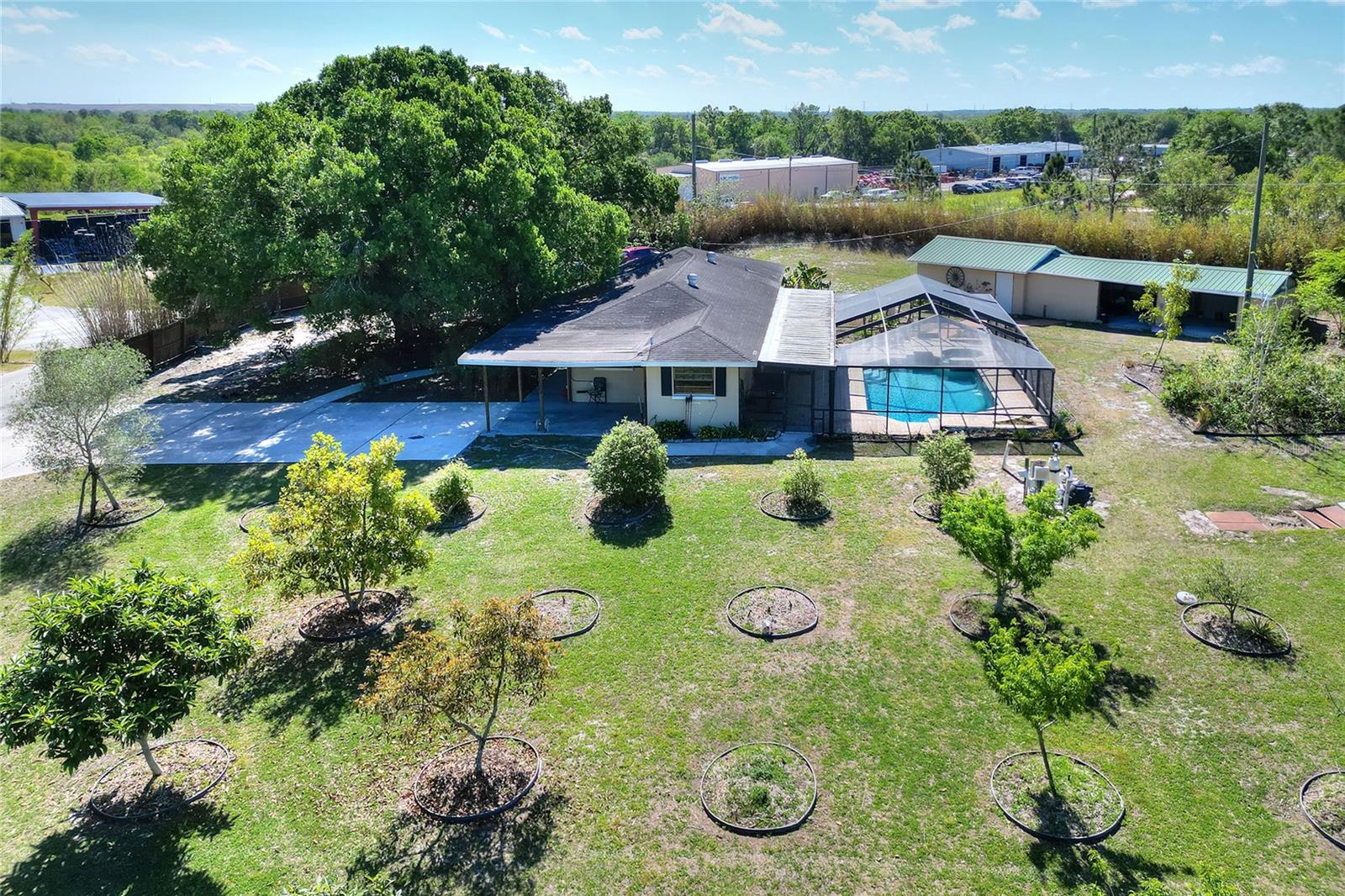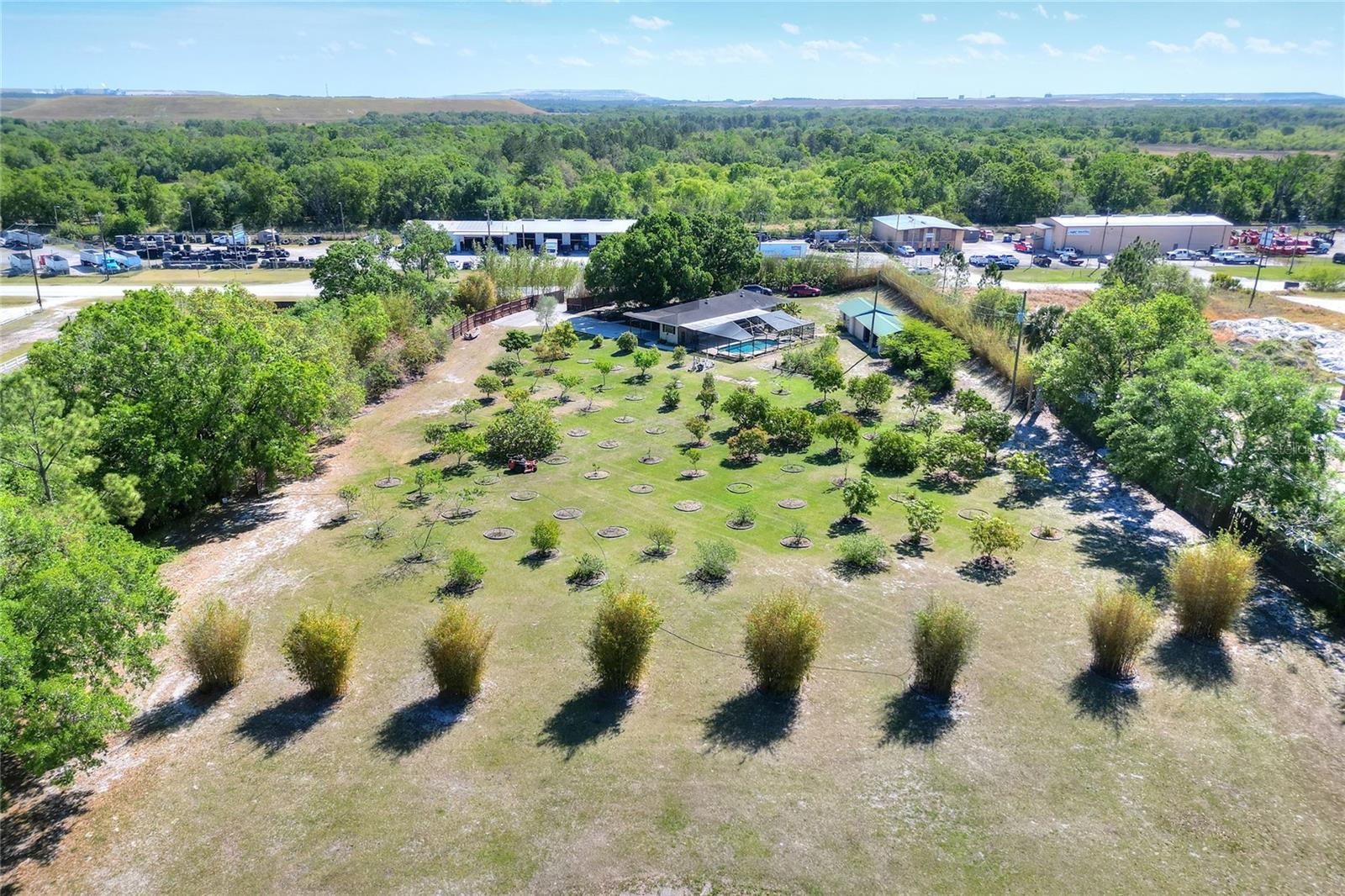 Back on the Market!! Here's your chance to own this incredible hilltop property!! 9.2 acre parcel is ready to set up your paradise! Zoned BPC1 (Business Park Center) creates endless possibilities for the future. What is your vision for this 9.2 Acre Parcel?! Horses, Livestock, Hobby Farm, Apiarist, Orchard, Event Venue, Business? Over 335 feet of frontage property along SR-37 South. Fixer Ranch style, Pool Home will need renovation or possible tear down; replumbed with CPVC, screened in-ground gunite pool with screened area in need of rescreening, but has potential. Detached 16 x 22 Block Structure with Metal Roof used for equipment storage, tools and Laundry. There are ~100 fruit trees with 35 species of mangos, plus papayas, citrus, etc., on the property. There is an abandoned railway on the northern perimeter with service road that is in the shade under 100 year old oak trees. The entire perimeter has wooden fencing. Mature landscaping and Bamboo for privacy. Property is being sold AS-IS. All dimensions are estimated and will need to be verified by Buyer or Buyers' Agent.