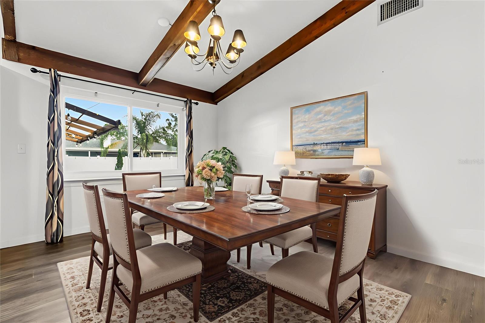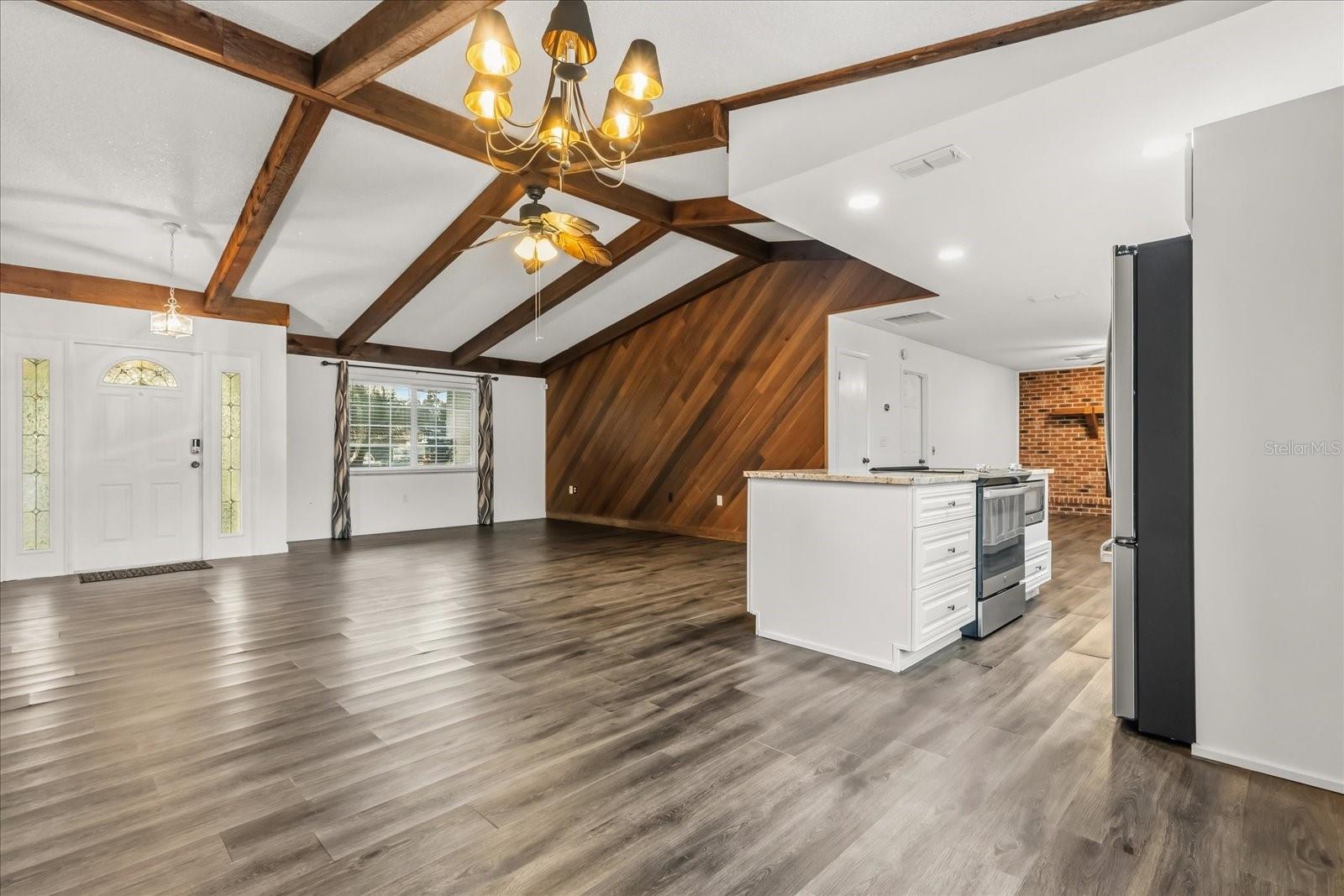 One or more photo(s) has been virtually staged. Charming Renovated Home in the Heart of Mulberry – Where Rustic Character Meets Modern Comfort! Nestled on a quiet, picturesque street in an established neighborhood surrounded by mature trees, this beautifully renovated home in the Town of Mulberry (Polk County) perfectly blends modern amenities with rustic charm. Set on a spacious 0.31-acre lot, it offers comfort, style, and a true sense of community in a peaceful setting. Step inside to an inviting open floor plan featuring cathedral ceilings with exposed wood beams and laminate flooring throughout, creating a bright and welcoming atmosphere. The living area centers around a brick decorative fireplace, perfect for cozy evenings, while the Florida room offers a second wood-burning fireplace—adding warmth and character to every gathering. The updated kitchen is a chef’s delight with stone countertops, stainless steel appliances, and ample storage and prep space, making cooking and entertaining effortless. Each spacious bedroom offers comfort and style, ensuring restful nights. Both bathrooms have been tastefully renovated with contemporary finishes, providing a spa-like experience. Outdoors, enjoy a fully vinyl-fenced yard surrounded by lush landscaping with seasonal color, beautiful accent lighting, and plenty of space for pets, play, or a garden. Entertain year-round on the covered wood deck and back patio, unwind by the fire pit, or take advantage of ample parking for a boat or RV with 220-amp hookup. A storage sheds and a two-car garage add extra convenience. Located in a quiet, close-knit community, this home offers the best of both worlds—peaceful living with quick access to local shops, dining, and major roads. Thoughtfully updated and lovingly maintained, this Mulberry gem is ready to welcome you home. ***A 2.75% assumable FHA loan is available.