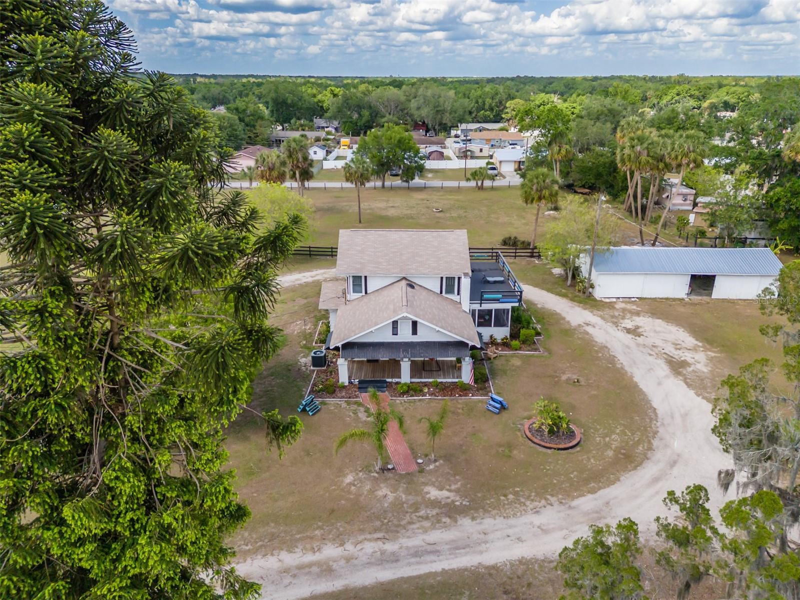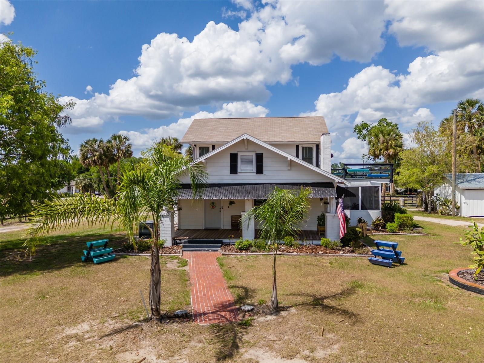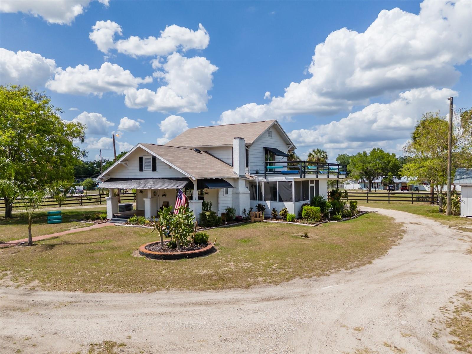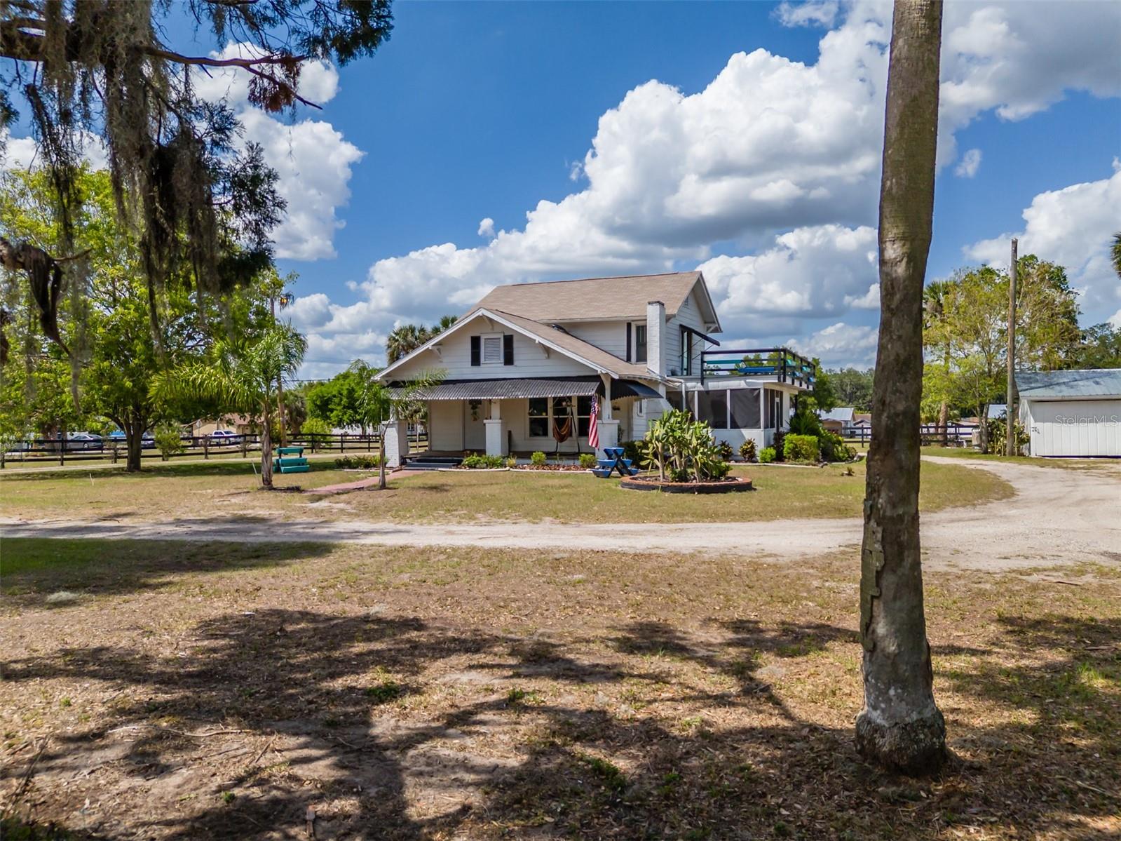 NEW LOWER PRICE! Step into the timeless charm of the adorable 1920s farmhouse, perfectly set on over two acres of serene country living. From the inviting front porch to the side screened porch there are so many spots to enjoy your morning coffee. The spacious living room/dining room has updated flooring and a wood burning fireplace creating warmth and character. The primary bedroom has ample closet space and an en-suite bathroom with custom tilework in the shower. The kitchen ceiling was recently raised with new lighting. There are lots of cabinetry and the perfect spot for a dinette table. Up the spiral staircase are two more bedrooms and a full bathroom, featuring updated countertops, sinks and a refurbished tub. New sliding doors lead to a rooftop deck, with new railings. For hobbyists or those needing extra space, the oversized detached garage features a deluxe workshop and even a potting shed with a sink in the back. The circular drive adds convenience. There's plenty of parking for an RV, boat or many cars! The approval process with the county has already been started to subdivide the parcel into four lots, creating a lot of options for future investment opportunities. New roof March 2025. AC 5 years old. This unique property won't last long! Call today!
