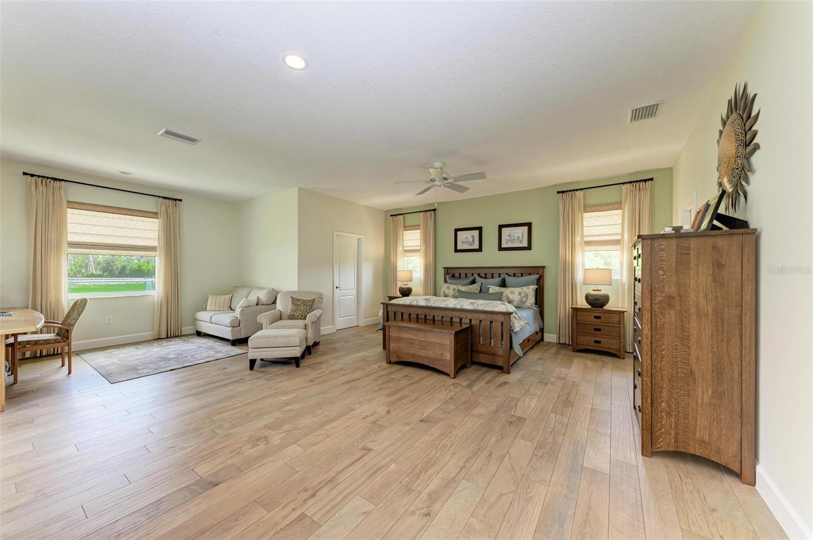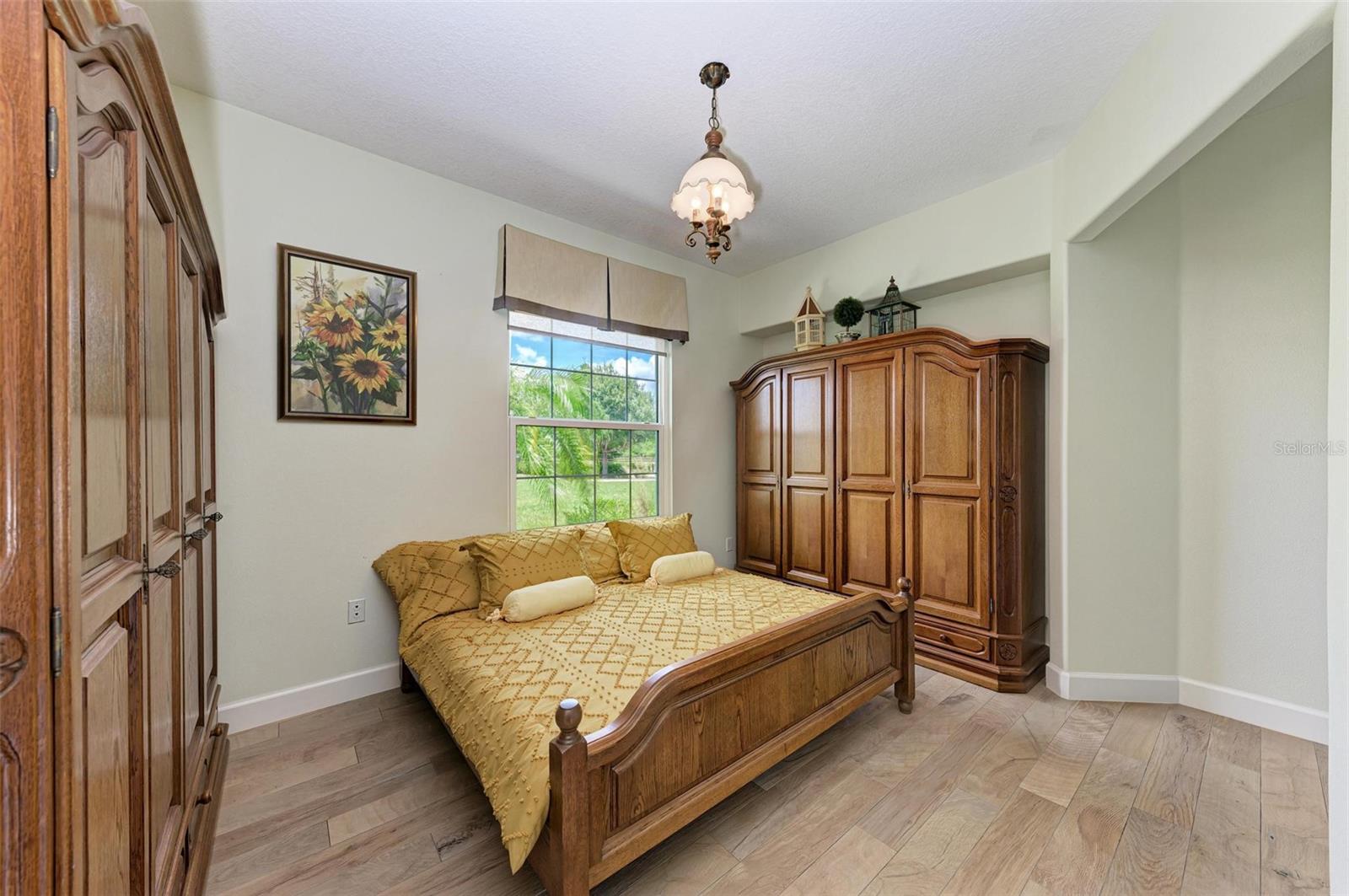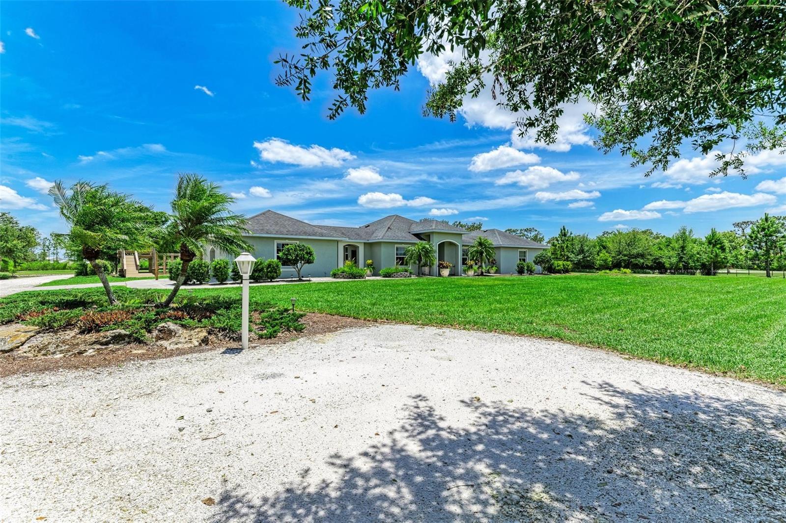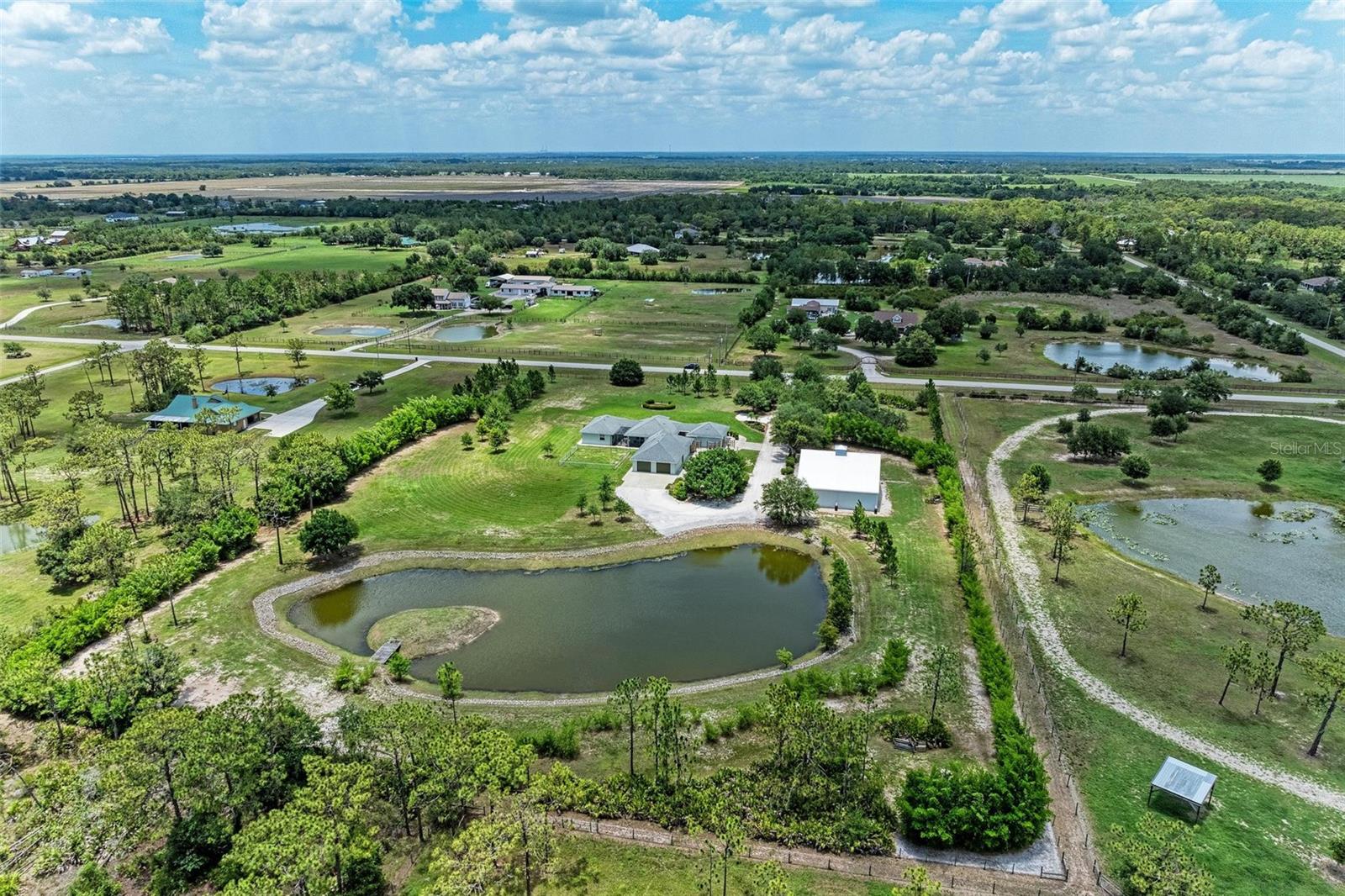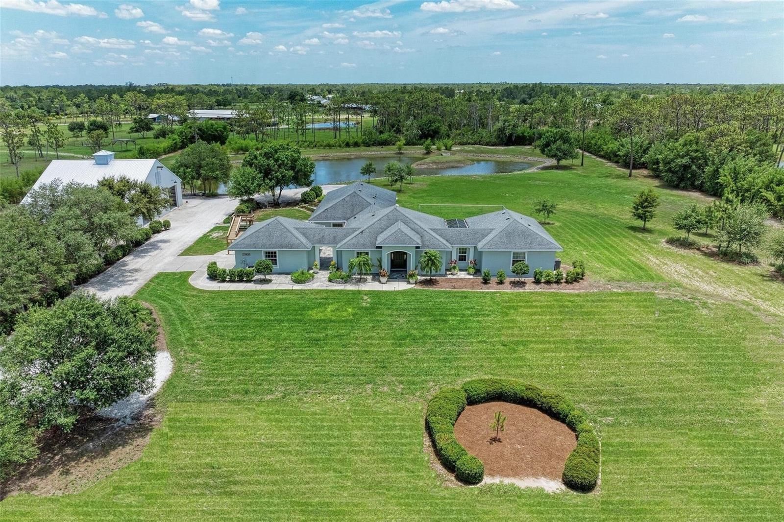 Step into the lap of luxury with this impeccably updated estate home nestled on over six acres of picturesque land boasting a stunning large lake and a spacious 2,800 square-foot enclosed pole barn with three 12x12 garage doors. Perfect for housing a camper, boat, or utilize for extra parking. Easily convertible into an equestrian stable, this property offers endless possibilities for the discerning buyer. As you enter through the front gate, privacy and elegance greet you at every turn. The driveway is lined with mature oaks, and a bamboo hedge provides a privacy screen for the entire back yard. Extensive land development created this high and dry property to enjoy. The recently renovated home features impact windows and a new roof, ensuring both, style and durability. The open-concept design seamlessly transitions into the inviting living room, ideal for both, relaxing evenings and lively gatherings. Entertain in style in the bright and airy dining room, complete with large windows that flood the space with natural light. The kitchen features solid wood cabinets, exquisite granite countertops with a bullnose edge, and stainless-steel appliances. The high-end Fisher & Paykel induction stove and commercial Viking stove hood make cooking a pleasure. The adjacent chef's pantry, complete with a refrigerator and private coffee bar, caters to every culinary need. Retreat to the luxurious bedrooms, each boasting private ensuite bathrooms for the ultimate comfort and convenience. The expansive master suite spans over 1,000 square feet and features a sitting room, two large walk-in closets, and a breathtaking bathroom with a Kohler Tea-for-Two cast iron tub and walk-in shower. Additional highlights include a second master bedroom with a clawfoot tub, large walk-in shower and private entrance, a third bedroom with custom armoires and a private bathroom, and a versatile bonus room perfect for a pool table, gym, or crafting space. Italian tile flooring adds an elegant touch throughout the home, while ample storage ensures effortless organization. Outside, the driveway wraps around to the rear oversized 2-car garage with 8’ tall garage doors to accommodate larger vehicles, and ample space for parking a golf cart or ATV. Enjoy the serene surroundings from the private courtyard patios, offering the perfect spot for al fresco dining or simply taking in the tranquil views. With its unparalleled blend of luxury, comfort, and functionality, this stunning estate home presents a rare opportunity to live the lifestyle of your dreams. The design of the home with each bedroom suite having its own private entrance offers possibilities for multi-generational families. Don't miss your chance to make this exquisite property your own. The home is priced to sell. Schedule your private showing today!