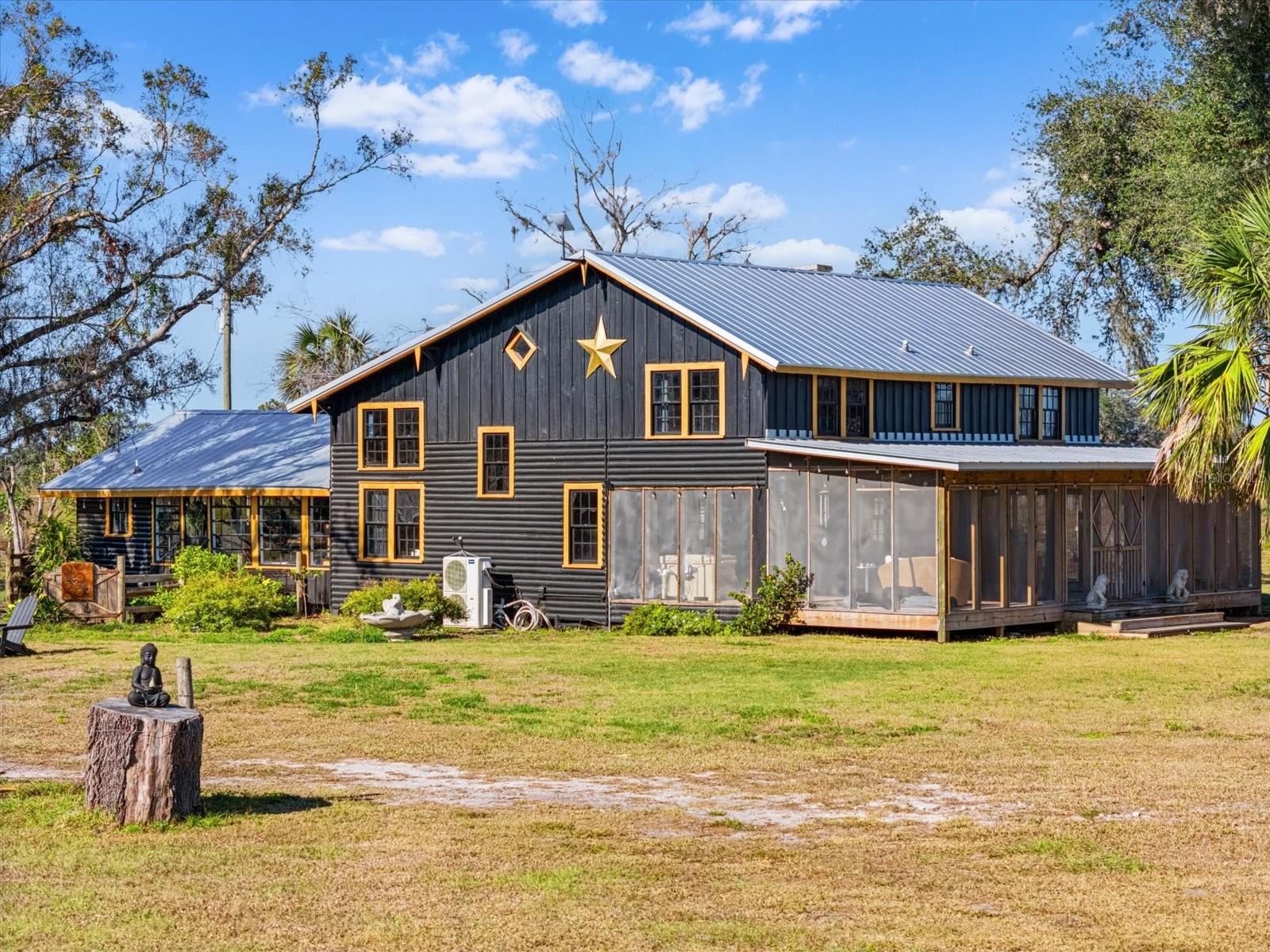 Step into ‘Old Florida’ with this fully restored historic farmhouse on 8 acres in rural Myakka City. Originally built in 1941 by Clint and Eva Hutches, both former Manatee County Sheriffs, this authentic log home is steeped in history and charm. Restored by French designer, Gaëlle Wizenberg, this home has been beautifully reimagined while preserving its original, historic character. If you've ever dreamed of living ‘off the grid’, becoming fully sustainable, and growing your own food, while still being within close proximity to modern conveniences such as shopping & dining found at Lakewood Ranch or the stunning beaches of Lido & Siesta Key, your dream is now a reality. The restoration of this home included extensive updates such as a new metal roof, AC units, plumbing, tankless water heater, well equipment, and a top-of-the-line solar system with batteries, which powers the entire property. As you approach the property, you'll be greeted by the awe-inspiring beauty of the home and its surroundings. The soaring vaulted ceilings and exposed beams reflect the beautiful, rustic heritage of Florida’s cattle ranching era. The rich, warm tones of cedar and tidewater pecky cypress wood create an inviting, natural atmosphere. The centerpiece of the home is an impressive brick fireplace, while the floors feature original pine and ash wood. For the culinary enthusiast, the farmhouse boasts two kitchens: a spacious prep kitchen with ample pantry storage, and a chef's kitchen designed to impress. Features include a state-of-the-art porcelain island, black cabinetry accented with gold hardware, thick butcher block countertops, and high-end appliances such as a Bertazzoni 6-burner gas stove, Fisher & Paykel double-drawer dishwasher, and a large double-door fridge/freezer. The kitchen offers a direct view of the thriving vegetable garden and fruit tree grove. The home features a new, fully screened front porch, perfect for relaxing while enjoying the shade of a majestic Grand Oak in the front yard. The property is a true retreat, having served as a yoga and wellness center, as well as an educational hub for students interested in organic and regenerative farming practices. The property has a thriving “food forest” with a wide variety of vegetables, herbs, and fruit trees, including cabbage, arugula, tomatoes, cucumbers, kale, citrus, papaya, mango, avocados, and much more. A true homesteader’s dream, this property also has multiple chicken coops and even a rabbit hutch. The property also includes a charming cabin, also built in 1941, that has a full bathroom and kitchenette; ideal for use as a guest suite or office. There are 2 large pole barns that provide ample storage and could easily be converted into horse stables. Located on a quiet, dead-end road, the property offers privacy and tranquility. It backs up to the 4,500-acre Blackbeard Ranch and is just minutes from Terra Nova Equestrian Center, making it ideal for horse lovers and equestrian pursuits. Additional amenities are on the horizon, including the new Miakka Golf Club just 2 miles away, and the vibrant communities of Waterside and Lakewood Ranch are just a 30-minute drive. Mineral rights convey with the 3 parcels. Bitcoin is accepted for purchase of this property.