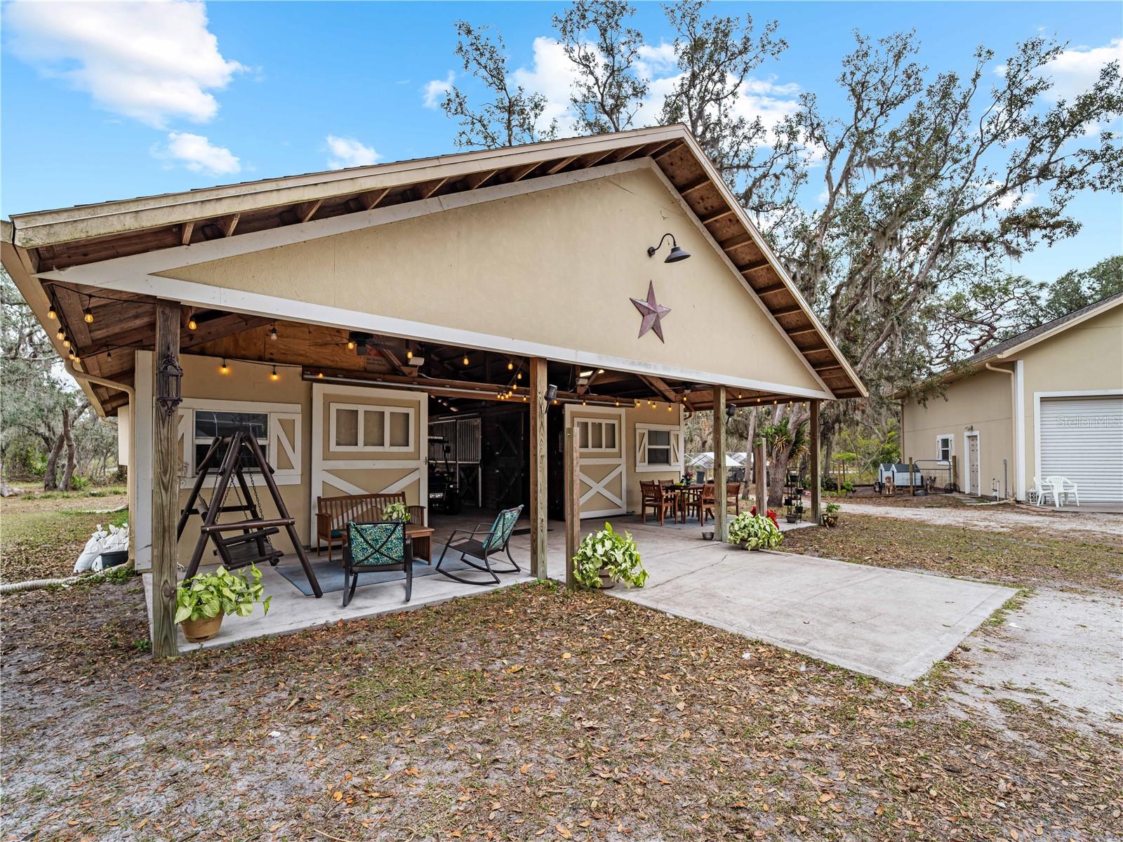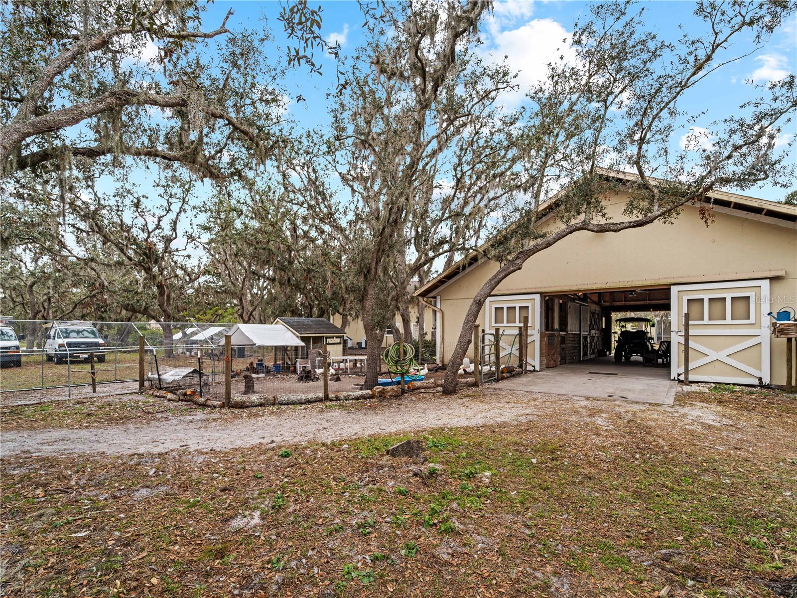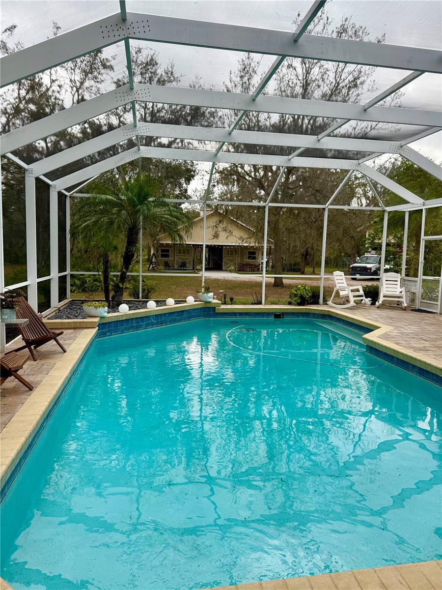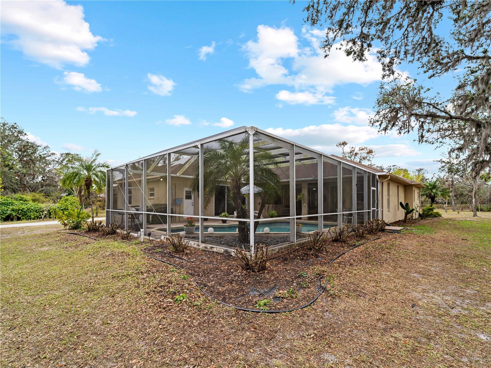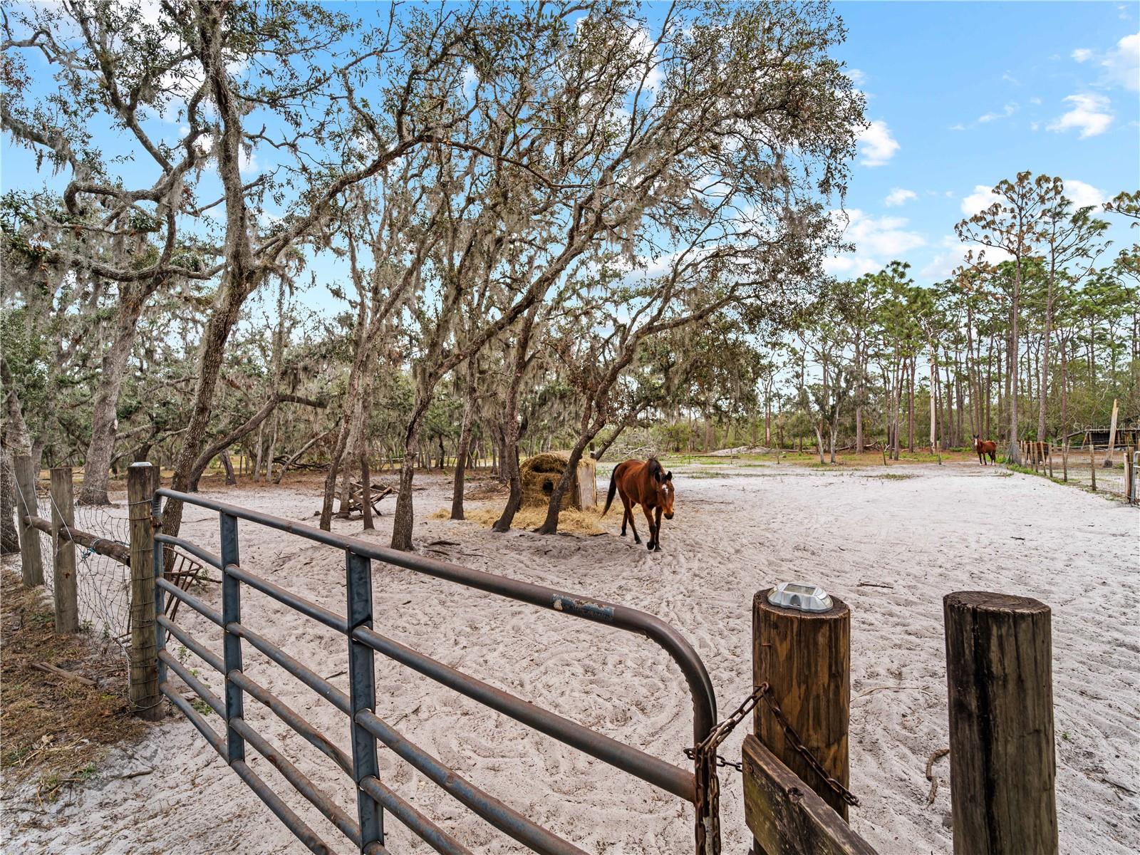 Price correction! This home is staged for you and vacant. Where are you going to find over 5 acres, a single family home, a Pole Barn and RV Garage for this price? Come live near everything the Lakewood Ranch area has, but with all the space that you need! Located in Saddlebag Creek Ranches, This Four bedroom, Three bath, Pool home is situated on a beautiful 5+ acre property! You are greeted by a Brand new $10,000 front gate installed in 2024 with a keypad for entry. Down the extensive driveway, take the sidewalk to the front door and pass by the beautiful Koi pond and lush landscaping. Walk through the large double front doors into the formal living room with its cathedral ceilings and sliders out to the lanai with beautiful pavers. The dining room, with its plantation shutters and ample space for all of your family gatherings. The beautifully remodeled kitchen is accented by a breakfast bar to sit and enjoy conversations with the cook. Complemented by a walk in pantry, island work station and built in computer desk alongside the kitchen nook overlooking the pool through the aquarium window. There is a separate laundry room and another set of washer/dryers in the RV garage for all that dirty yard clothing! The Primary bedroom is very spacious and has His and Hers walk in closets, a large bathroom with two separate sinks, a vanity area, a Garden tub and a large walk in shower. Bedrooms 1 and 2 are located on the opposite end of the house in their own separate wing, with a shared bathroom in between and a pocket door for privacy. The Fourth bedroom is located off the Family room at the back of the house with an ensuite bathroom with walk in shower. This room can also be used as an office or den as well as the pool bathroom. There is a 30 x 16 Saltwater pool with new pool equipment. A new well pump was installed in 2024 for the septic tank. The garage is a very spacious 3 car side entry. Did I mention that the Roof is being replaced before closing? Further back into the yard there is a large pole barn (48 x 36) built in 2018 with (Three) 12 x 12 Stalls with automated water, (Two) 6 x 12 Mini stalls, a 12 x 12' Feed room and a 12 x 12 Tack room with storage above. The barn has a 12 x 36 covered front porch area to sit and enjoy your evening looking at the stars while enjoying a glass of wine. Opposite the pole barn is a 34 x 24 garage that can house your RV or Boat with a floor to ceiling 20' peak! The two front doors are 12 foot tall roll doors. The back door is 10 ft tall and the garage has an elevated 12 x 12 storage space and underneath that a workspace with dedicated electric for those late nights tinkering. You will also find in the garage a spare set of washer and dryers for all the dirty clothes from yard work! The entire perimeter of this property is fenced with field fencing and cross fenced as well. Along the front of the property it is four board fenced. There is water access for the pastures in multiple locations as well as a covered feed and water area for the cows and horses. The property has an irrigated garden area as well as fruit trees such as: Orange, Grapefruit, Tangerine, Fig, Mango, Guava and Avocado! Topping it off with a 2 1/2 mile wooded bridle trail within the neighborhood. The livestock is also available for purchase through a separate addendum. Come out and see this property and enjoy the fresh air before it is SOLD!
