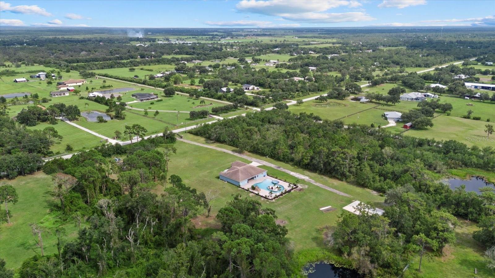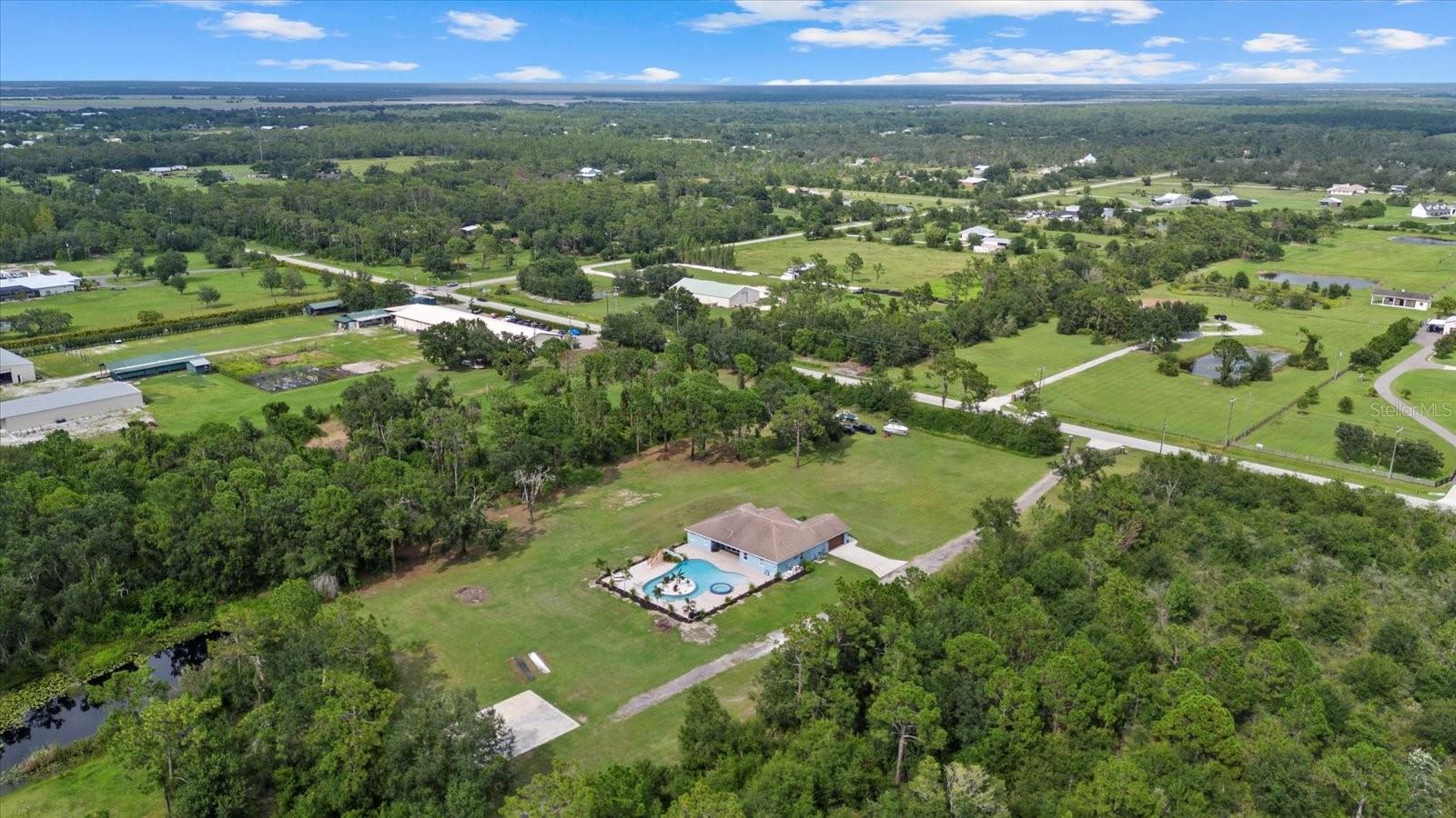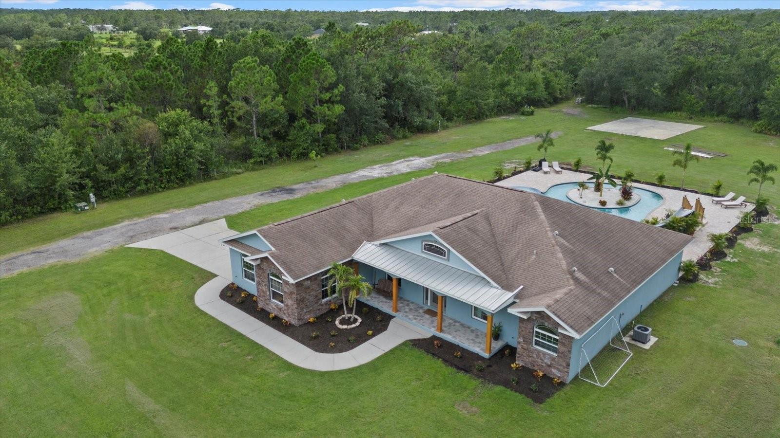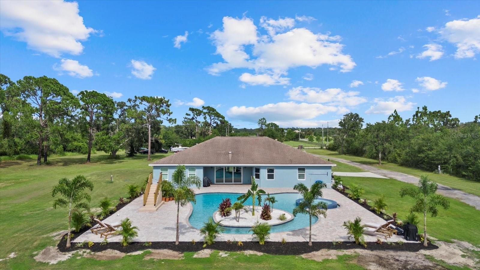 Amazing 5 acre estate property just 10 minutes from Lakewood Ranch, perfect for those who want the privacy and the feel of living in the country and still being close to all amenities. This exquisite 2018 single-story estate offers 2,998 sq. ft. of beautifully designed living space with 4 bedrooms, 3 baths, and a versatile flex room that can serve as an office, formal dining room, or play space. The home features an open-concept entertaining area with a large, bright kitchen—perfect for gathering with family and friends. Recent upgrades have transformed the property into a true resort-style paradise, starting with the spectacular pool complex boasting a functional lazy river, beach entry, thrilling 15-foot slide, and a luxurious 12-person spa. A state-of-the-art Pentair automation system allows you to control every feature with ease, while a 400,000 BTU heater and five ENERGY-STAR variable-speed pumps (two dedicated to the lazy river) keep everything running efficiently. The newly poured 40' × 50' concrete slab is permitted and engineered for a structure, could also be perfect as a sports court. Would be great for pickleball, tennis, basketball, or any activity you desire. Offering the perfect blend of luxury, recreation, and comfort in a private country setting, this home is the ultimate year-round retreat.