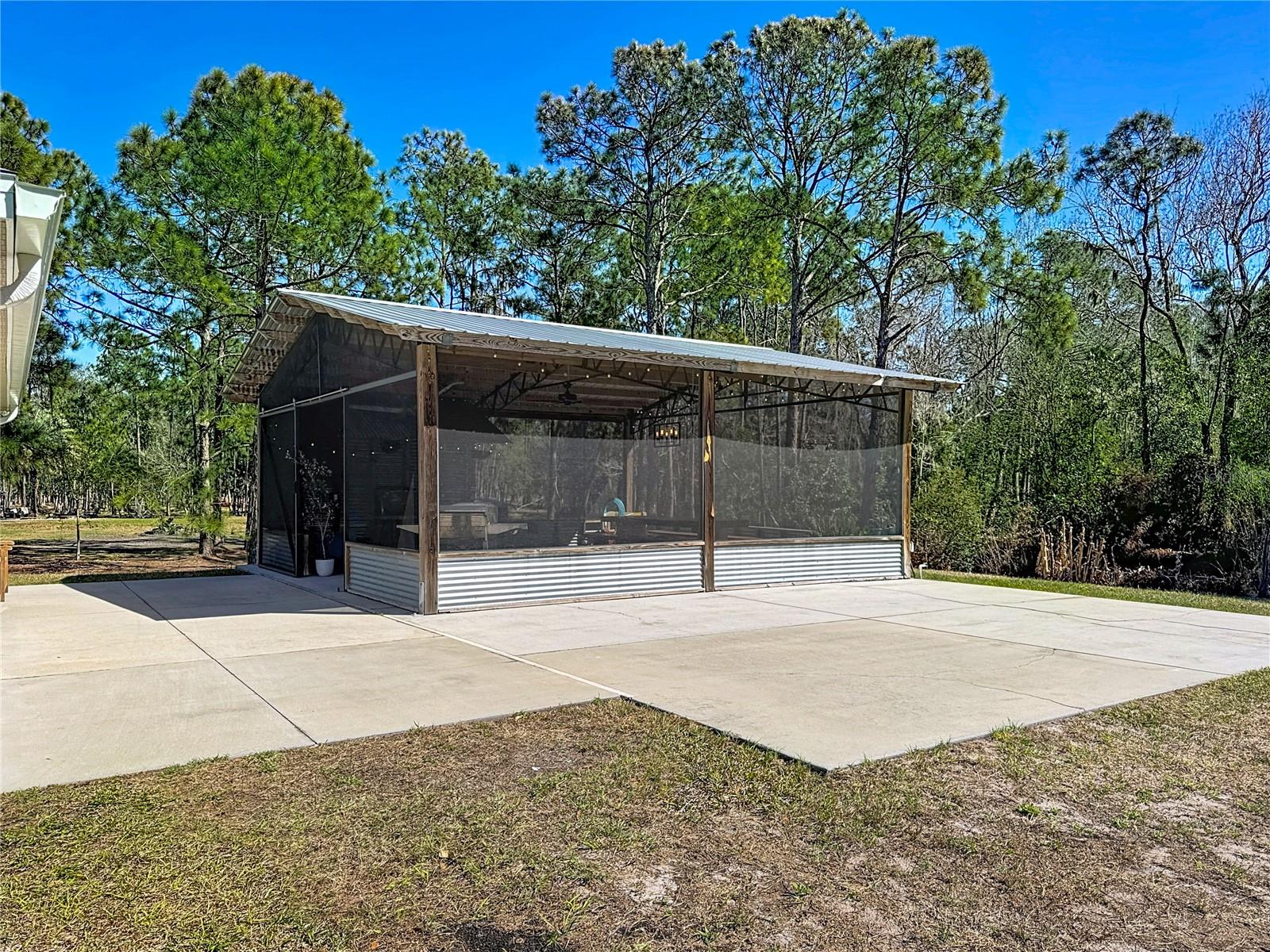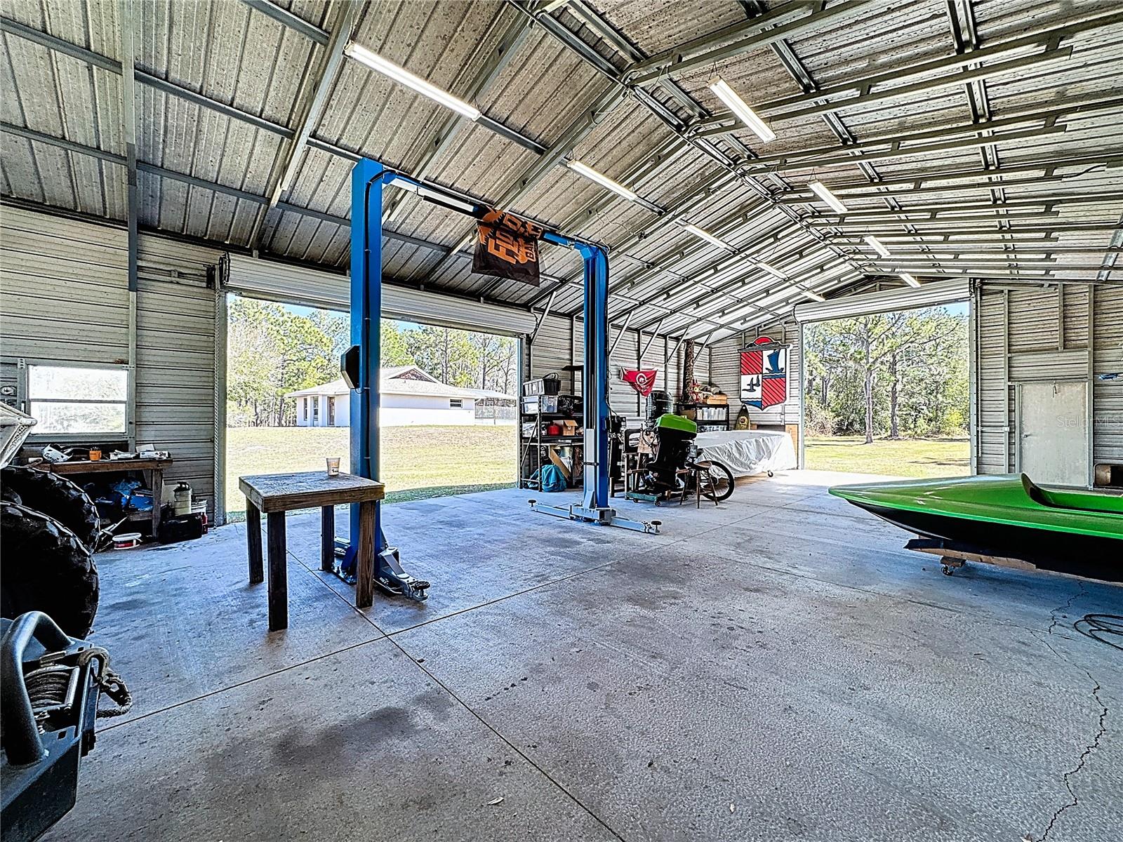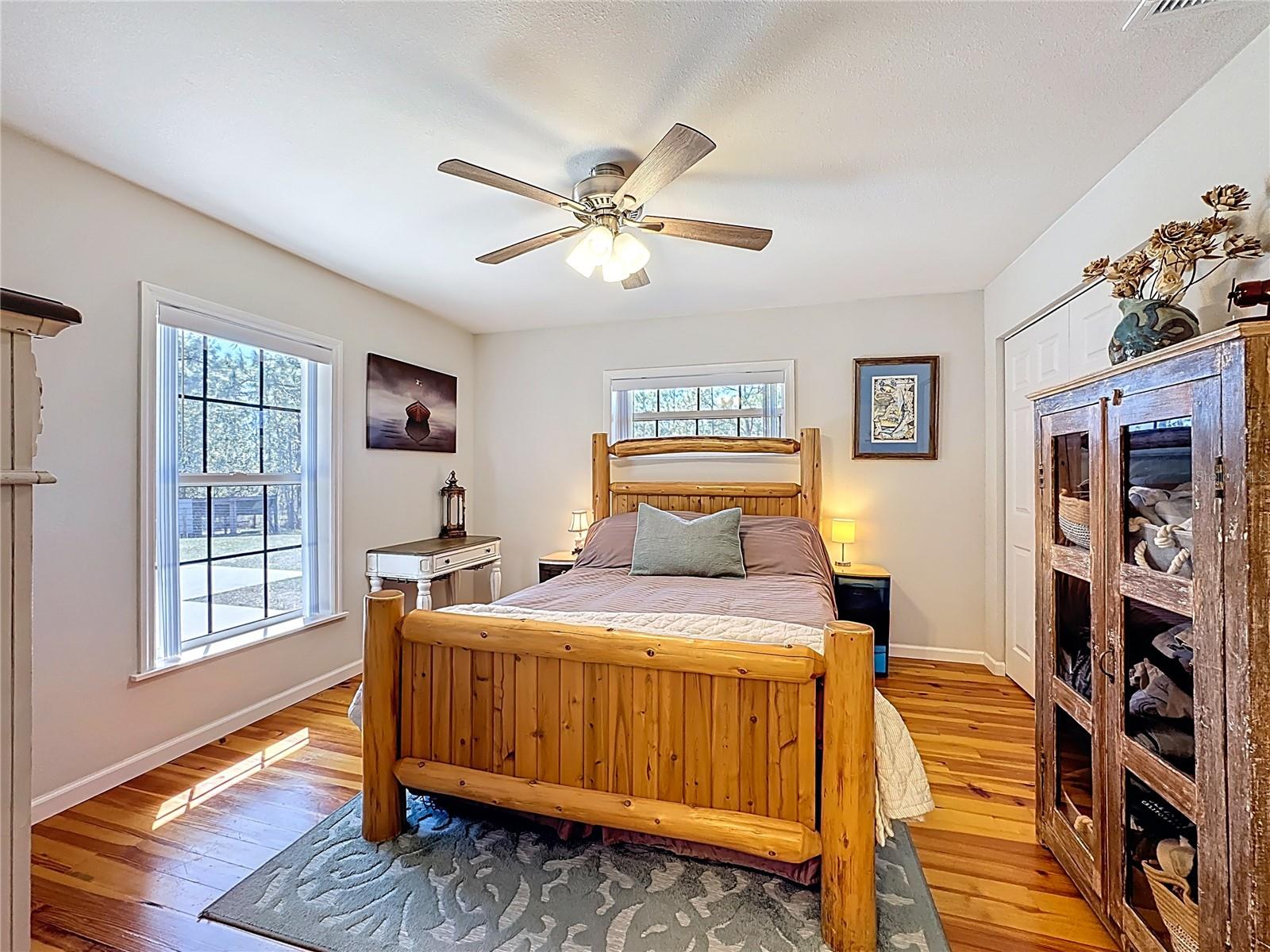 Well-maintained 2BR/2BA single-family home situated on 6.06 acres. Home offers 992 sq ft of living space with an updated kitchen and move-in ready condition. Interior features real solid hardwood floors sourced from a sawmill—not box store material—adding warmth and character throughout. Outstanding 60x30 detached metal building on concrete slab featuring a 12,000 lb 2-post lift (installed 2024), three roll-up doors (one on each end and one on side), and door clearance suitable for trailered boat or RV. Shop is equipped with water and ample power to support welder and compressor. Additional 30x30 detached screened patio with water and electric—ideal for entertaining or outdoor workspace. Property includes fenced area with medium-sized chicken house featuring automatic door and waterer. Mature woods with abundant wildlife and a stocked pond enhance the natural setting and recreational appeal. Ideal setup for hobbyist, mechanic, small business use, or those seeking private acreage with functional improvements.