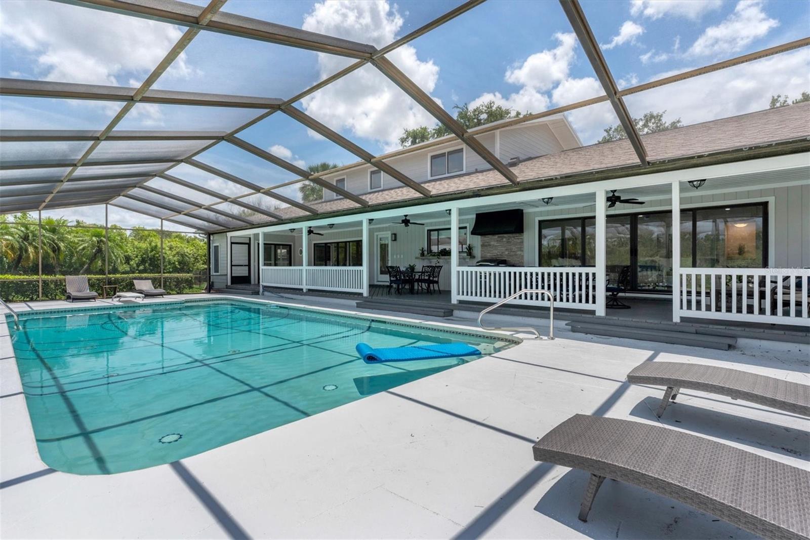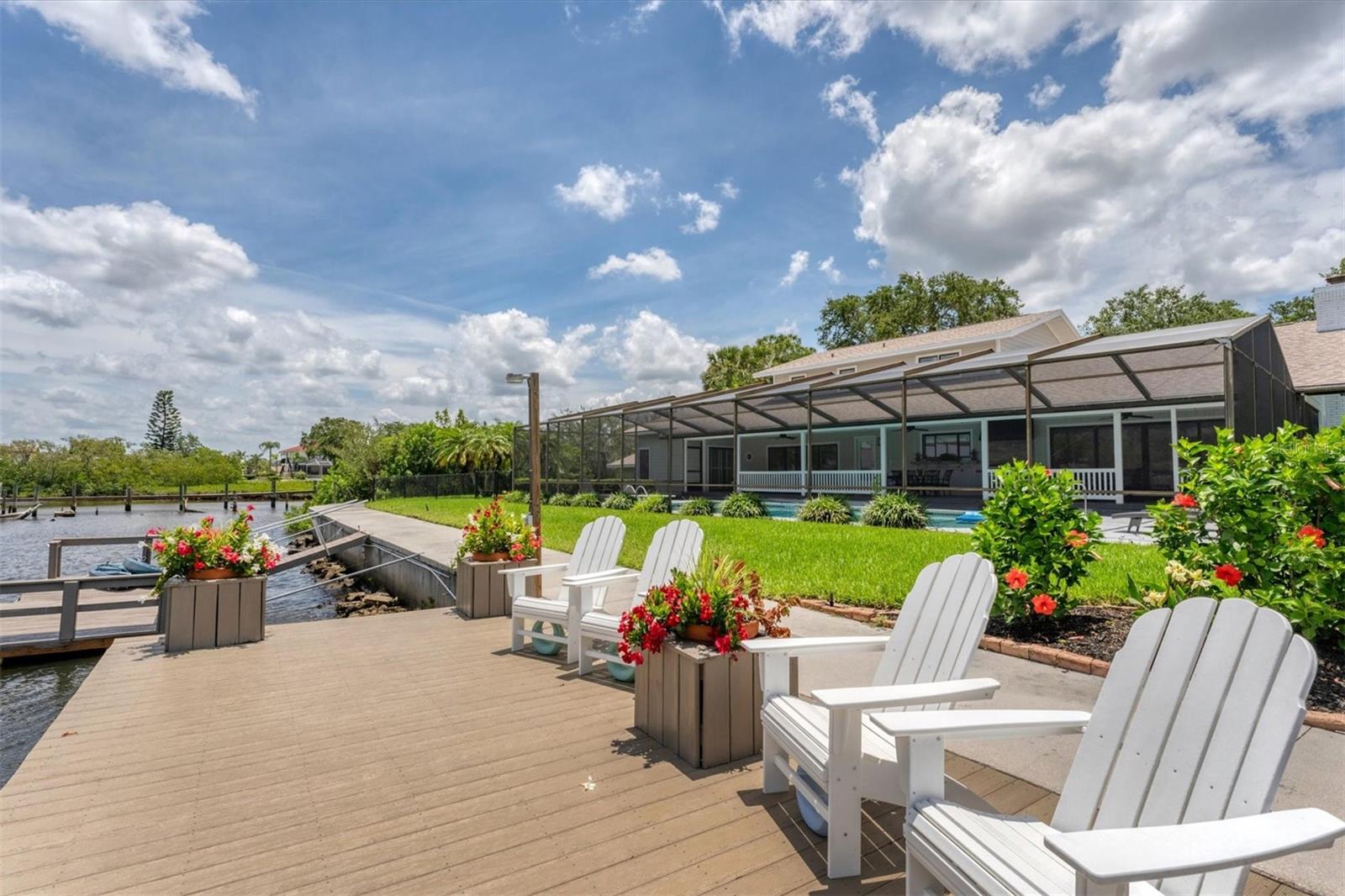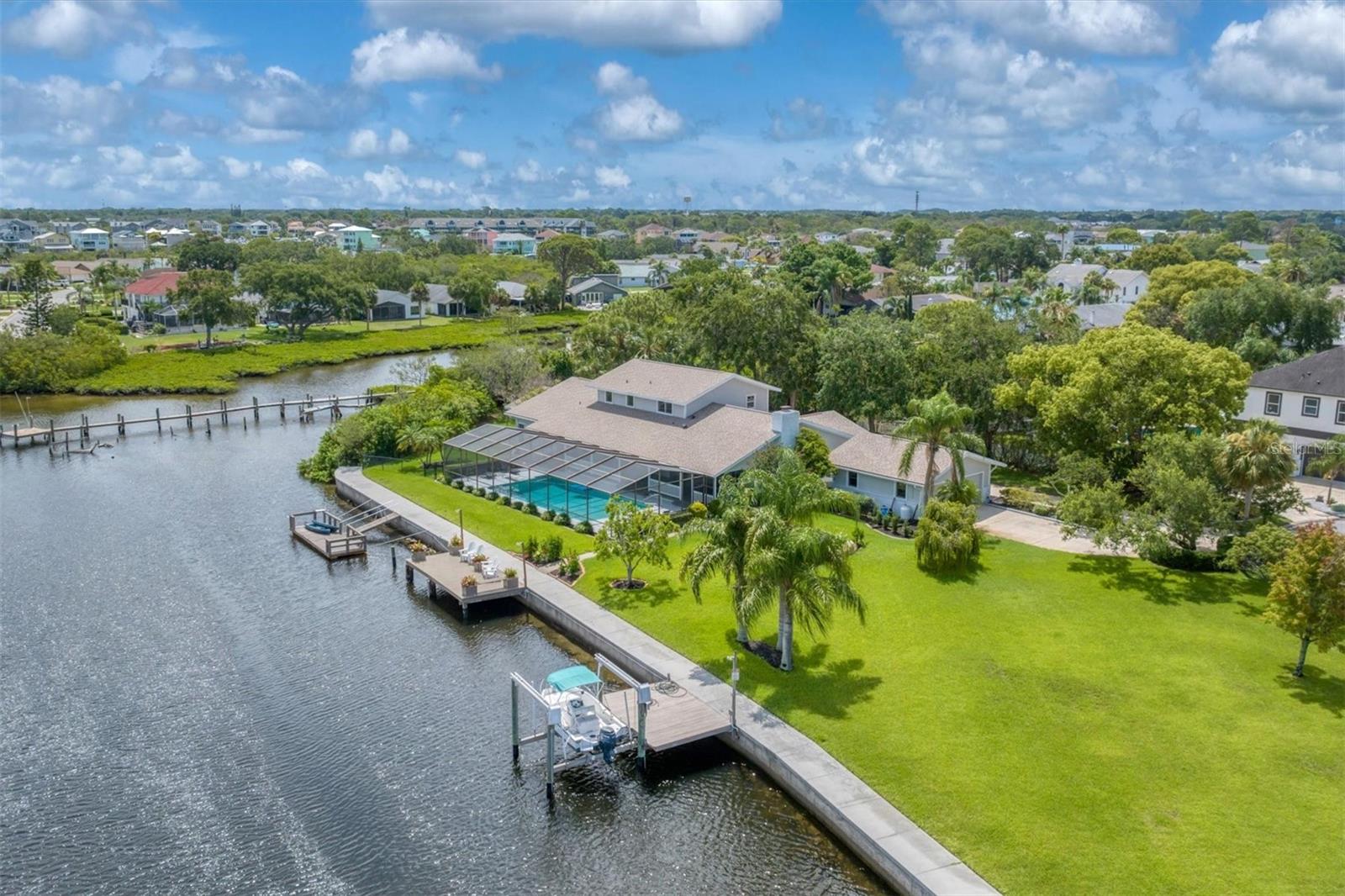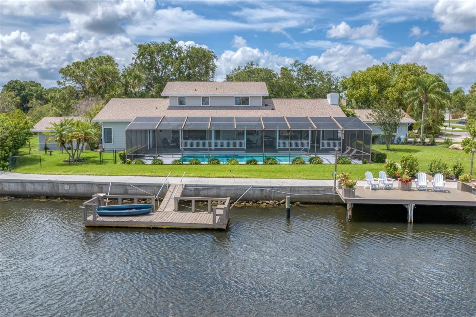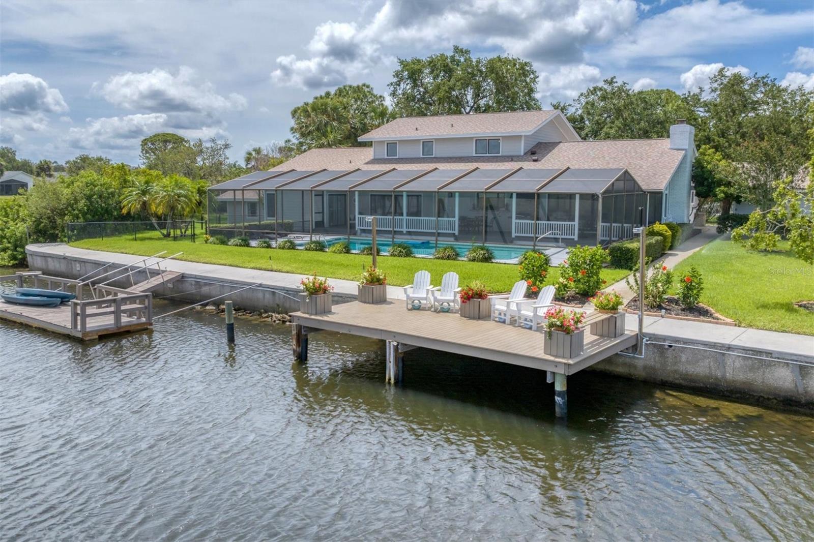Welcome to this rare gem on an exceptionally private oversized .68-acre lot at the end of a cul-de-sac with 130-foot waterfront seawall on a deep-water canal with direct access to the Gulf of Mexico. The property is surrounded by a natural preserve with views of a state protected wildlife sanctuary home to Florida’s magnificent birds, wildlife and abundant marine life, making this one of the most private, peaceful and serene settings on the west coast. This 5-bedroom plus office, 4-bath home has undergone a half million-dollar renovation incorporating coastal sophistication and charm. Most of living space is on the first floor with light oak porcelain plank tile running seamlessly throughout and cloud white walls create an elegant and peaceful beach atmosphere. The spectacular family room has white wood-planked high vaulted ceilings, large gas burning fireplace, expansive 12-foot sliding glass doors that fill the space with abundant tranquil light leading to a covered and screened deck that extends the full length of the home and massive 30K gallon 9’ deep heated pool with diving board, all overlooking the magnificent water vistas beyond. The newly renovated cook’s kitchen has elegant white quartz countertops throughout, a built-in Bosch double oven/microwave, Thermador 36” gas range/oven with convection and internal thermometer, stainless-steel hood, Samsung refrigerator/freezer and oversized deep stainless-steel sink situated at a large window overlooking the amazing waterscape. Lots of beautiful white shaker-style cabinets with pull-out drawers including floor to ceiling pantry cabinets with an oversized center island designed for prep and seating sure to be a gathering center of the home. The picturesque vistas extend to the welcoming entertainment/wet bar area with its wide sliding glass doors that open to the deck and water beyond. There is a wine cooler, mini refrigerator, continuous ice maker and a beautiful quartz countertop bar with ample seating around. Double french doors open to an elegant private office with floor to ceiling built-in cabinets and a large classic bay window for natural light. The master bedroom has a gorgeous new spa-like ensuite bathroom with dual vanities, his & her walk-in closets, water closet, frameless glass shower and sumptuous free-standing soaking tub. Second level has 3 beds/2 bath, one has an ensuite bathroom. This property includes an amazing detached 24’ x 18’ “casita” currently designed in a light and airy coastal vibe to house extended guests with a portable sink, mini refrigerator and coffee maker easily converted to a game room, gym or artist’s enclave. There is also a large detached 2 car garage. The expansive seawall welcomes maritime enthusiasts with a stationary and floating dock for ease loading kayaks for an aquatic adventure. At days end, retreat to the large dockside deck to take in a captivating Gulf Coast sunset while watching dolphins frolic about. Gulf Harbors Woodlands Community has access to tennis facilities, pool and boat ramp with options to join the private Gulf Harbors Beach Club for $200/year with its white sandy beach, covered picnic tables and grilling stations, perfect for large gatherings. There’s also an option to join Gulf Harbors Yacht Club where you can meet new friends, partake in social events, and enjoy the best food and drink in the area. The perfect combination of luxurious privacy and a thriving social life. This Oasis is Florida living at its finest!