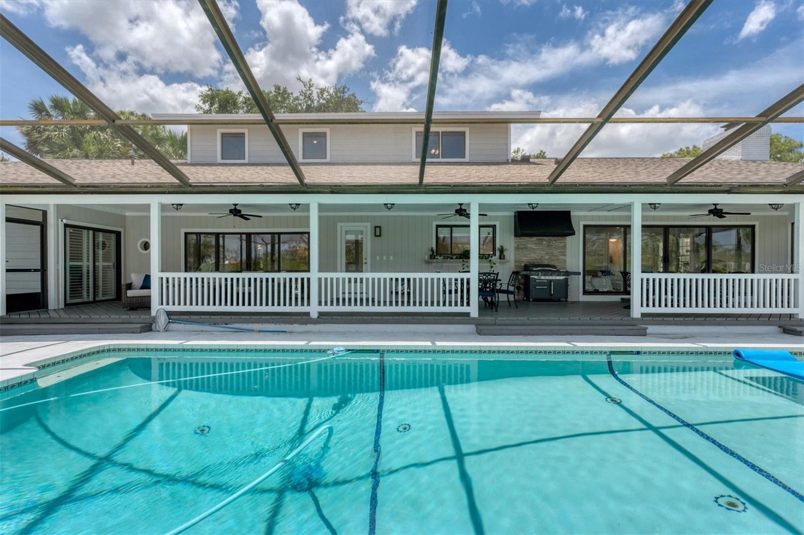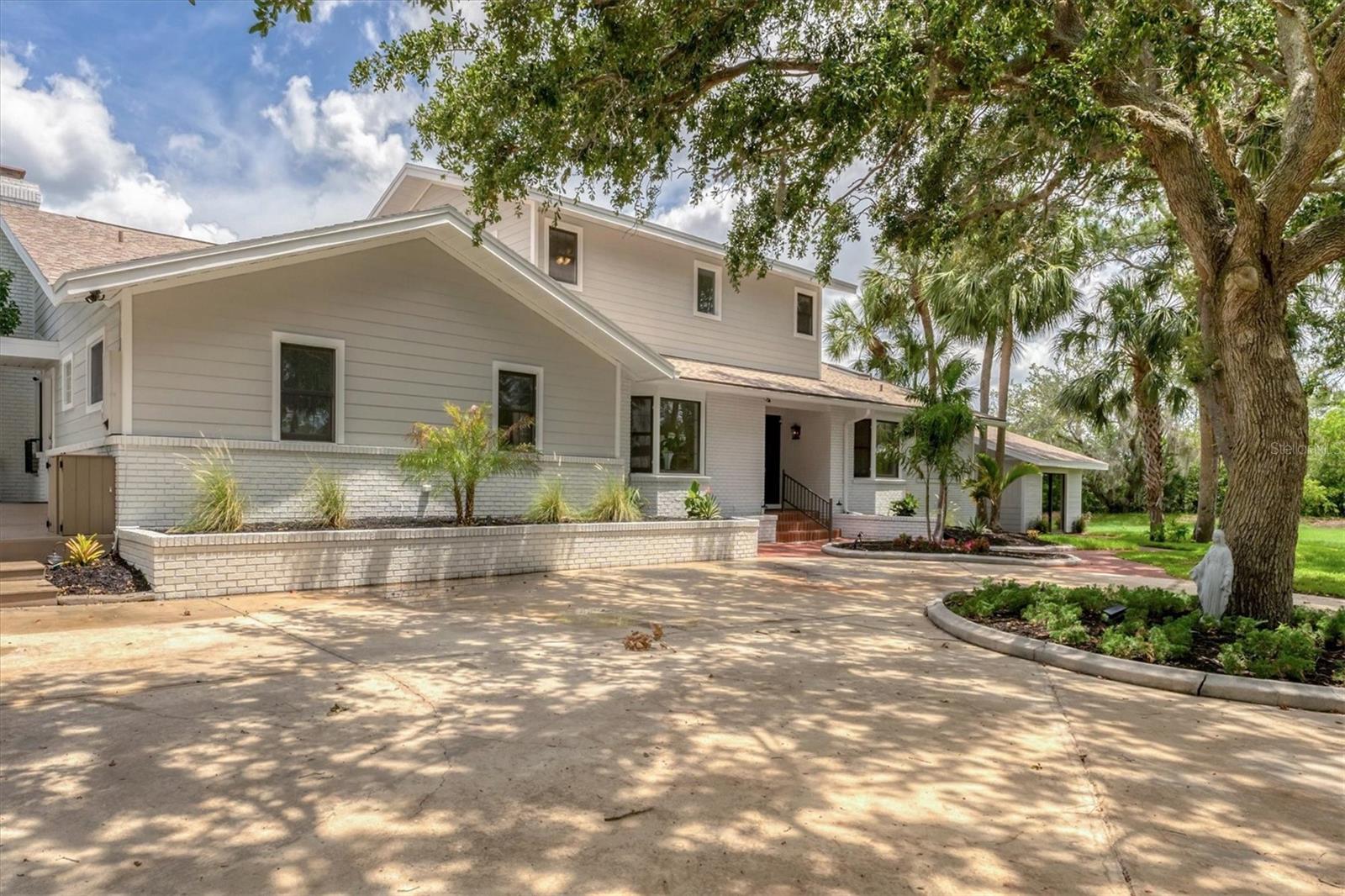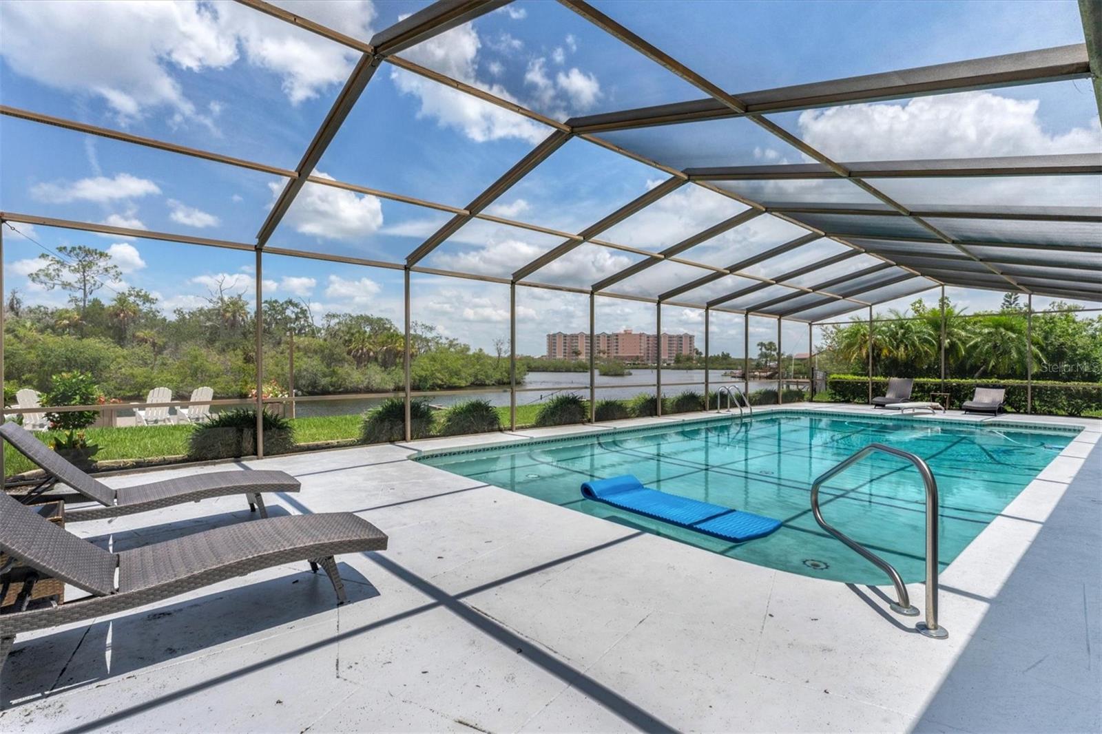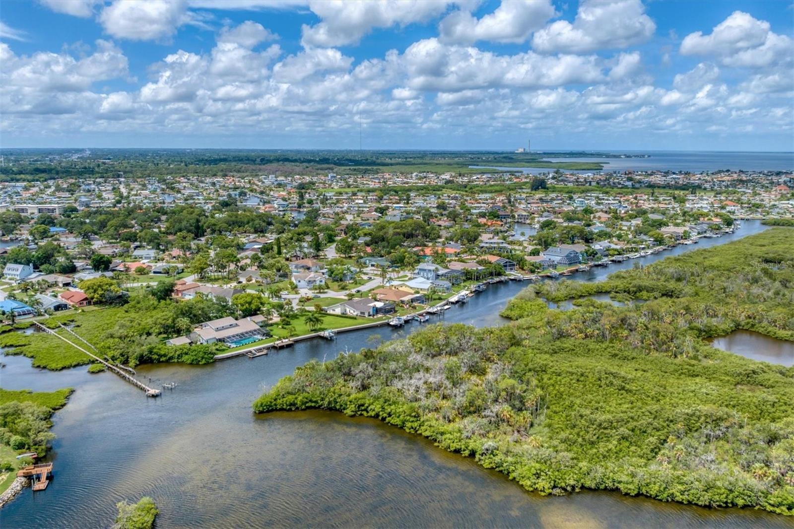 Welcome to this rare gem on an exceptionally private oversized .68-acre lot at the end of a cul-de-sac with 130-foot waterfront seawall on a deep-water canal with direct access to the Gulf of Mexico. The property is surrounded by a natural preserve with views of a state protected wildlife sanctuary home to Florida’s magnificent birds, wildlife and abundant marine life, making this one of the most private, peaceful and serene settings on the west coast. This 5-bedroom plus office, 4-bath home has undergone a half million-dollar renovation incorporating coastal sophistication and charm. Most of living space is on the first floor with light oak porcelain plank tile running seamlessly throughout and cloud white walls create an elegant and peaceful beach atmosphere. The spectacular family room has white wood-planked high vaulted ceilings, large gas burning fireplace, expansive 12-foot sliding glass doors that fill the space with abundant tranquil light leading to a covered and screened deck that extends the full length of the home and massive 30K gallon 9’ deep heated pool with diving board, all overlooking the magnificent water vistas beyond. The newly renovated cook’s kitchen has elegant white quartz countertops throughout, a built-in Bosch double oven/microwave, Thermador 36” gas range/oven with convection and internal thermometer, stainless-steel hood, Samsung refrigerator/freezer and oversized deep stainless-steel sink situated at a large window overlooking the amazing waterscape. Lots of beautiful white shaker-style cabinets with pull-out drawers including floor to ceiling pantry cabinets with an oversized center island designed for prep and seating sure to be a gathering center of the home. The picturesque vistas extend to the welcoming entertainment/wet bar area with its wide sliding glass doors that open to the deck and water beyond. There is a wine cooler, mini refrigerator, continuous ice maker and a beautiful quartz countertop bar with ample seating around. Double french doors open to an elegant private office with floor to ceiling built-in cabinets and a large classic bay window for natural light. The master bedroom has a gorgeous new spa-like ensuite bathroom with dual vanities, his & her walk-in closets, water closet, frameless glass shower and sumptuous free-standing soaking tub. Second level has 3 beds/2 bath, one has an ensuite bathroom. This property includes an amazing detached 24’ x 18’ “casita” currently designed in a light and airy coastal vibe to house extended guests with a portable sink, mini refrigerator and coffee maker easily converted to a game room, gym or artist’s enclave. There is also a large detached 2 car garage. The expansive seawall welcomes maritime enthusiasts with a stationary and floating dock for ease loading kayaks for an aquatic adventure. At days end, retreat to the large dockside deck to take in a captivating Gulf Coast sunset while watching dolphins frolic about. Gulf Harbors Woodlands Community has access to tennis facilities, pool and boat ramp with options to join the private Gulf Harbors Beach Club for $200/year with its white sandy beach, covered picnic tables and grilling stations, perfect for large gatherings. There’s also an option to join Gulf Harbors Yacht Club where you can meet new friends, partake in social events, and enjoy the best food and drink in the area. The perfect combination of luxurious privacy and a thriving social life. This Oasis is Florida living at its finest!