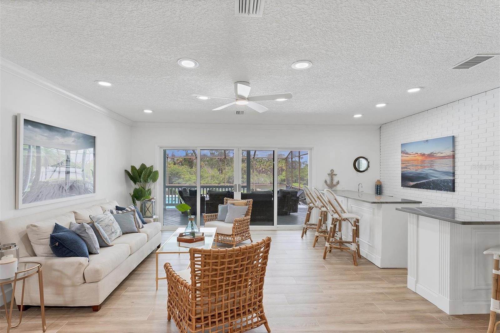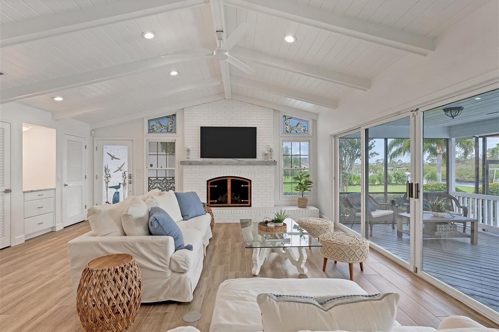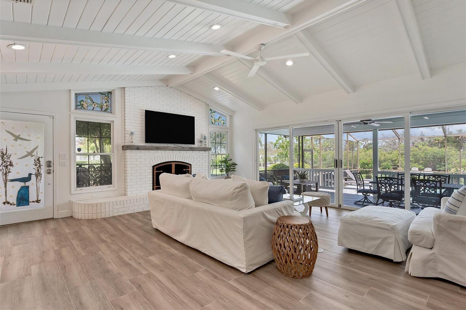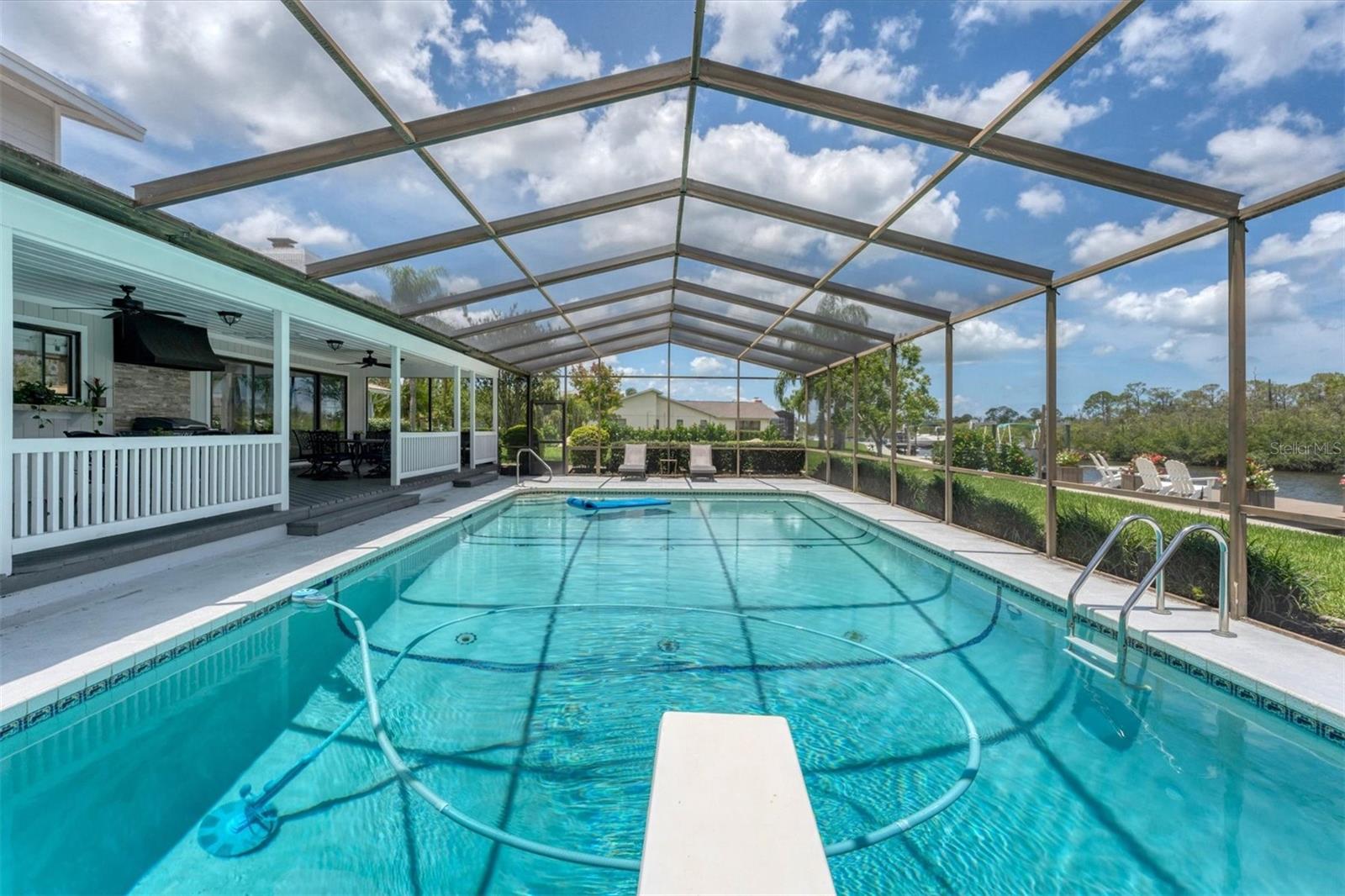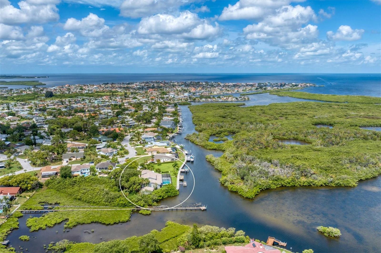 Welcome to this rare gem on an exceptionally private oversized .68-acre lot at the end of a cul-de-sac with 130-foot waterfront seawall on a deep-water canal with direct access to the Gulf of Mexico. The property is surrounded by a natural preserve with views of a state protected wildlife sanctuary home to Florida’s magnificent birds, wildlife and abundant marine life, making this one of the most private, peaceful and serene settings on the west coast. This 5-bedroom plus office, 4-bath home has undergone a half million-dollar renovation incorporating coastal sophistication and charm. Most of living space is on the first floor with light oak porcelain plank tile running seamlessly throughout and cloud white walls create an elegant and peaceful beach atmosphere. The spectacular family room has white wood-planked high vaulted ceilings, large gas burning fireplace, expansive 12-foot sliding glass doors that fill the space with abundant tranquil light leading to a covered and screened deck that extends the full length of the home and massive 30K gallon 9’ deep heated pool with diving board, all overlooking the magnificent water vistas beyond. The newly renovated cook’s kitchen has elegant white quartz countertops throughout, a built-in Bosch double oven/microwave, Thermador 36” gas range/oven with convection and internal thermometer, stainless-steel hood, Samsung refrigerator/freezer and oversized deep stainless-steel sink situated at a large window overlooking the amazing waterscape. Lots of beautiful white shaker-style cabinets with pull-out drawers including floor to ceiling pantry cabinets with an oversized center island designed for prep and seating sure to be a gathering center of the home. The picturesque vistas extend to the welcoming entertainment/wet bar area with its wide sliding glass doors that open to the deck and water beyond. There is a wine cooler, mini refrigerator, continuous ice maker and a beautiful quartz countertop bar with ample seating around. Double french doors open to an elegant private office with floor to ceiling built-in cabinets and a large classic bay window for natural light. The master bedroom has a gorgeous new spa-like ensuite bathroom with dual vanities, his & her walk-in closets, water closet, frameless glass shower and sumptuous free-standing soaking tub. Second level has 3 beds/2 bath, one has an ensuite bathroom. This property includes an amazing detached 24’ x 18’ “casita” currently designed in a light and airy coastal vibe to house extended guests with a portable sink, mini refrigerator and coffee maker easily converted to a game room, gym or artist’s enclave. There is also a large detached 2 car garage. The expansive seawall welcomes maritime enthusiasts with a stationary and floating dock for ease loading kayaks for an aquatic adventure. At days end, retreat to the large dockside deck to take in a captivating Gulf Coast sunset while watching dolphins frolic about. Gulf Harbors Woodlands Community has access to tennis facilities, pool and boat ramp with options to join the private Gulf Harbors Beach Club for $200/year with its white sandy beach, covered picnic tables and grilling stations, perfect for large gatherings. There’s also an option to join Gulf Harbors Yacht Club where you can meet new friends, partake in social events, and enjoy the best food and drink in the area. The perfect combination of luxurious privacy and a thriving social life. This Oasis is Florida living at its finest!