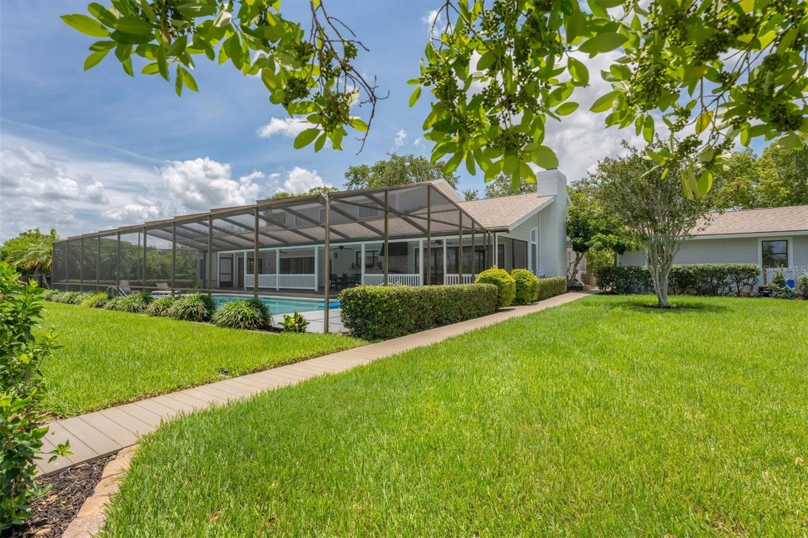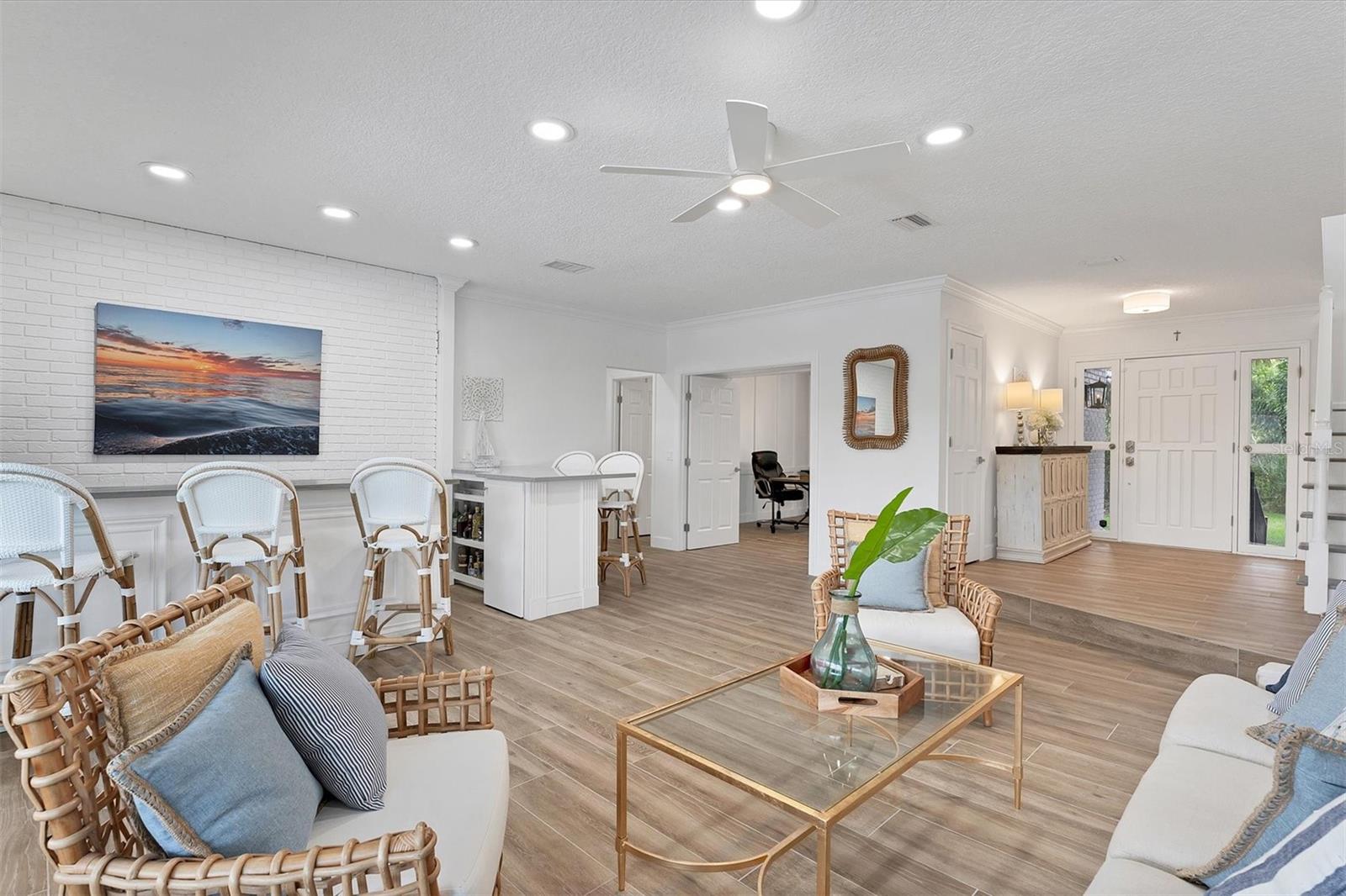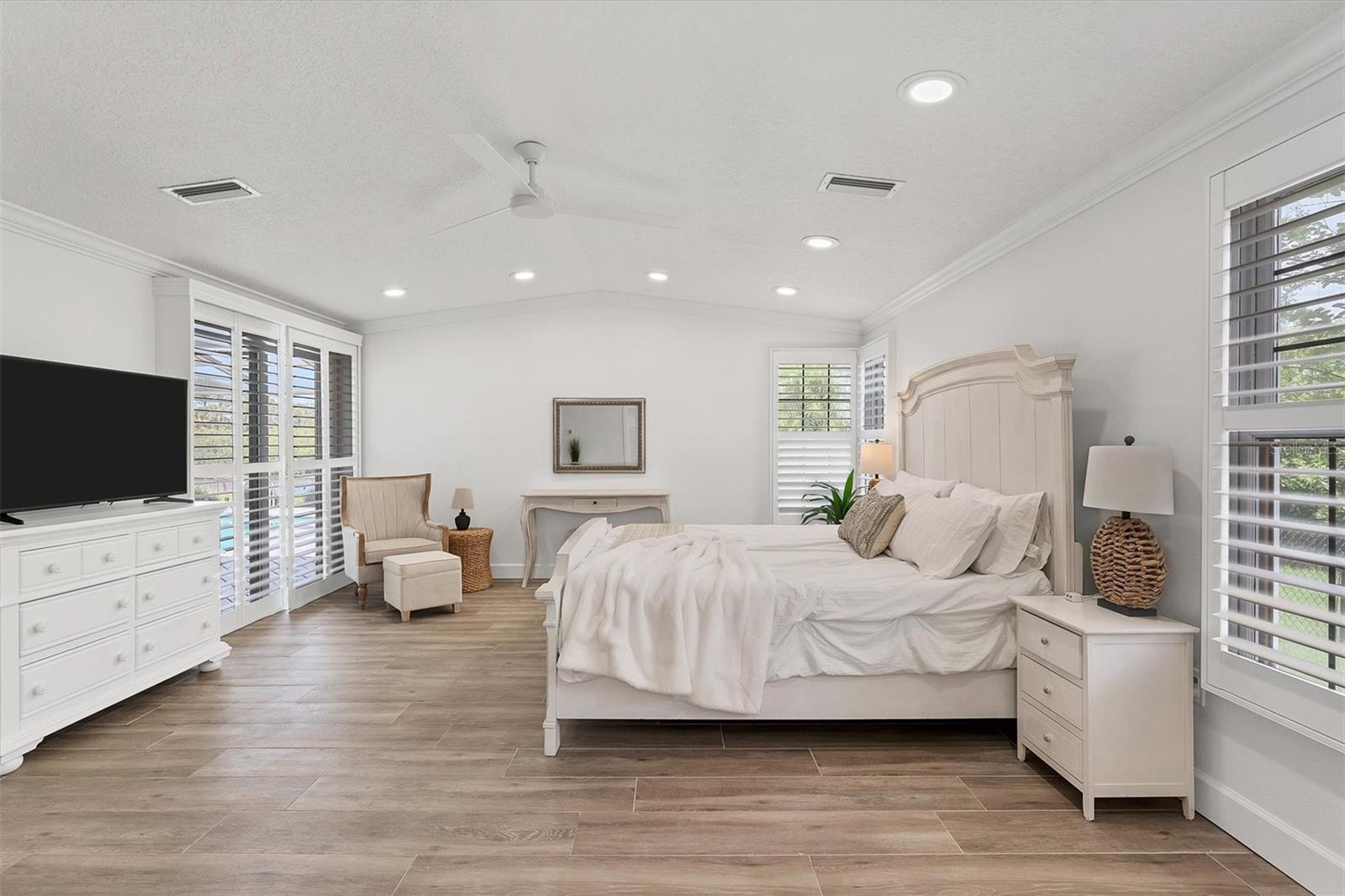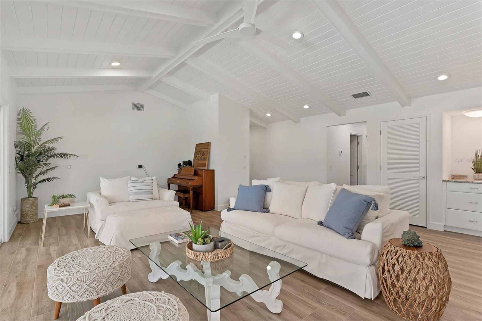 Welcome to this rare gem on an exceptionally private oversized .68-acre lot at the end of a cul-de-sac with 130-foot waterfront seawall on a deep-water canal with direct access to the Gulf of Mexico. The property is surrounded by a natural preserve with views of a state protected wildlife sanctuary home to Florida’s magnificent birds, wildlife and abundant marine life, making this one of the most private, peaceful and serene settings on the west coast. This 5-bedroom plus office, 4-bath home has undergone a half million-dollar renovation incorporating coastal sophistication and charm. Most of living space is on the first floor with light oak porcelain plank tile running seamlessly throughout and cloud white walls create an elegant and peaceful beach atmosphere. The spectacular family room has white wood-planked high vaulted ceilings, large gas burning fireplace, expansive 12-foot sliding glass doors that fill the space with abundant tranquil light leading to a covered and screened deck that extends the full length of the home and massive 30K gallon 9’ deep heated pool with diving board, all overlooking the magnificent water vistas beyond. The newly renovated cook’s kitchen has elegant white quartz countertops throughout, a built-in Bosch double oven/microwave, Thermador 36” gas range/oven with convection and internal thermometer, stainless-steel hood, Samsung refrigerator/freezer and oversized deep stainless-steel sink situated at a large window overlooking the amazing waterscape. Lots of beautiful white shaker-style cabinets with pull-out drawers including floor to ceiling pantry cabinets with an oversized center island designed for prep and seating sure to be a gathering center of the home. The picturesque vistas extend to the welcoming entertainment/wet bar area with its wide sliding glass doors that open to the deck and water beyond. There is a wine cooler, mini refrigerator, continuous ice maker and a beautiful quartz countertop bar with ample seating around. Double french doors open to an elegant private office with floor to ceiling built-in cabinets and a large classic bay window for natural light. The master bedroom has a gorgeous new spa-like ensuite bathroom with dual vanities, his & her walk-in closets, water closet, frameless glass shower and sumptuous free-standing soaking tub. Second level has 3 beds/2 bath, one has an ensuite bathroom. This property includes an amazing detached 24’ x 18’ “casita” currently designed in a light and airy coastal vibe to house extended guests with a portable sink, mini refrigerator and coffee maker easily converted to a game room, gym or artist’s enclave. There is also a large detached 2 car garage. The expansive seawall welcomes maritime enthusiasts with a stationary and floating dock for ease loading kayaks for an aquatic adventure. At days end, retreat to the large dockside deck to take in a captivating Gulf Coast sunset while watching dolphins frolic about. Gulf Harbors Woodlands Community has access to tennis facilities, pool and boat ramp with options to join the private Gulf Harbors Beach Club for $200/year with its white sandy beach, covered picnic tables and grilling stations, perfect for large gatherings. There’s also an option to join Gulf Harbors Yacht Club where you can meet new friends, partake in social events, and enjoy the best food and drink in the area. The perfect combination of luxurious privacy and a thriving social life. This Oasis is Florida living at its finest!